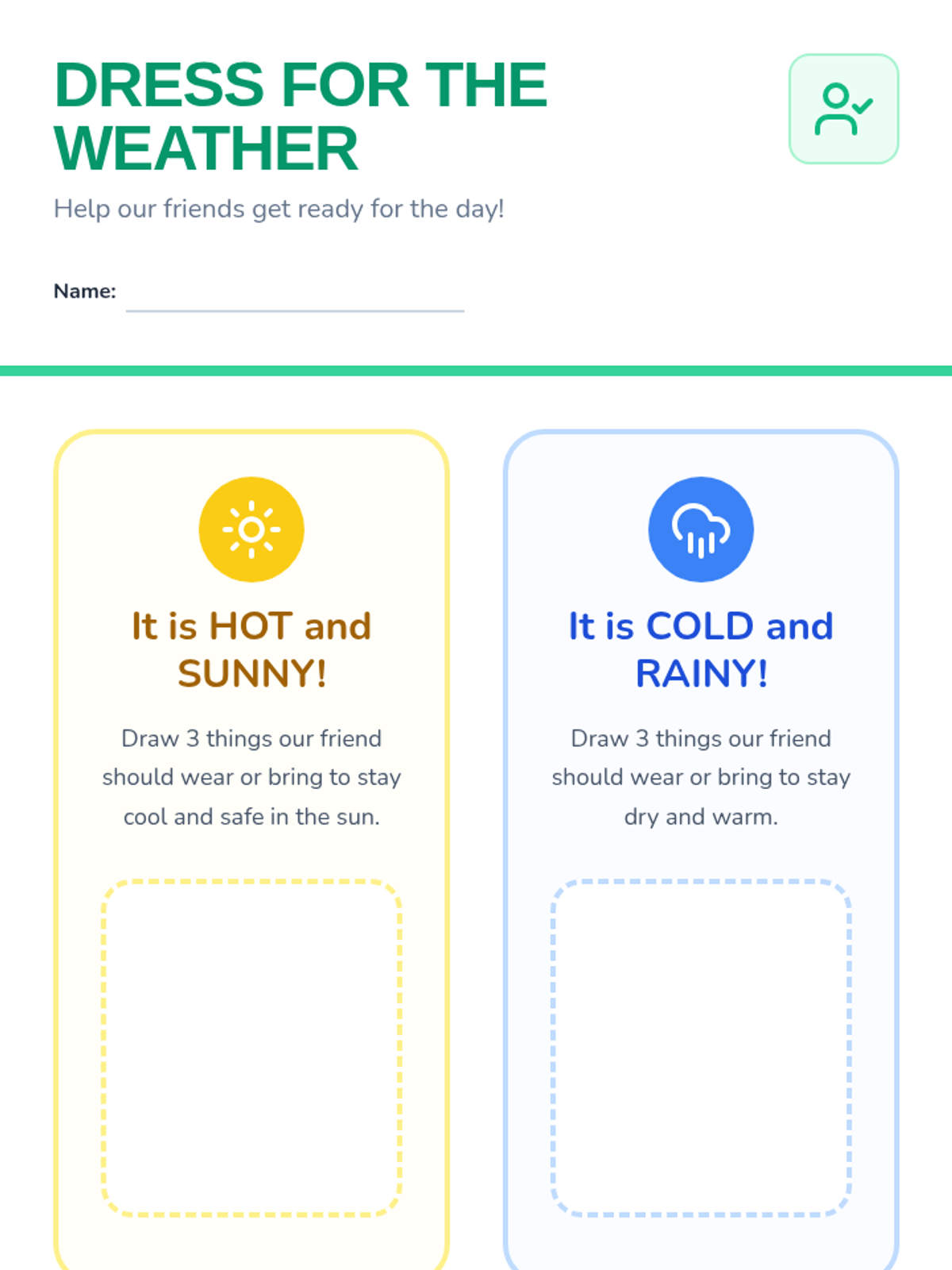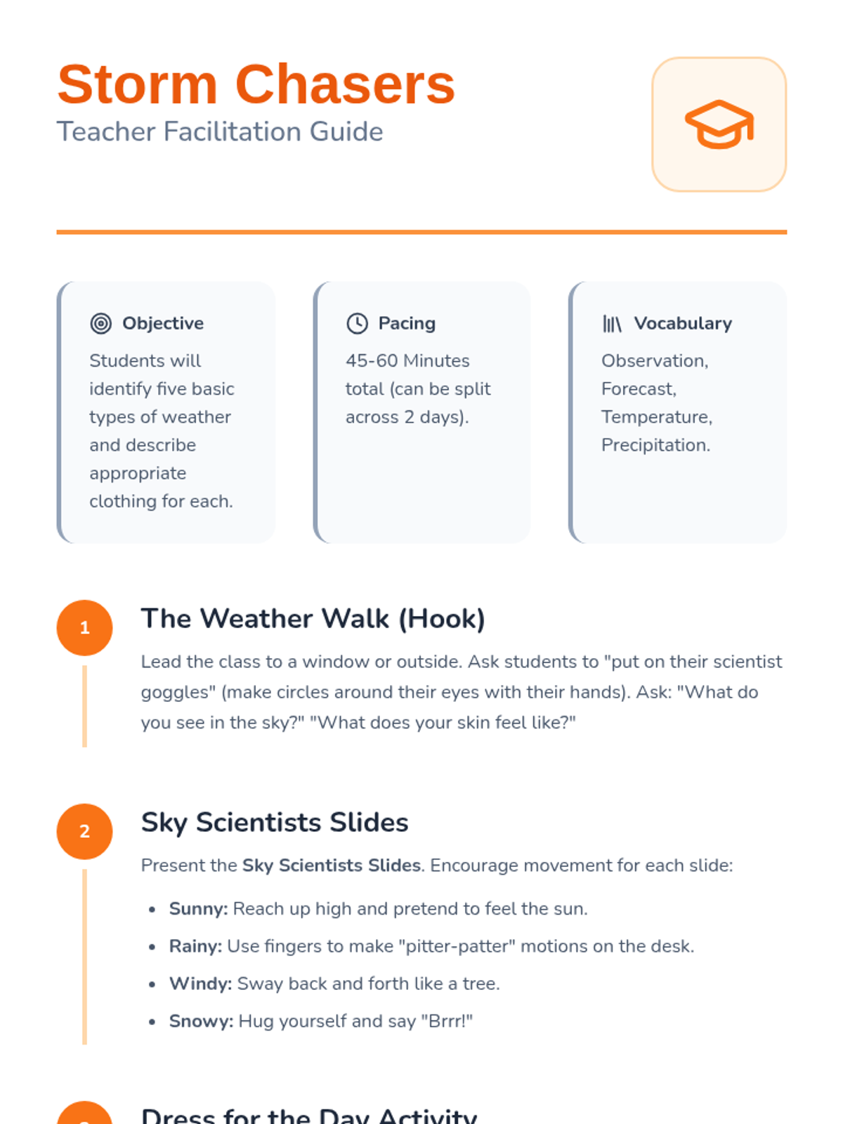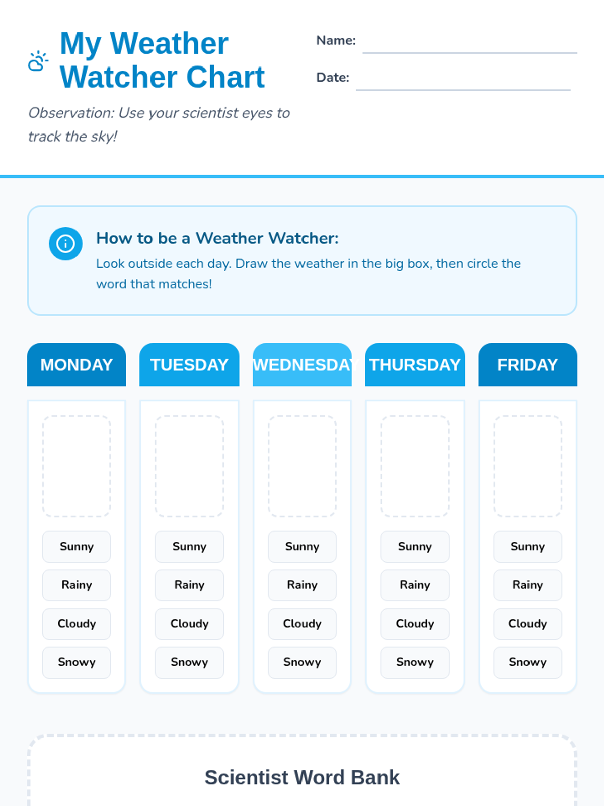 A vibrant introduction to weather patterns for Kindergarteners, focusing on observation and daily tracking. Students explore different types of weather through visual aids, movement, and a weekly weather journal.