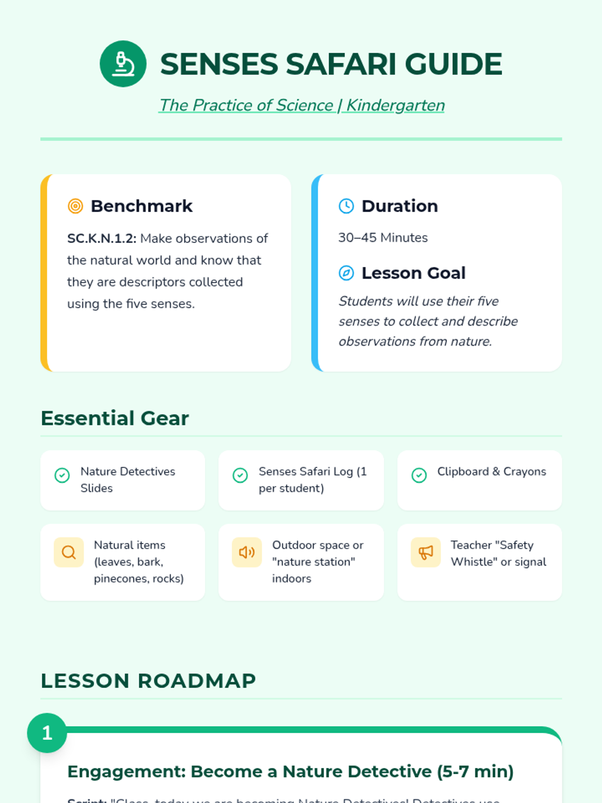 An inquiry-based science lesson for kindergarten students to explore the natural world using their five senses, aligned with benchmark SC.K.N.1.2. Students will act as 'Nature Detectives' to observe and describe their environment.