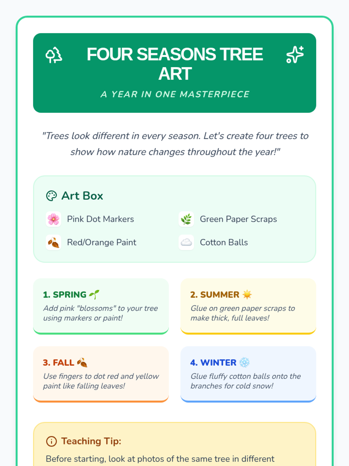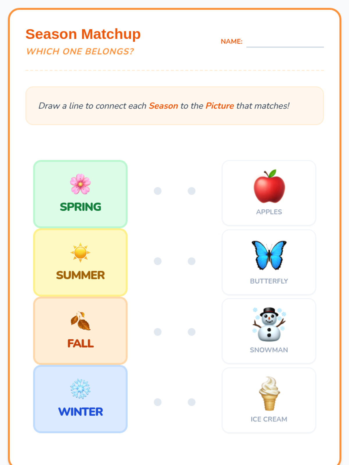 Synthesizes weather patterns into the cycle of the four seasons. Students will learn to distinguish Summer, Fall, Winter, and Spring through visual changes in nature and a sorting activity.