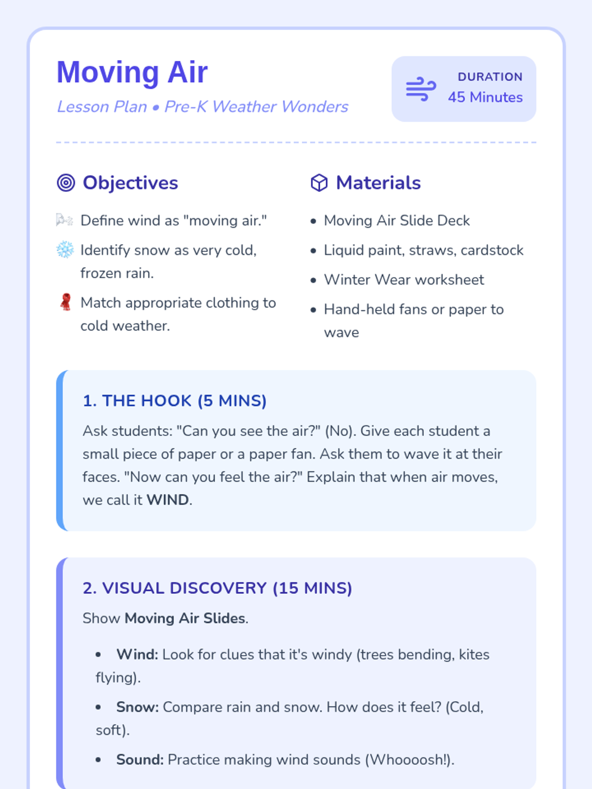 Explores how air moves (wind) and introduces cold weather patterns (snow) through creative 'blow painting' and seasonal clothing sorting.