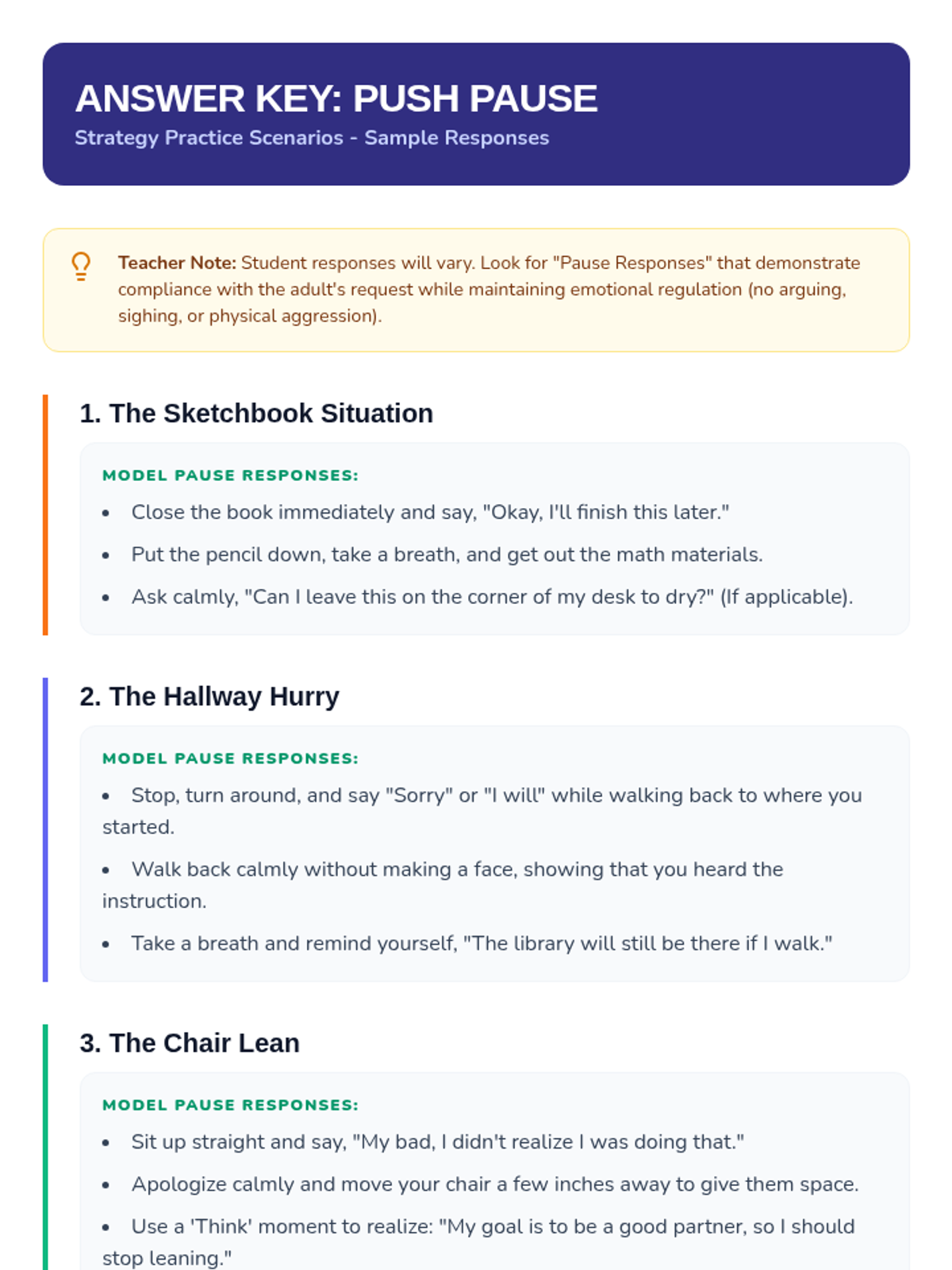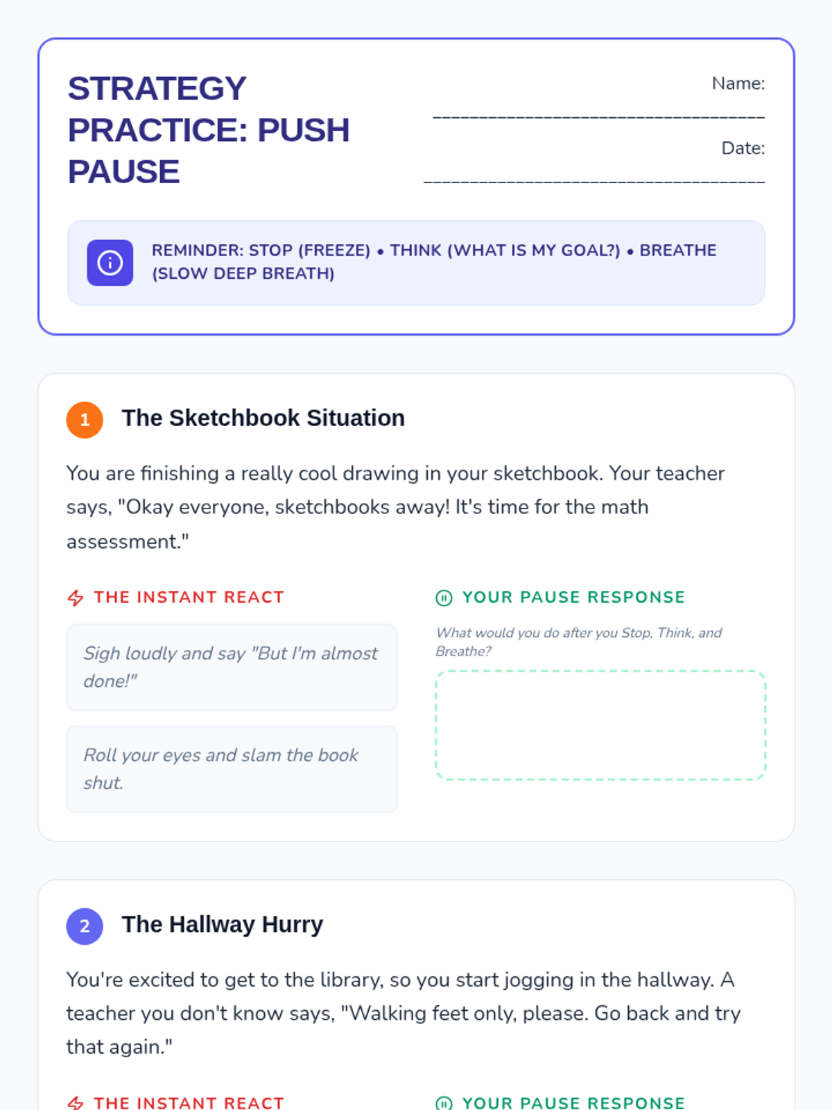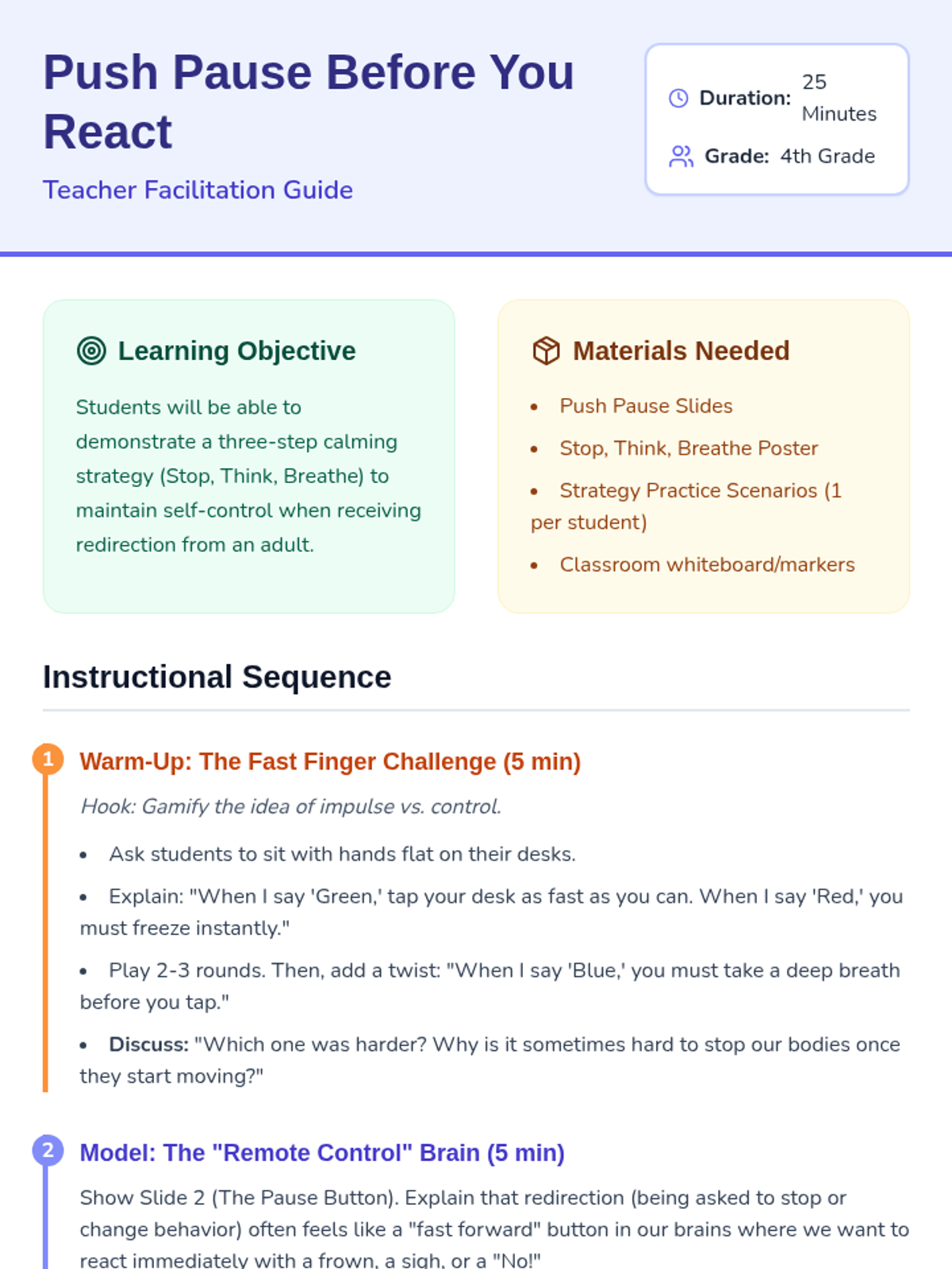 A 25-minute Social-Emotional Learning lesson for 4th graders focused on emotional regulation and impulse control when receiving redirection. The lesson uses a 'Pause Button' metaphor to teach the Stop, Think, Breathe strategy.