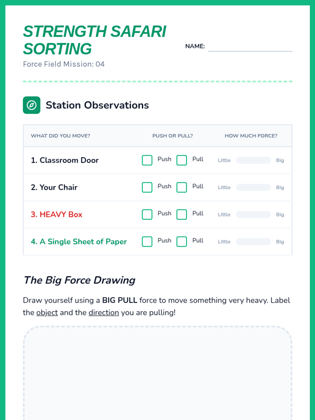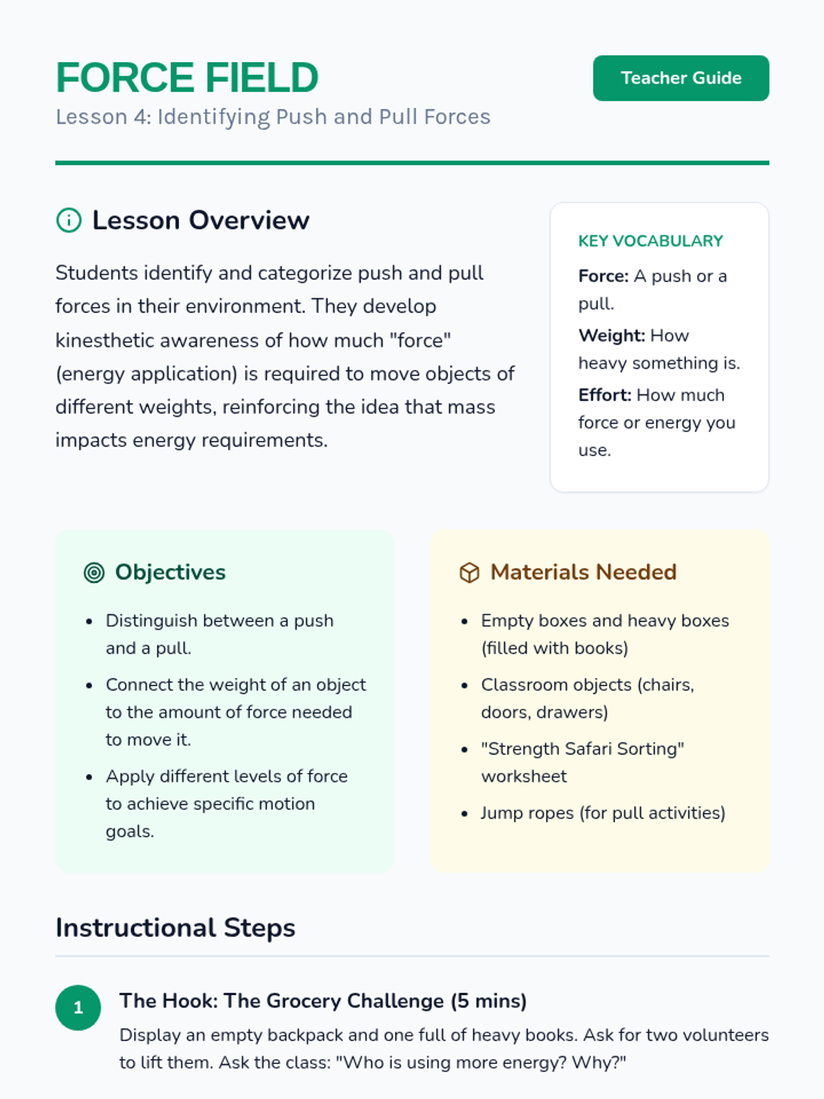 Students explore push and pull forces and how the weight of an object influences the energy needed to move it.