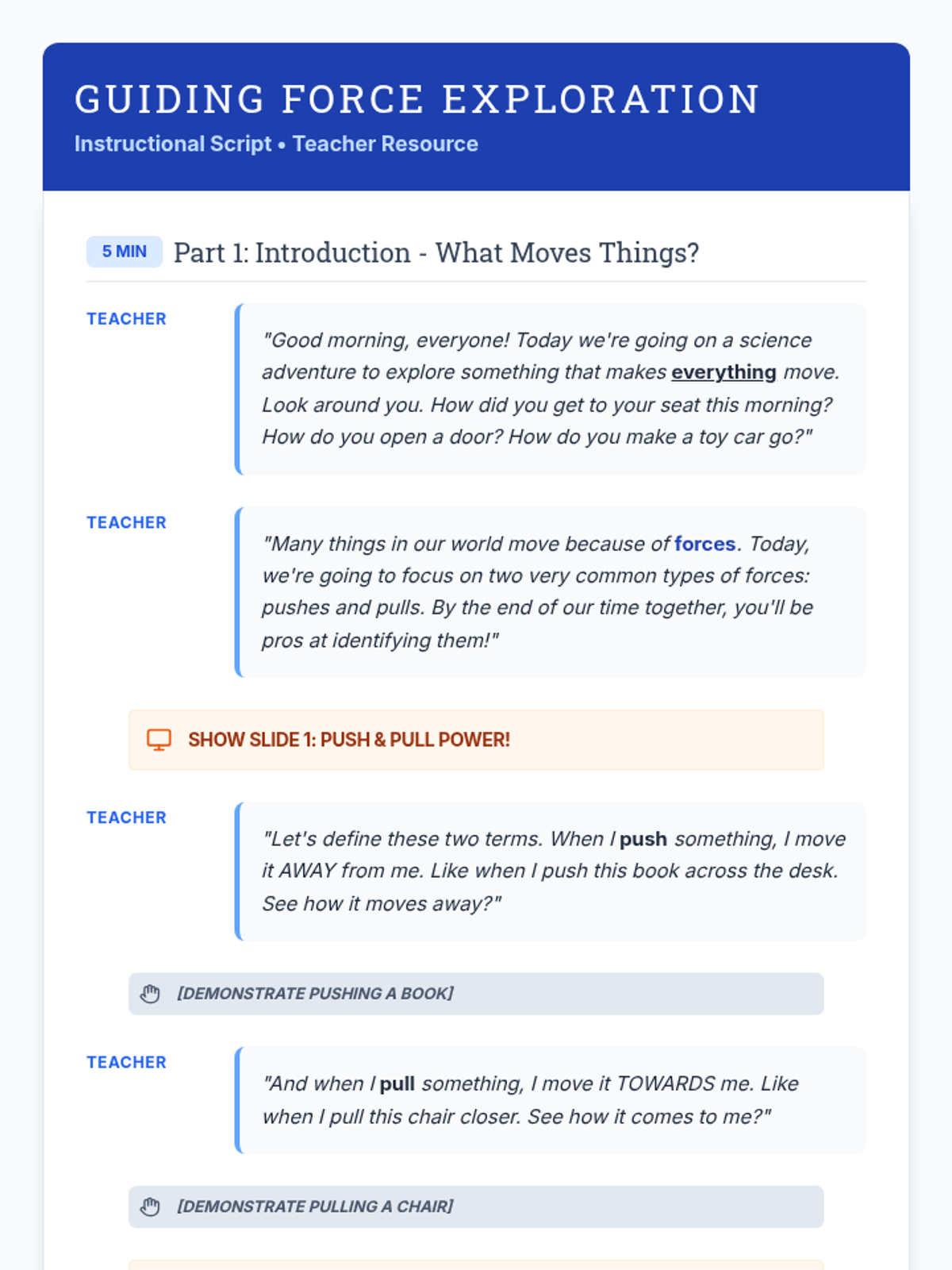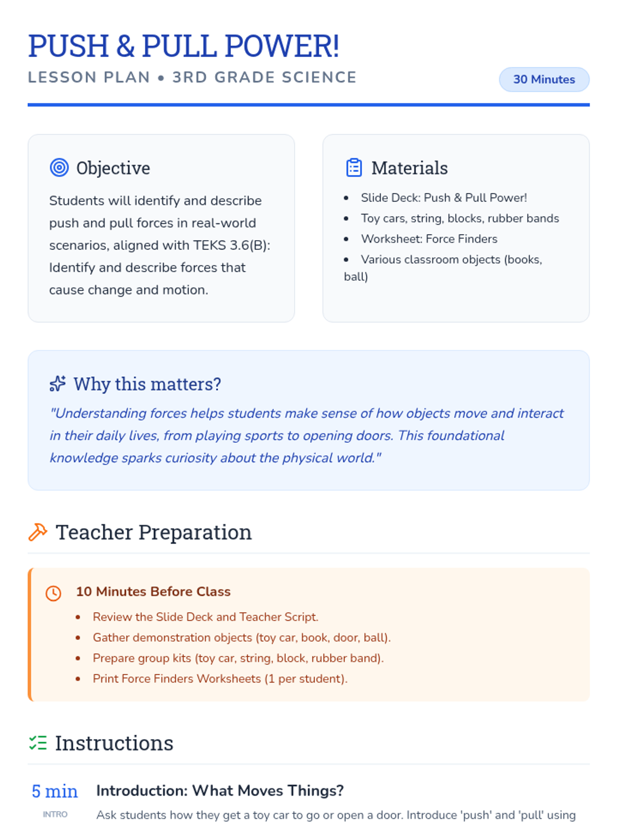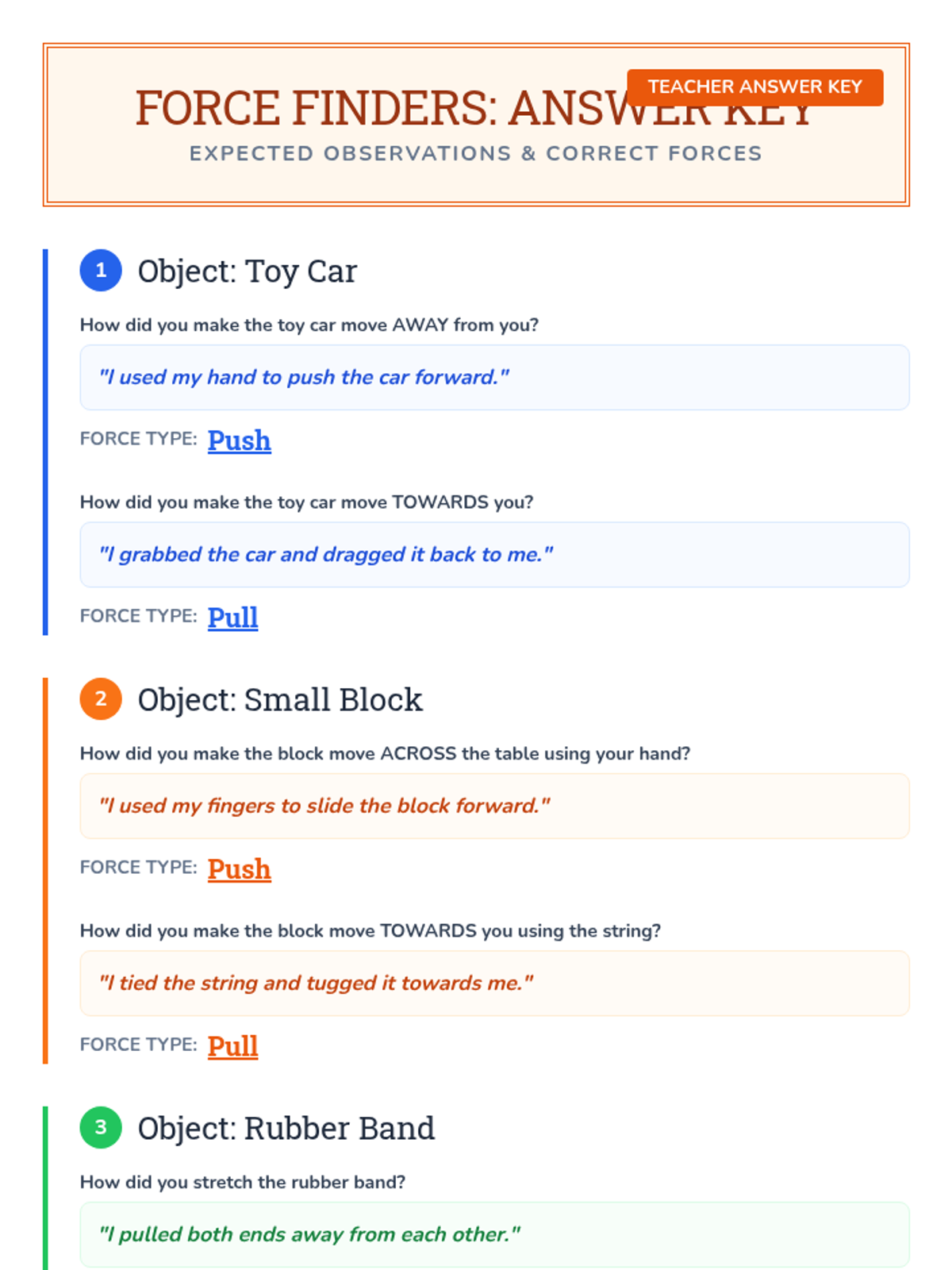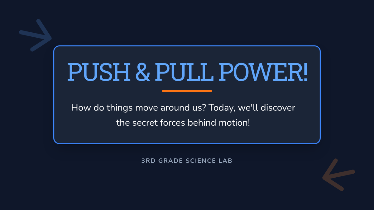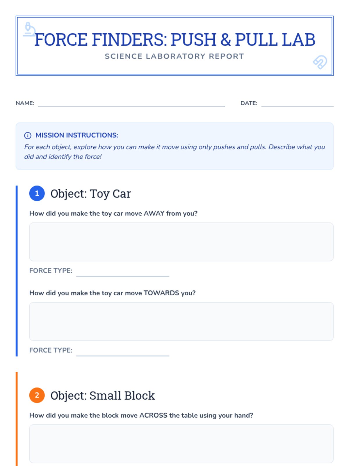 A 30-minute hands-on lab where 3rd-grade students explore push and pull forces using toy cars, blocks, and rubber bands to understand how objects move.