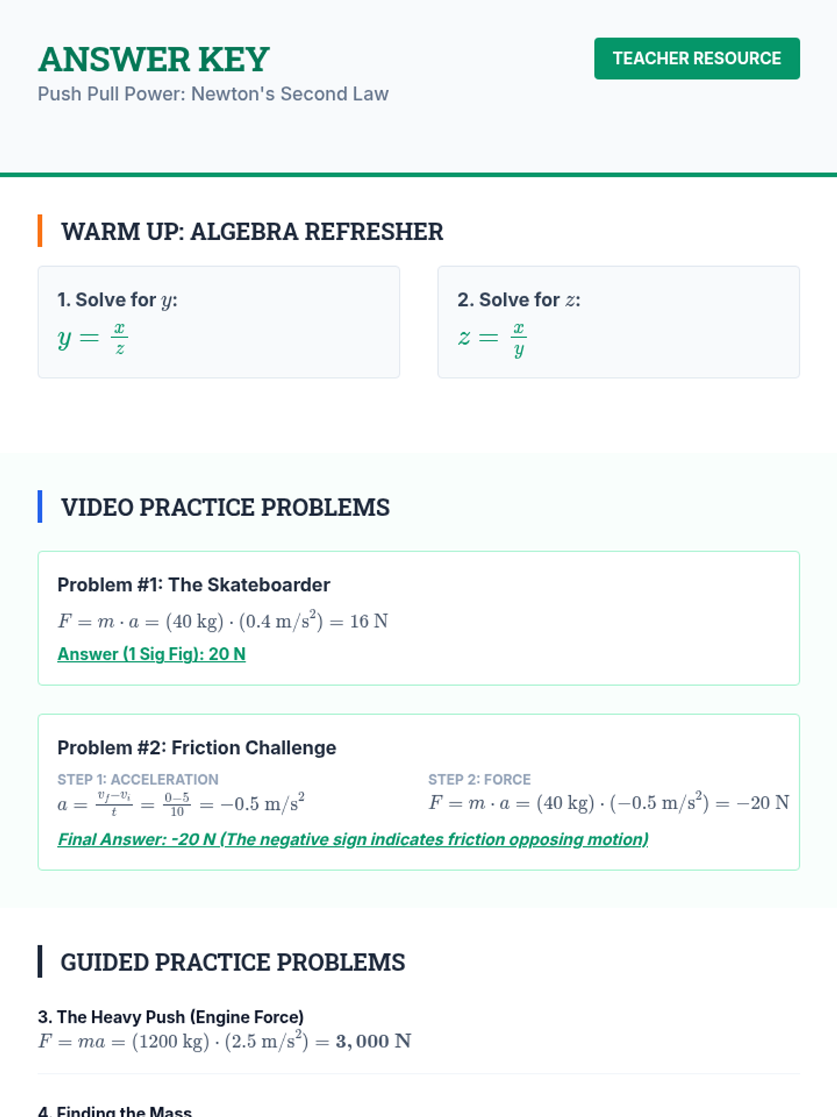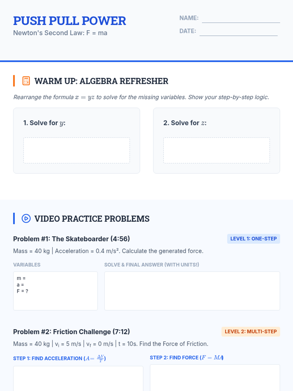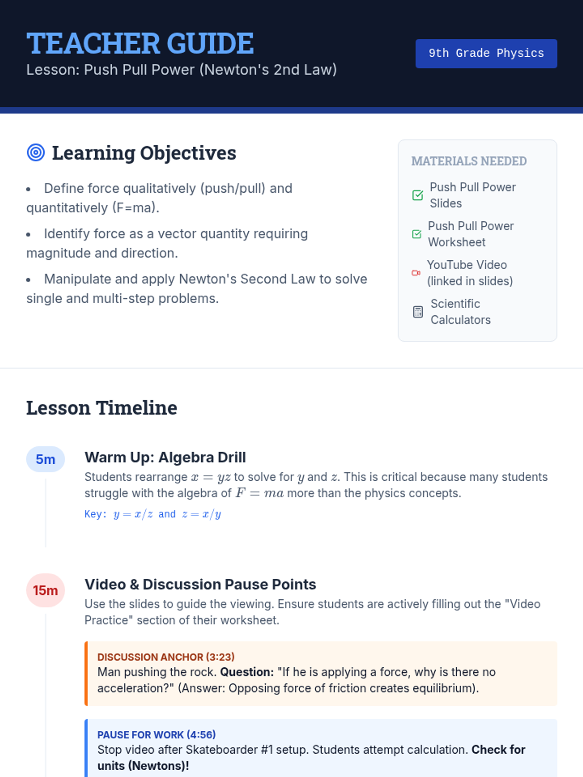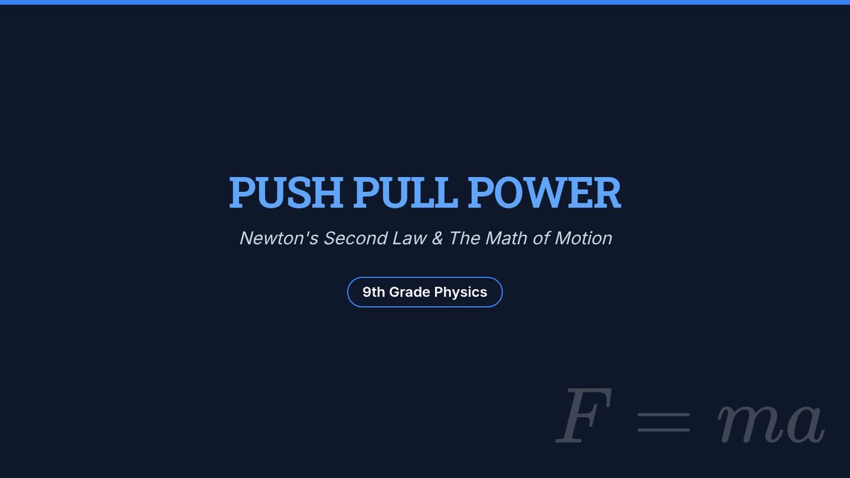A 9th-grade physics lesson focused on Newton's Second Law. Students will explore the definition of force, its vector nature, and apply the F=ma formula to solve one-step and multi-step problems involving acceleration.