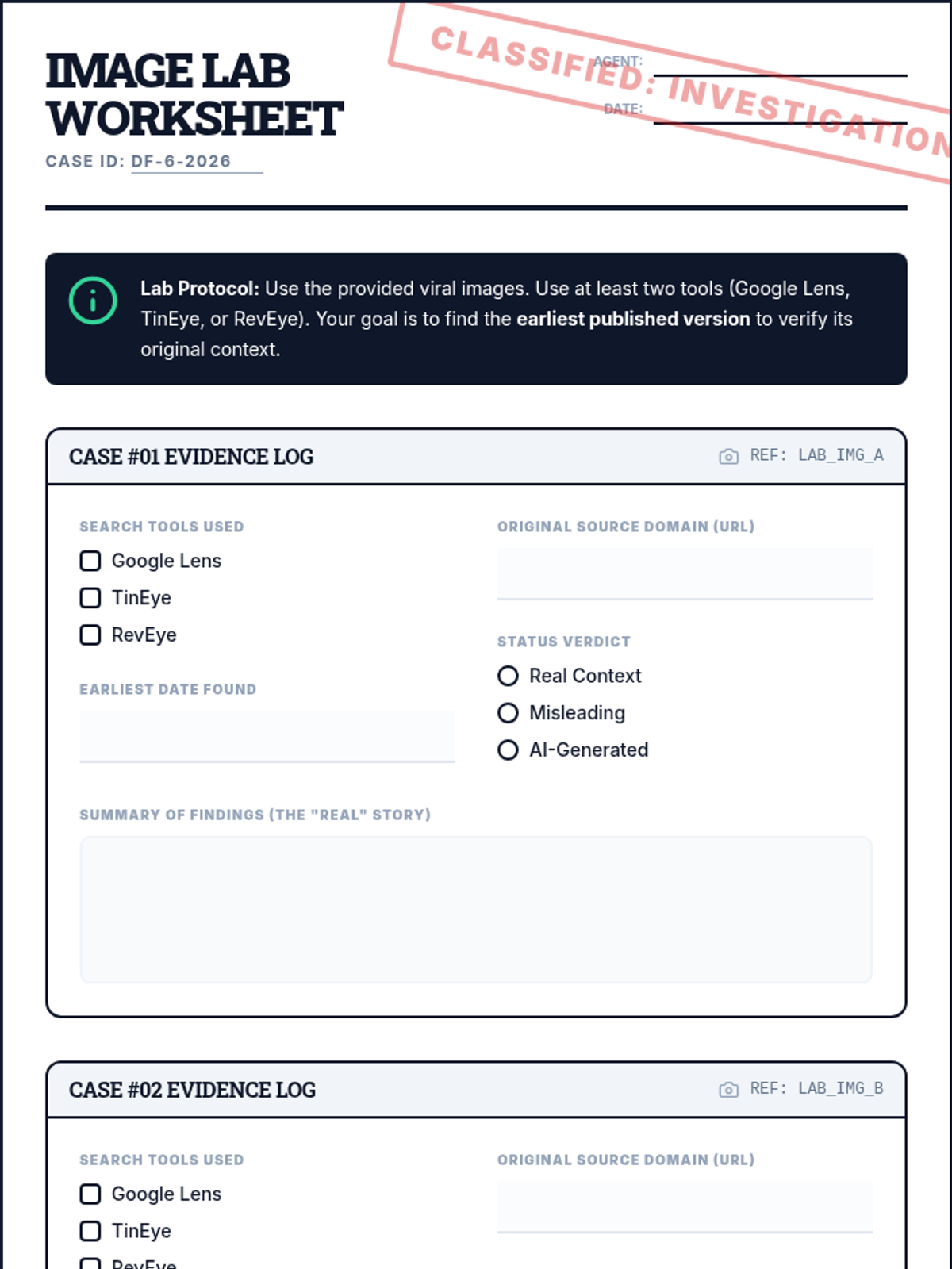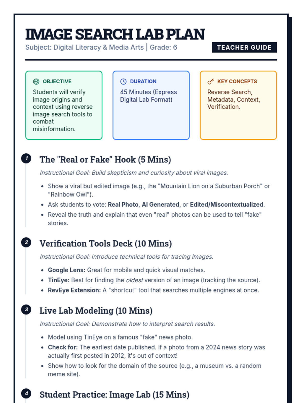 A 45-minute digital forensics lesson where 6th-grade students learn to use reverse image search tools to verify the authenticity and context of viral images. Students act as 'Image Detectives' to uncover the true origins of misleading digital media.