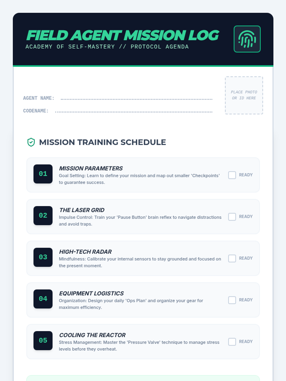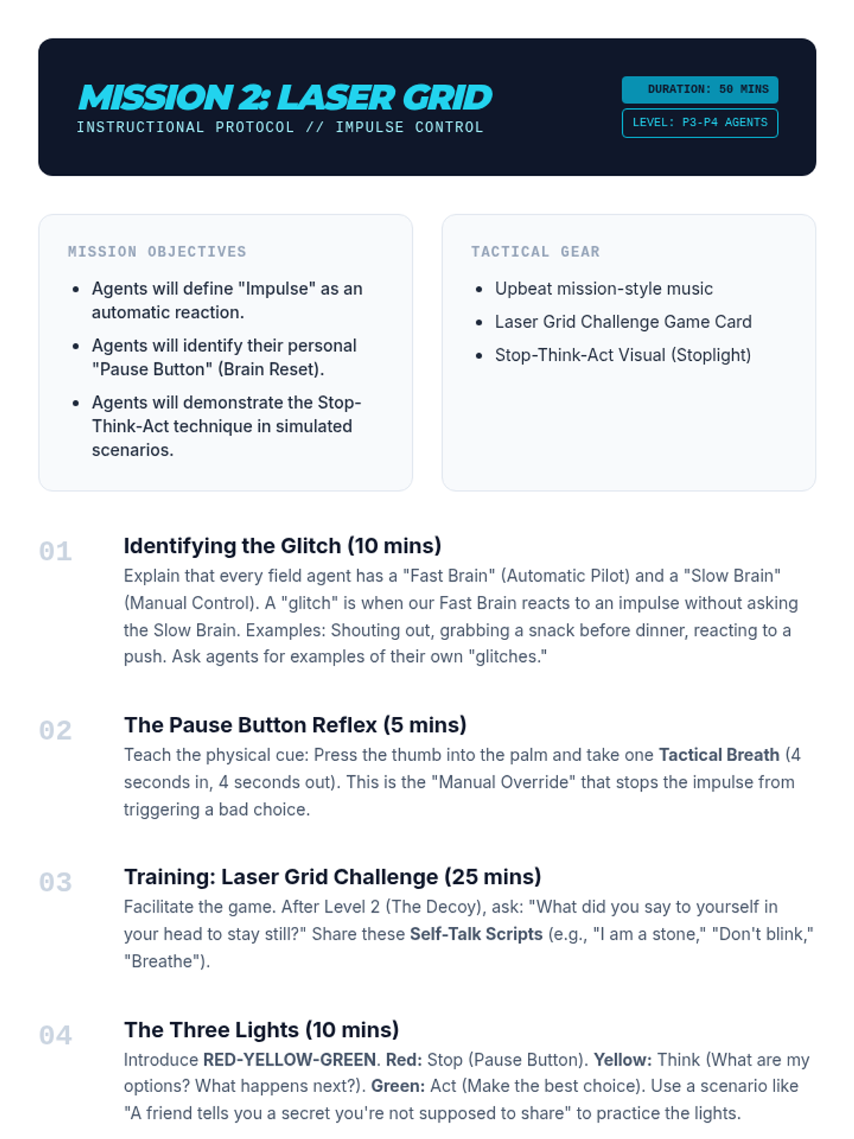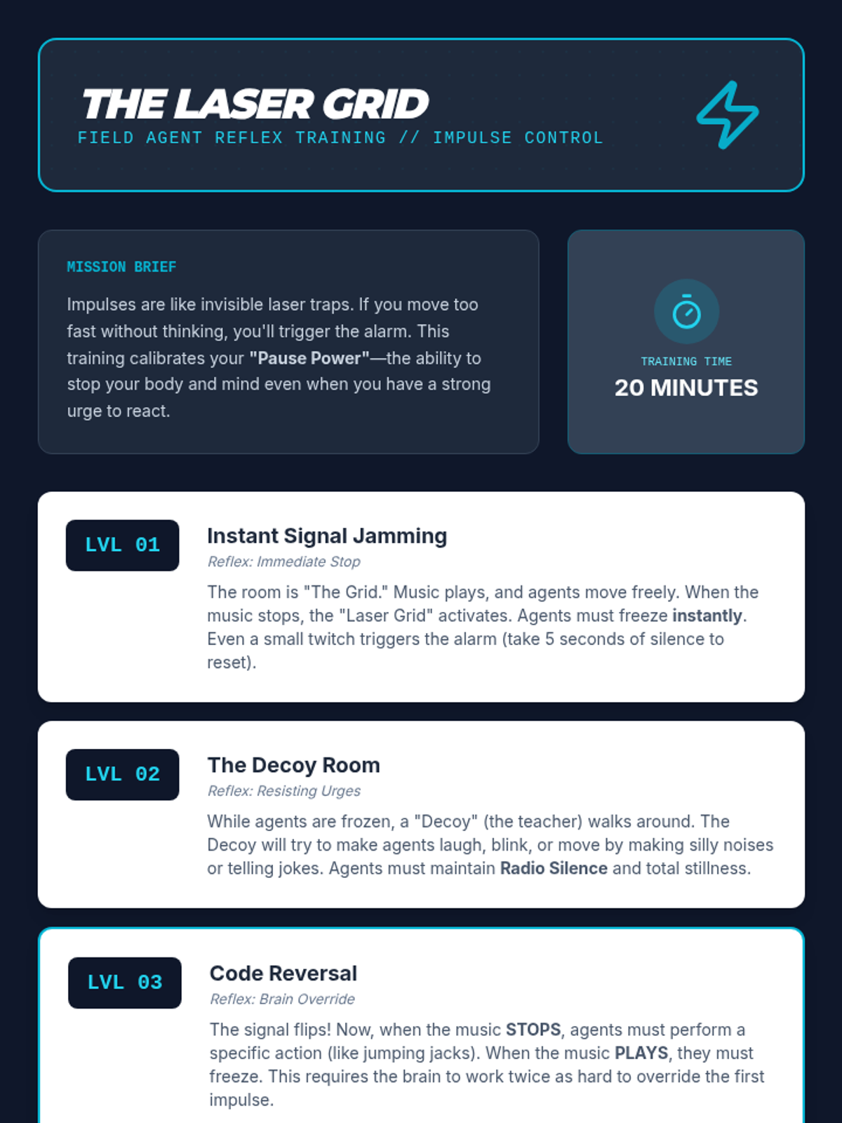 Agents practice navigating the 'Laser Grid' of impulses by using their internal pause button.