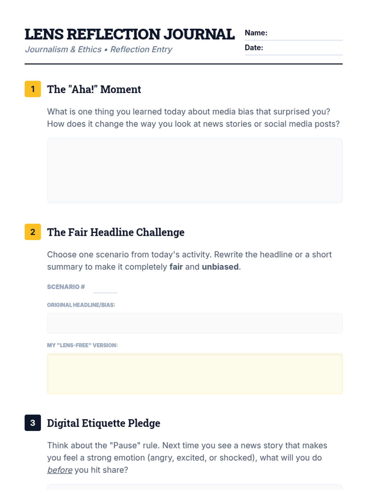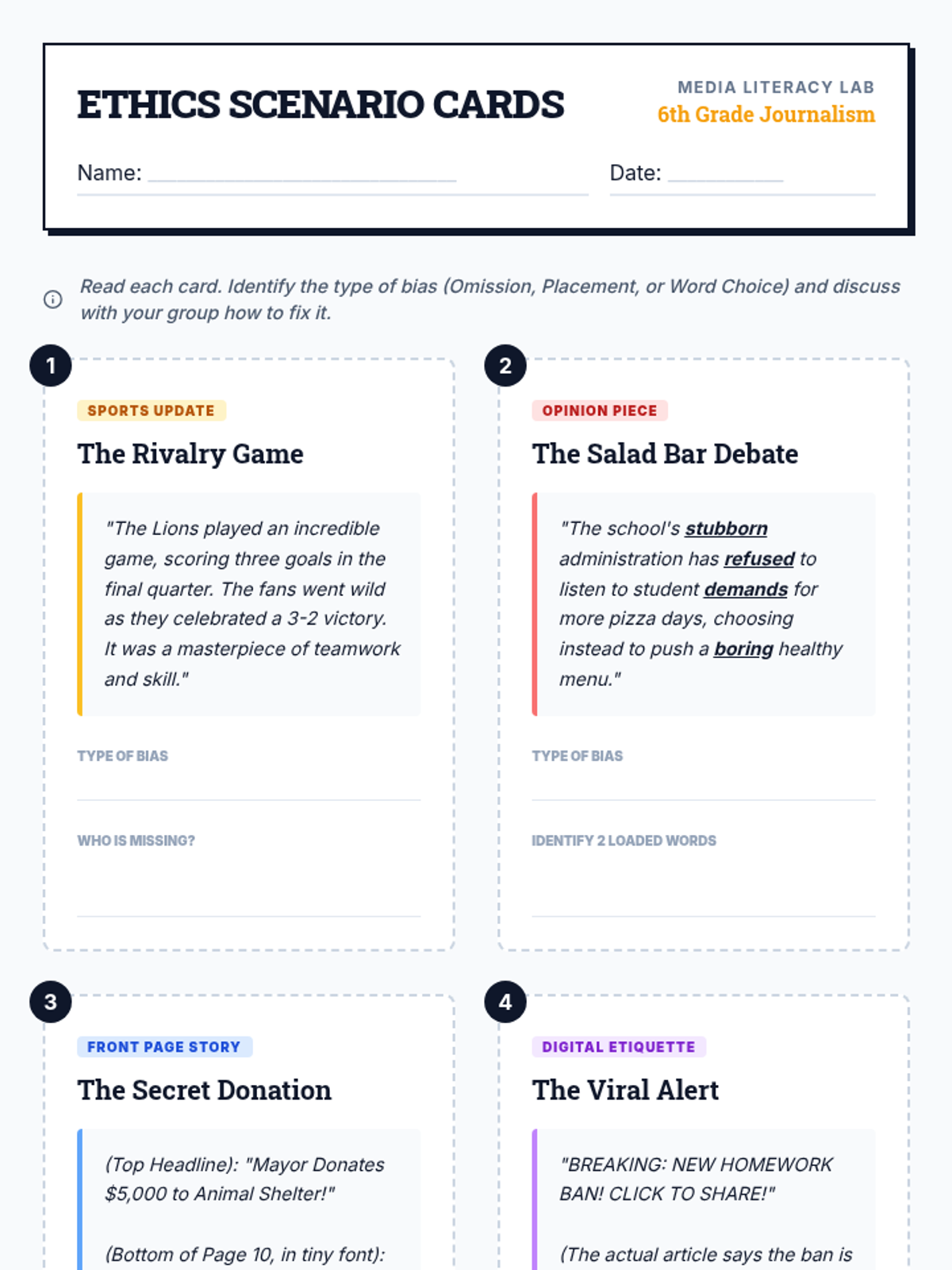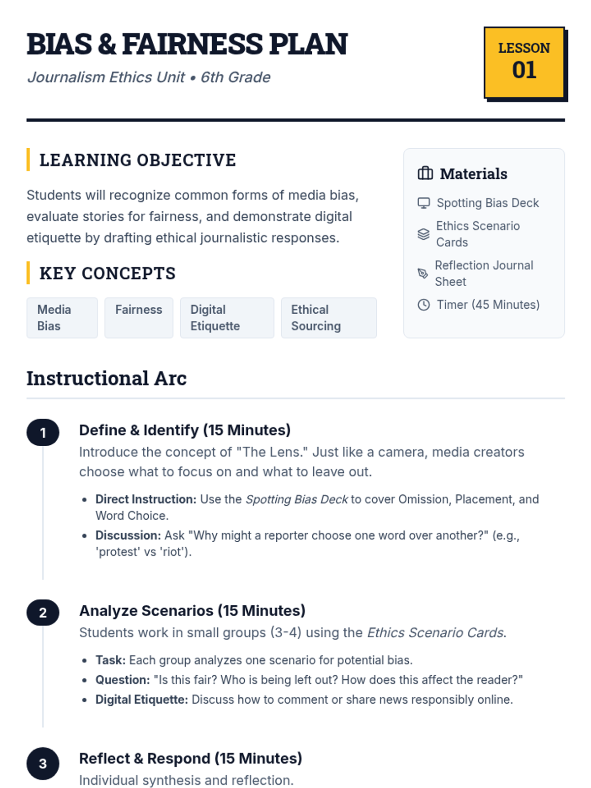 A 45-minute lesson for 6th graders to identify media bias, understand fairness, and practice digital etiquette in journalism. students analyze real-world scenarios and reflect on ethical communication.