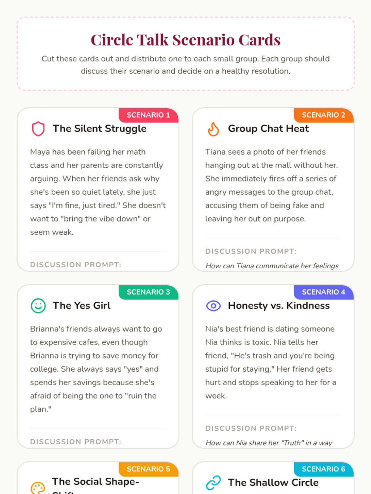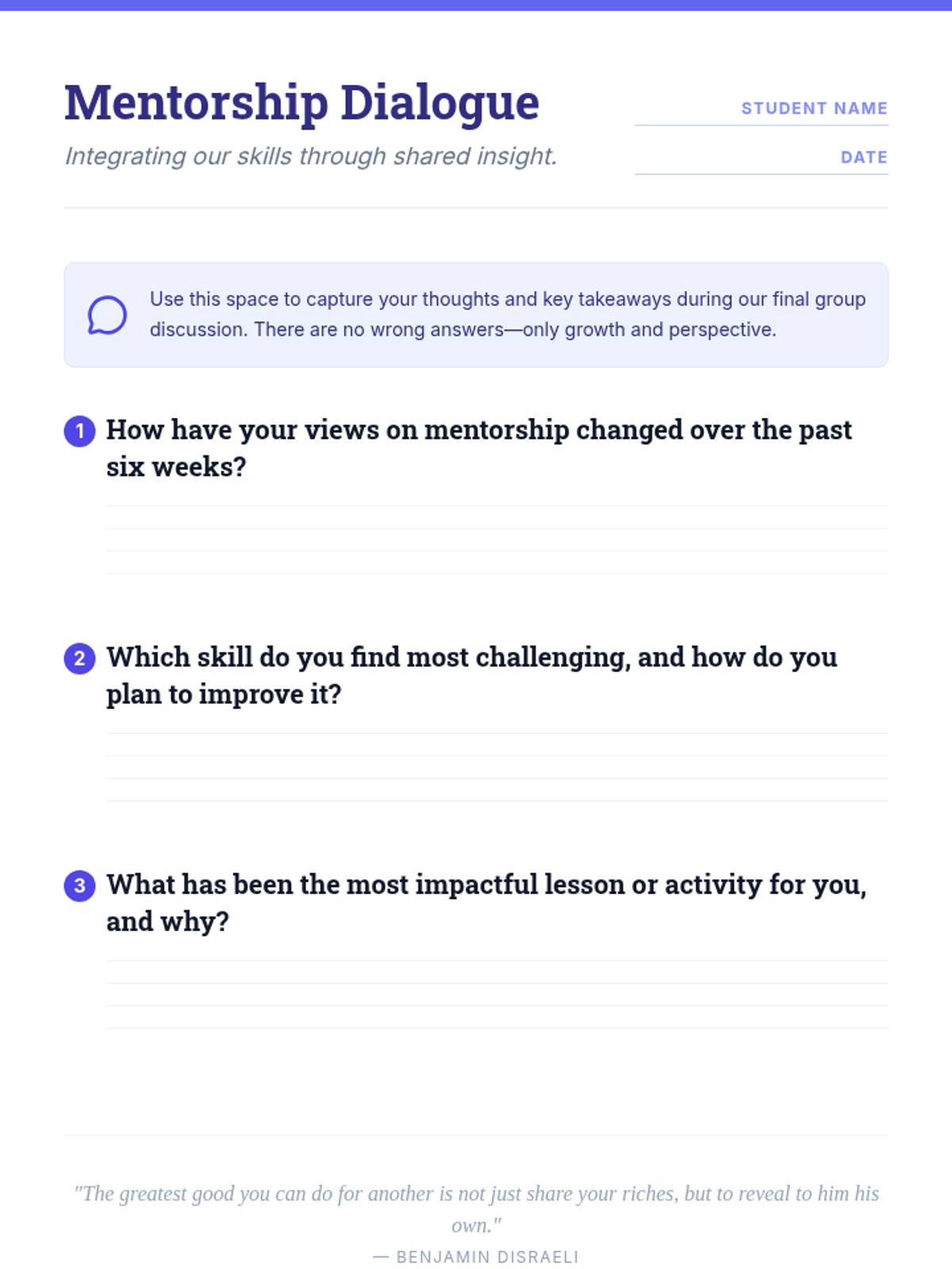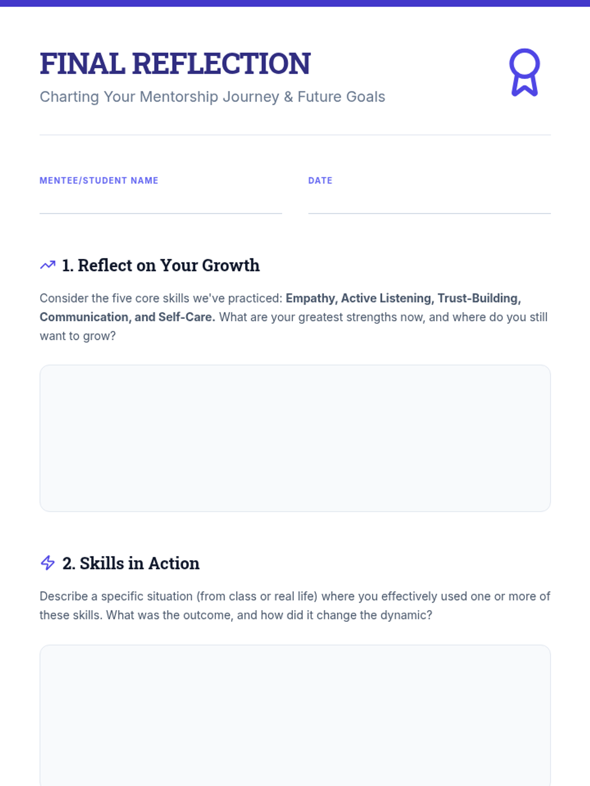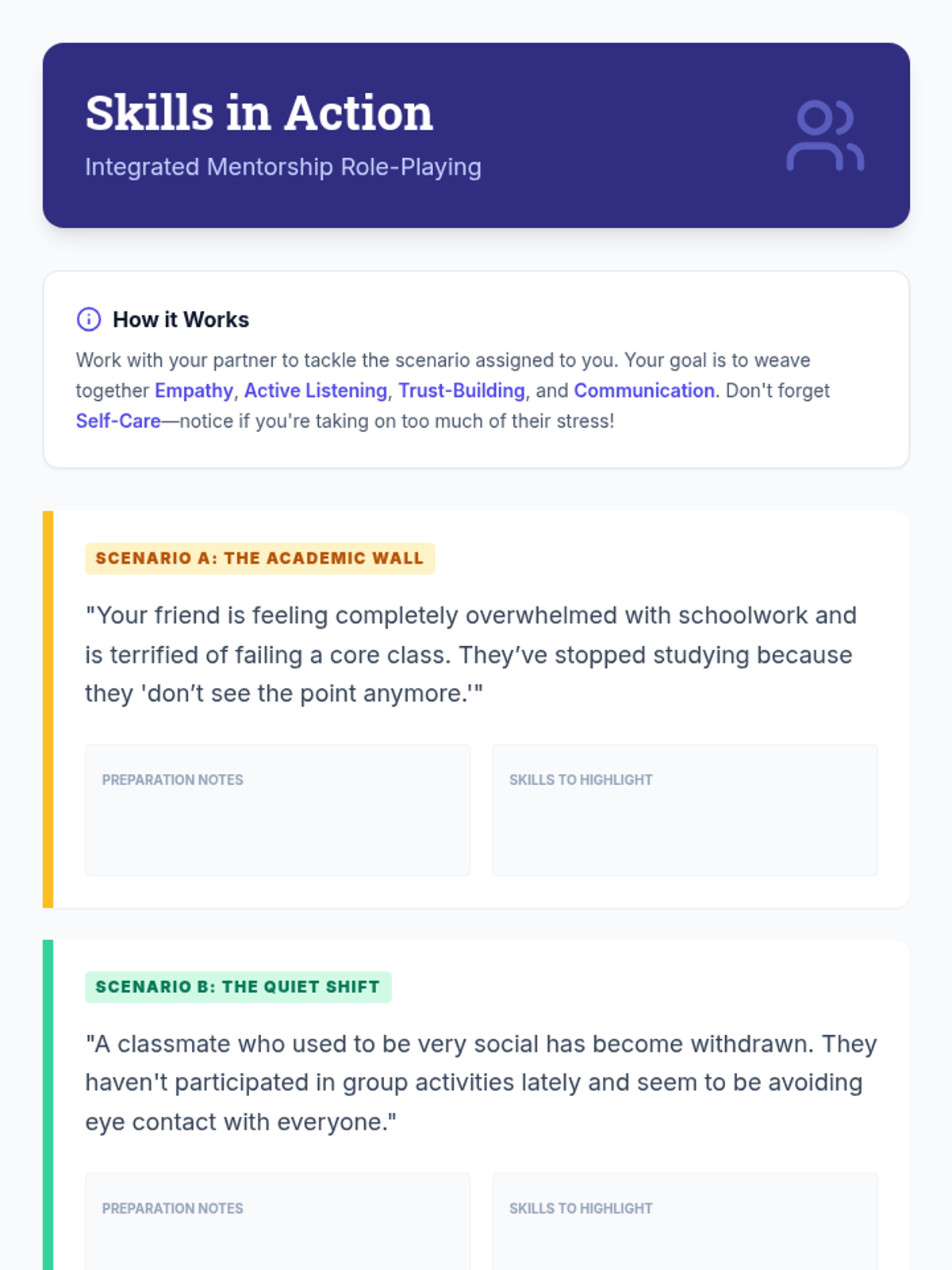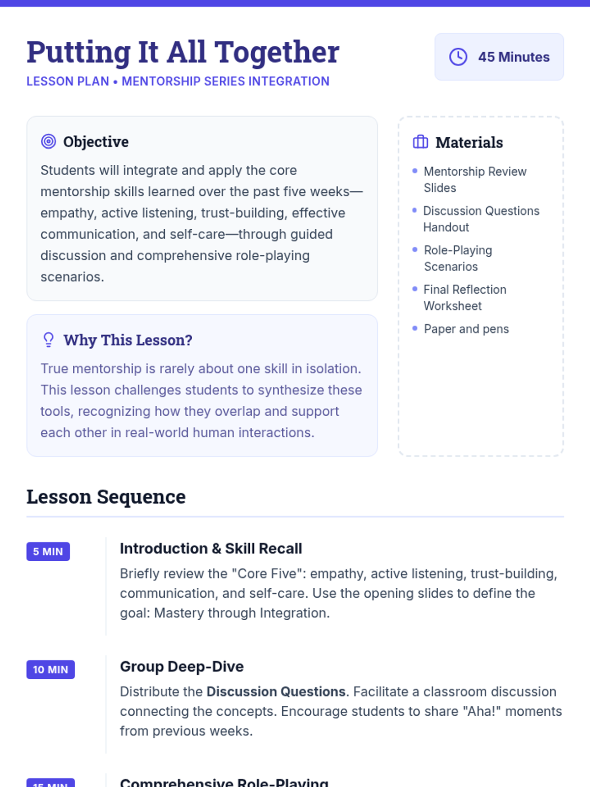 This lesson integrates empathy, active listening, trust-building, communication, and self-care skills through role-playing and reflection. Students synthesize six weeks of mentorship training into practical application.