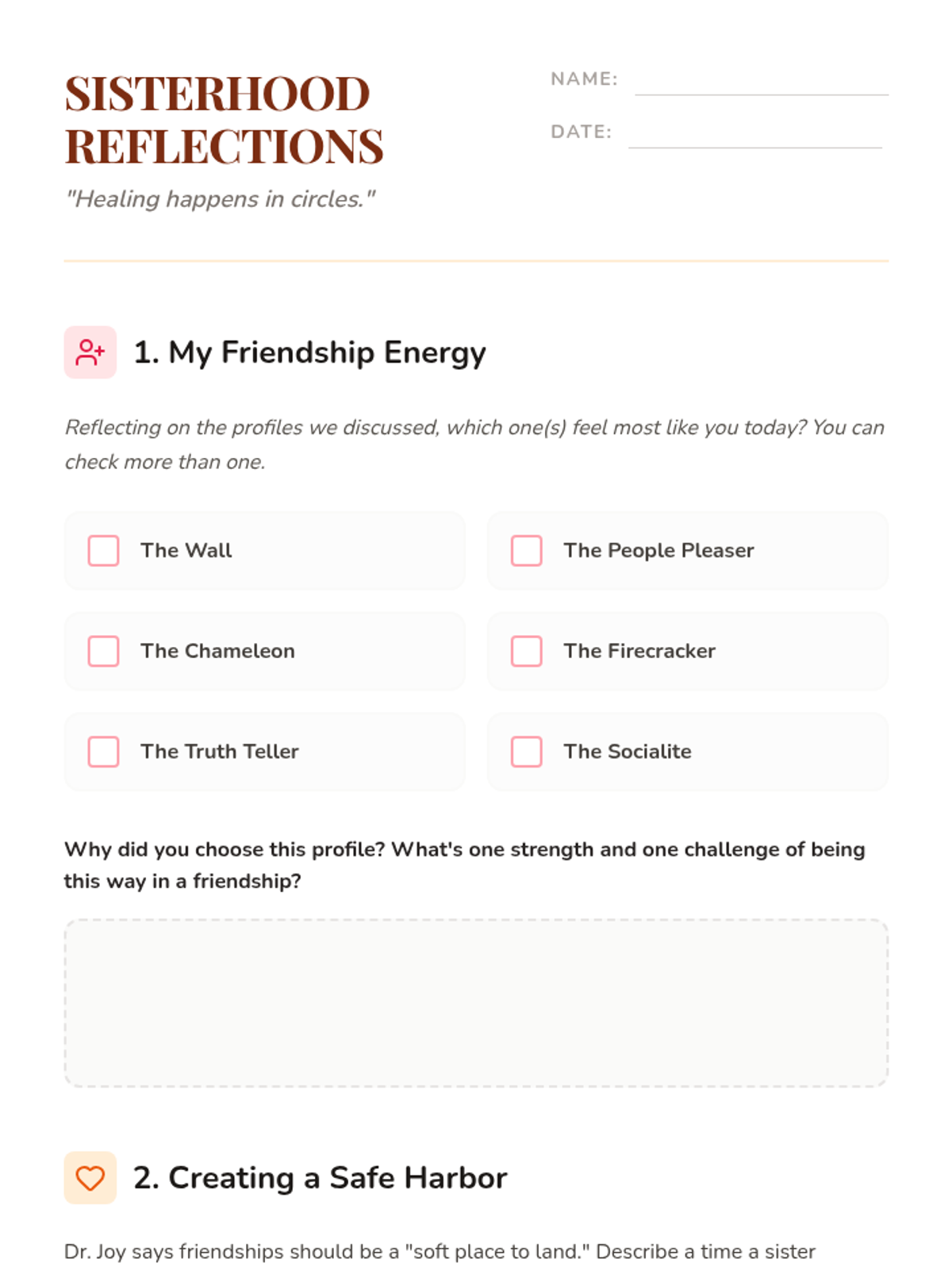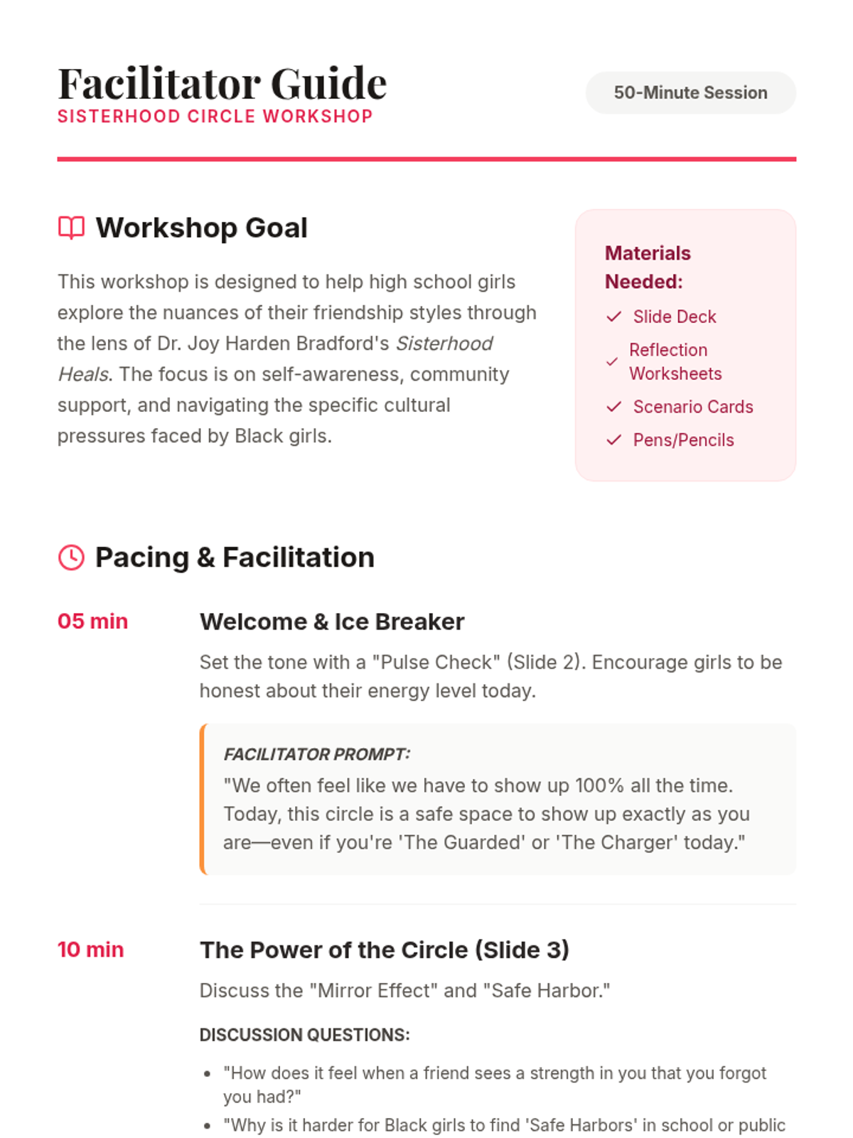 A 50-minute interactive workshop for high school girls focused on the power of sisterhood, navigating the nuances of Black girlhood, and understanding personal friendship styles inspired by Dr. Joy Harden Bradford's 'Sisterhood Heals'.