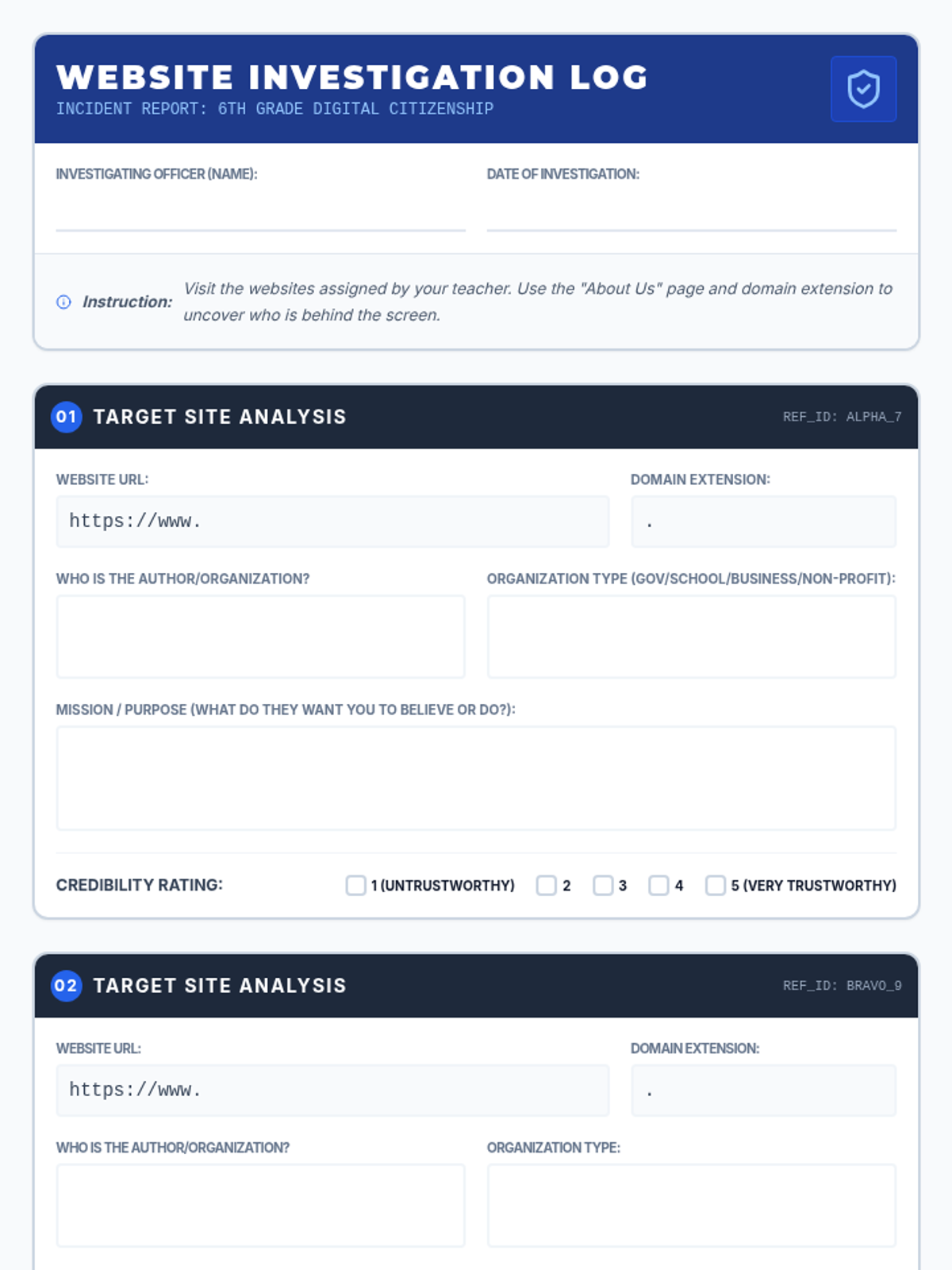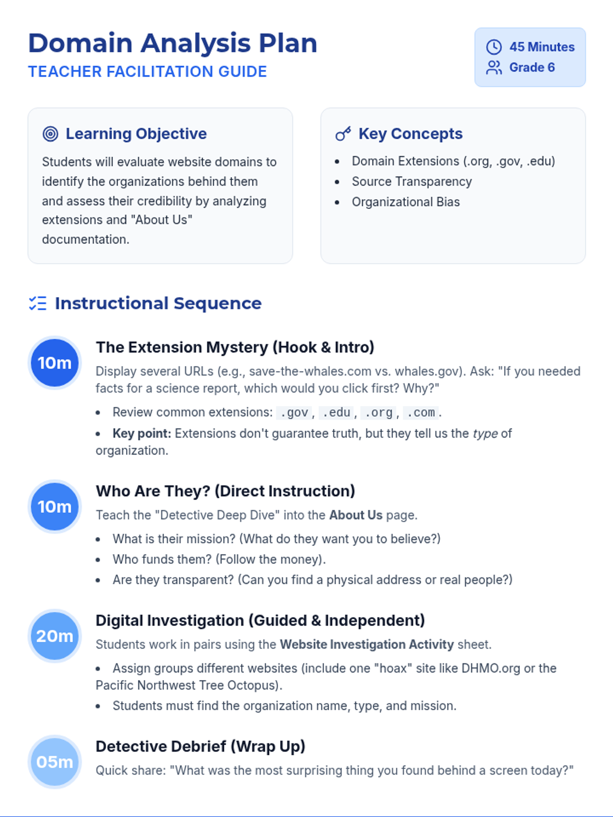 Students become digital detectives as they learn to peel back the layers of websites, analyzing domain extensions and "About Us" pages to determine who is providing information and whether they can be trusted.