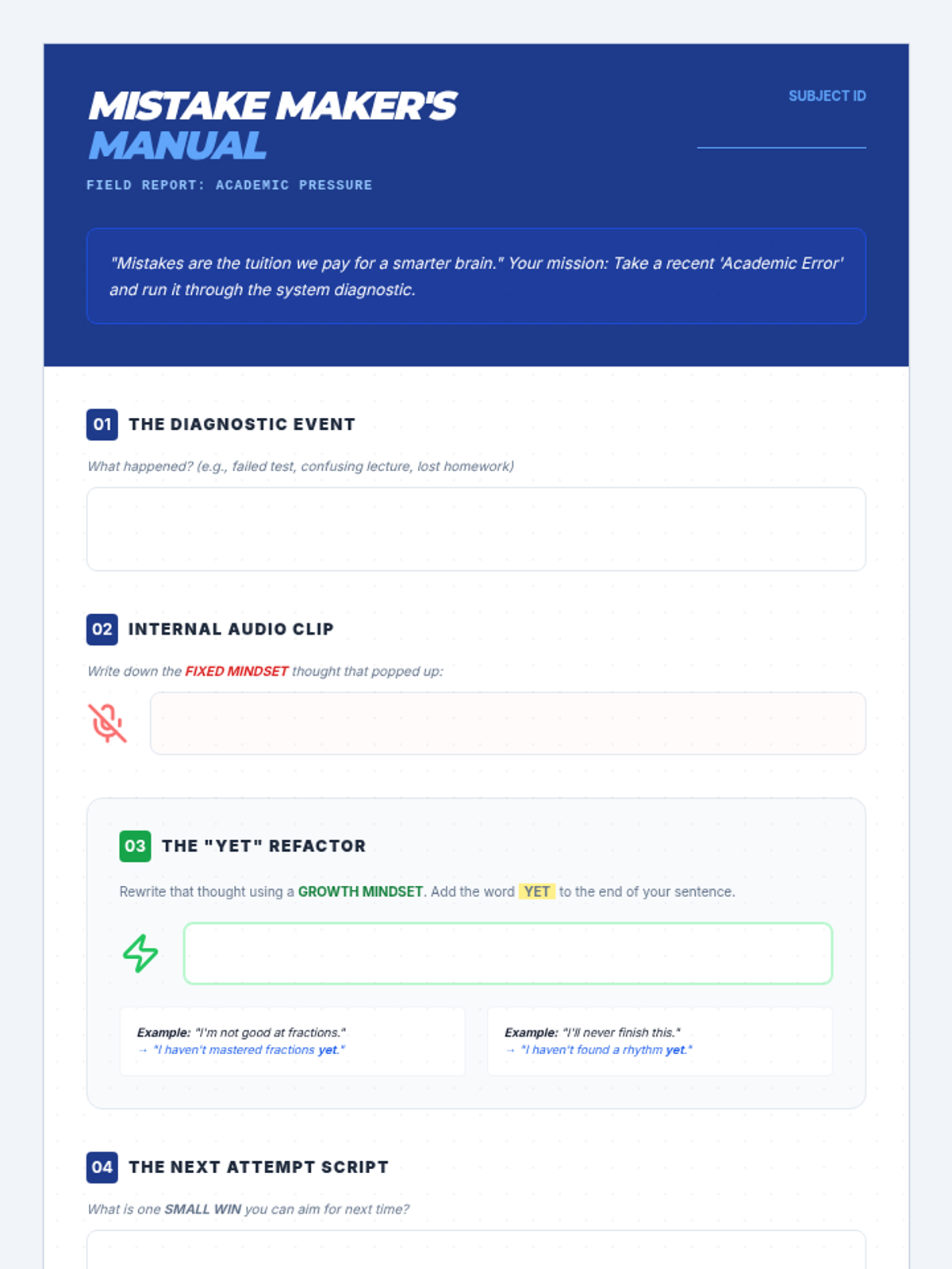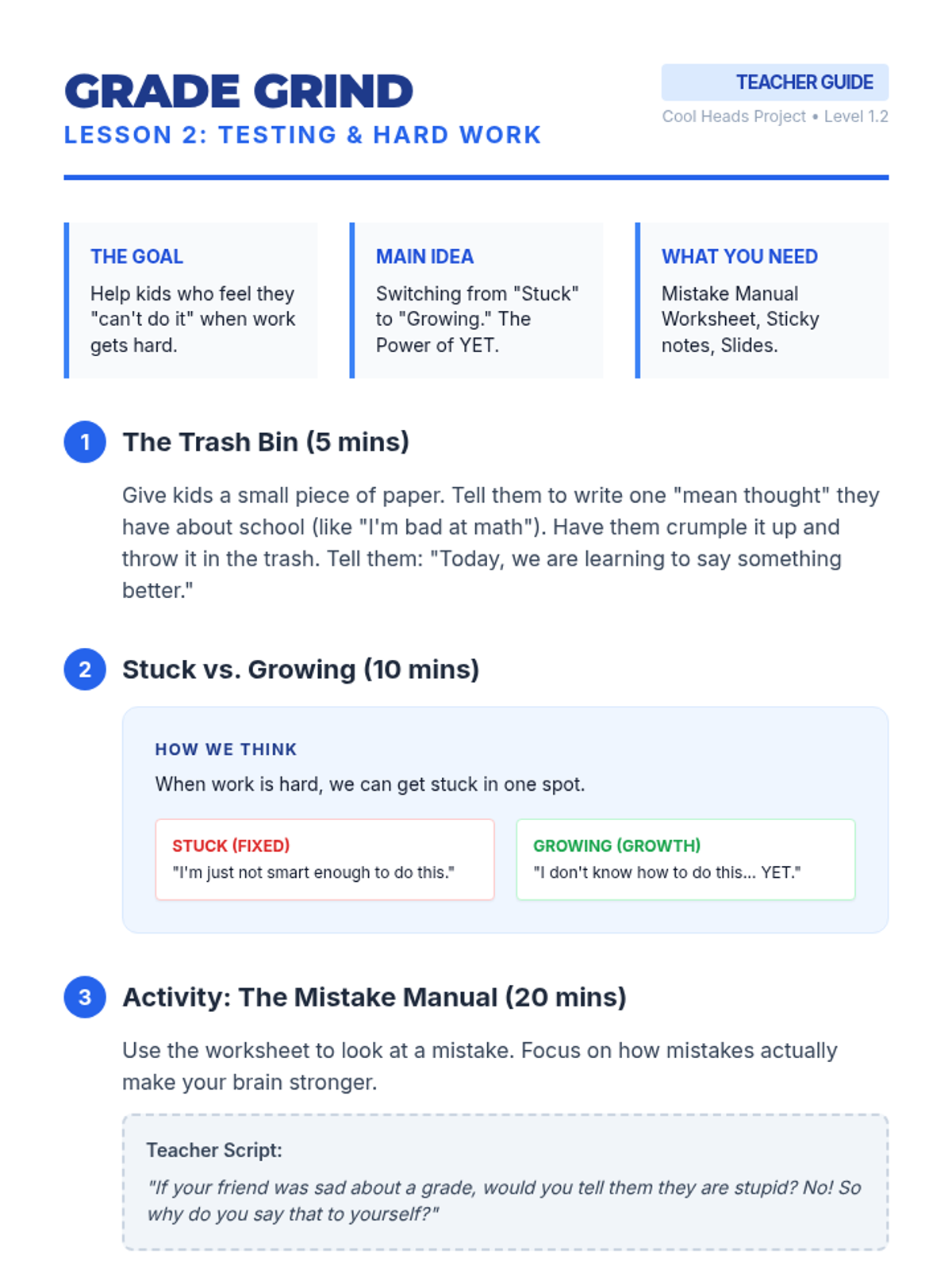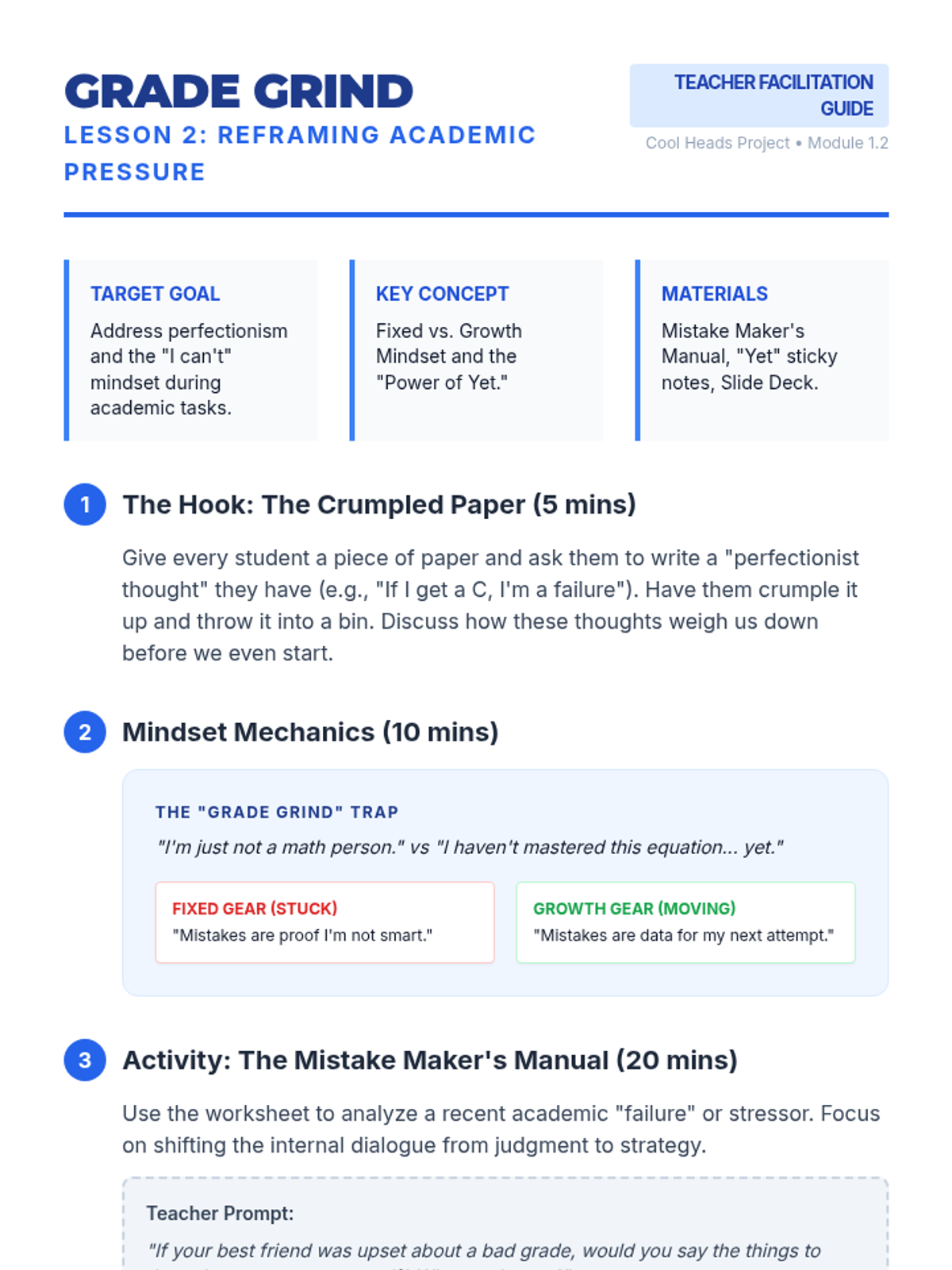 Focuses on managing the pressure of grades, tests, and academic expectations through reframing and realistic goal-setting.