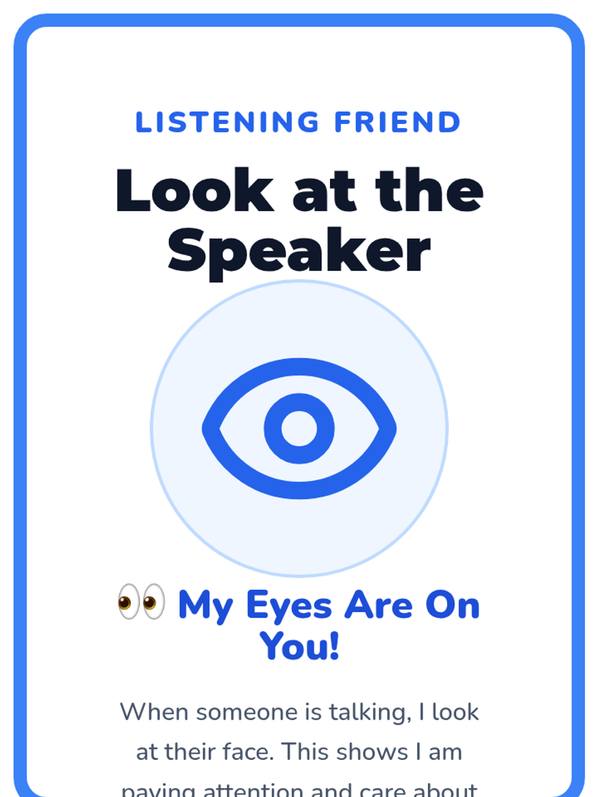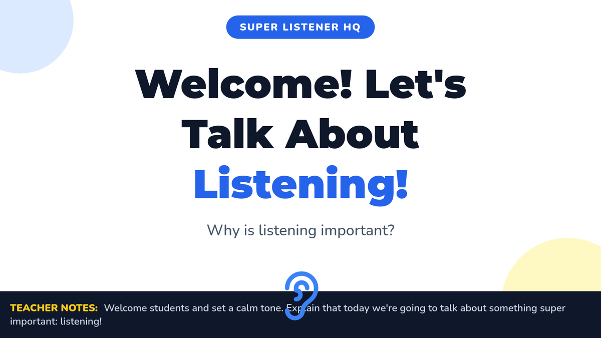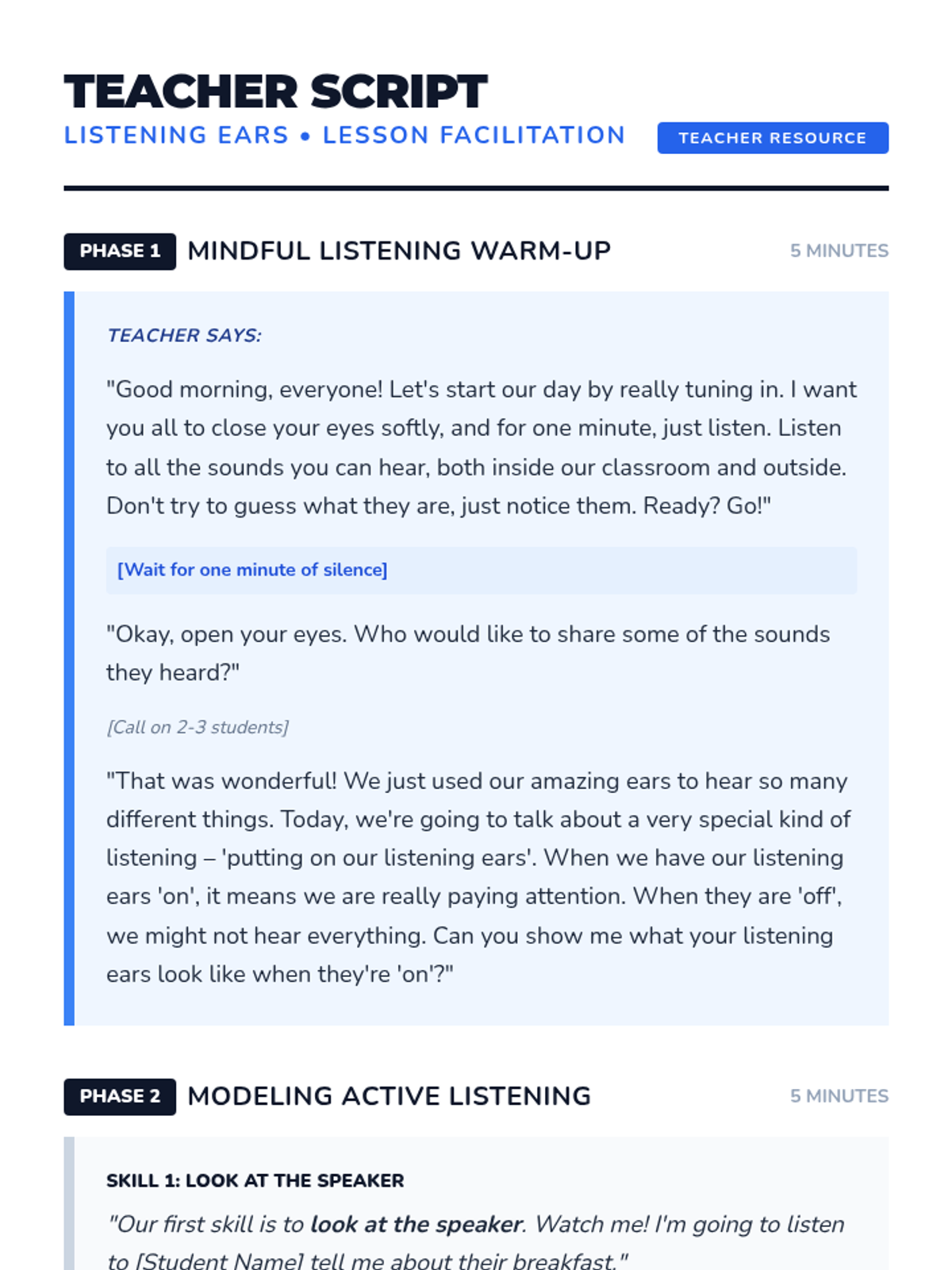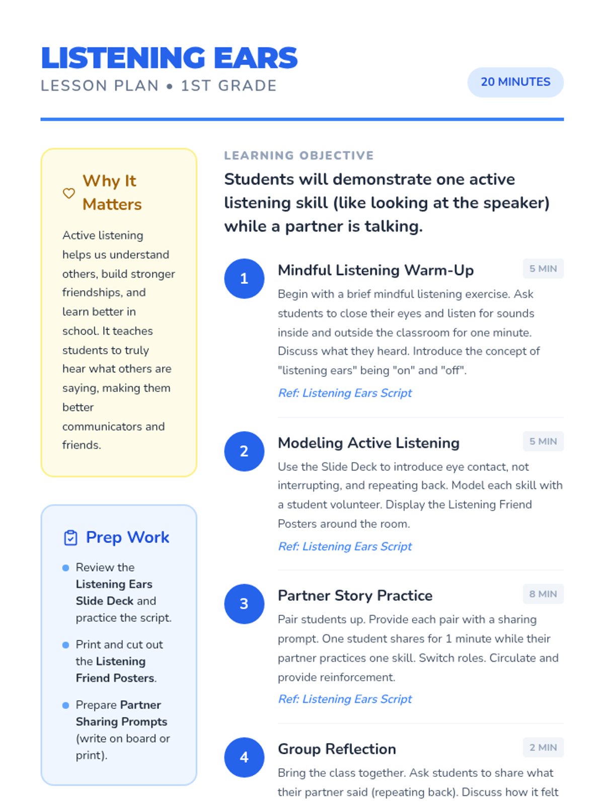 A 20-minute 1st-grade lesson introducing active listening skills through mindful practice, modeling, and partner sharing. Students learn to use their 'listening ears' by making eye contact, avoiding interruptions, and repeating back what they hear.