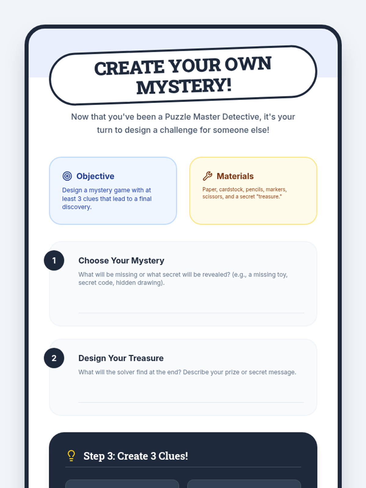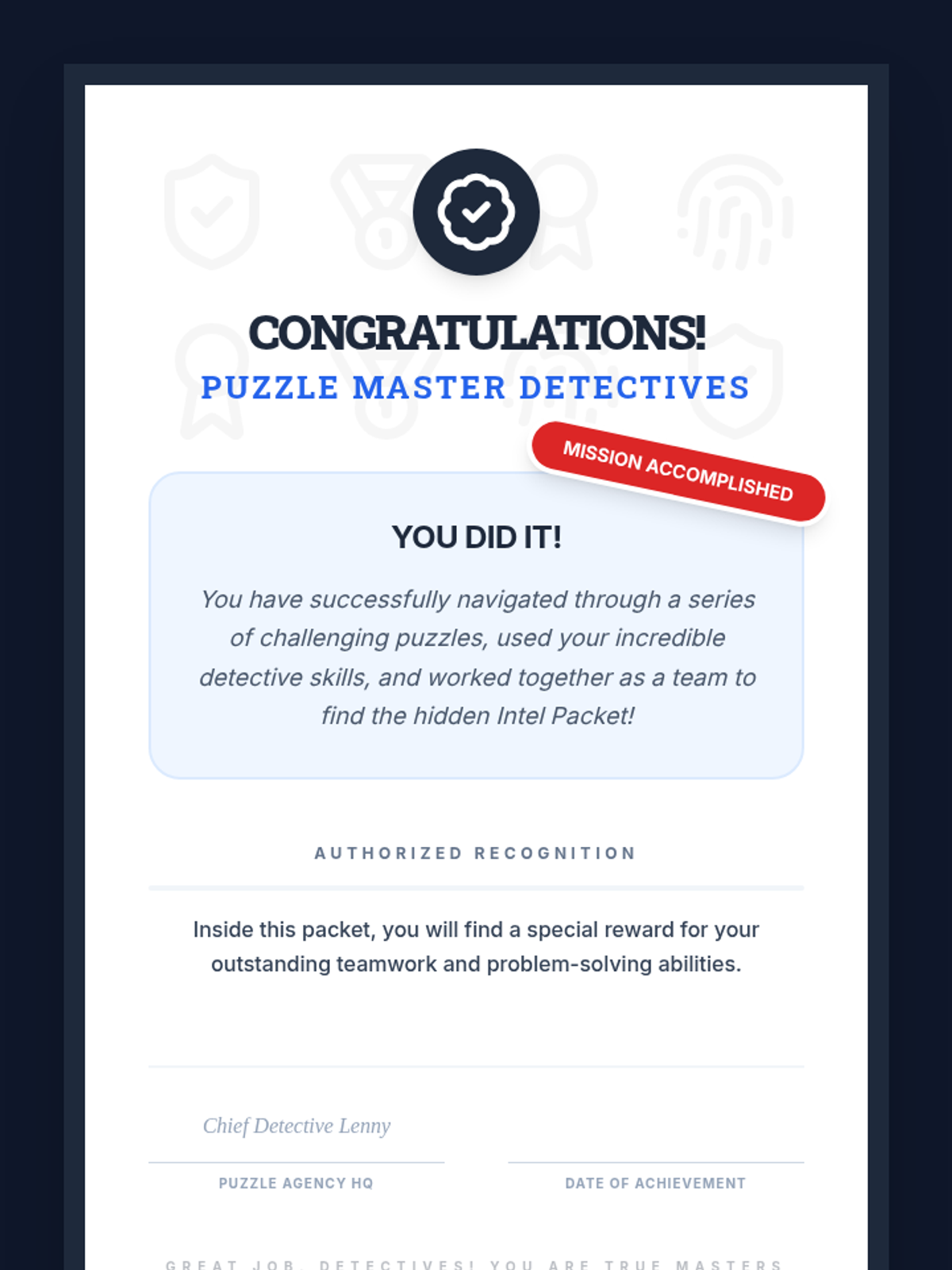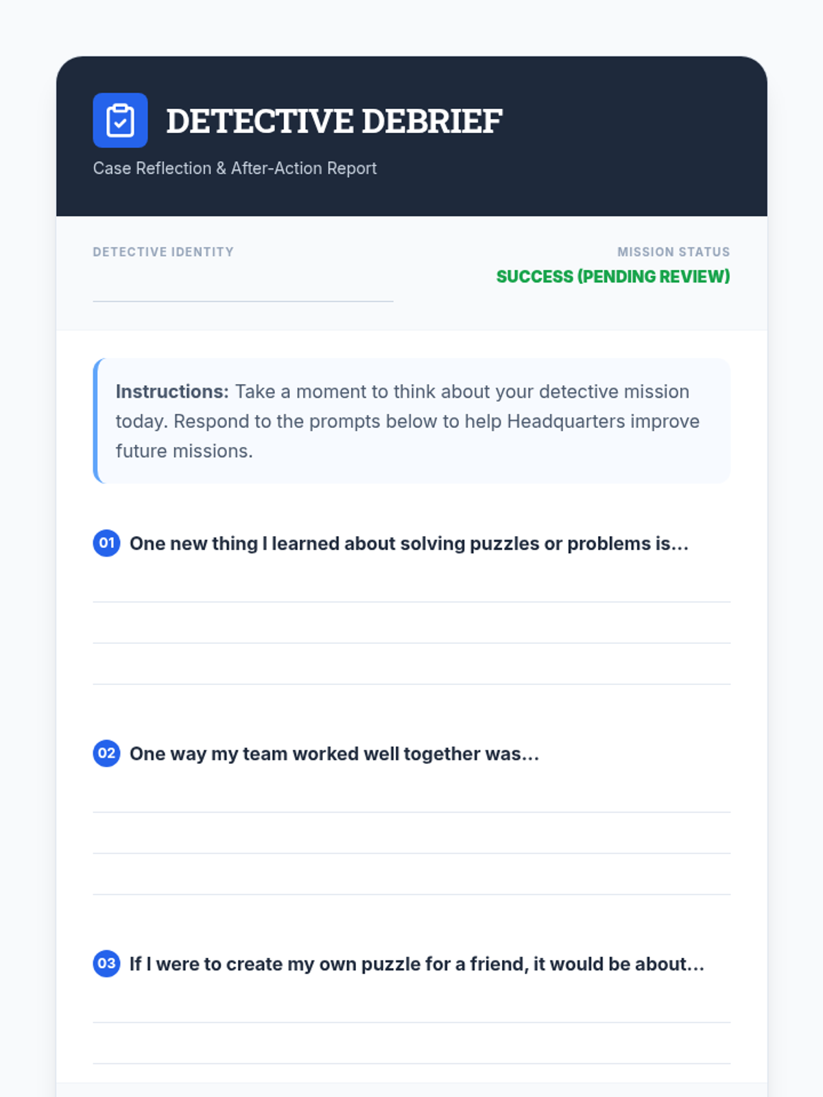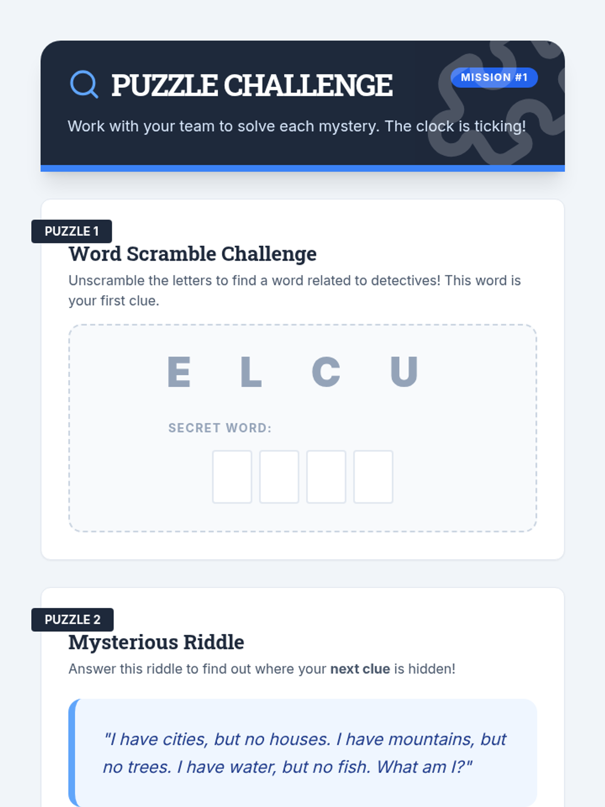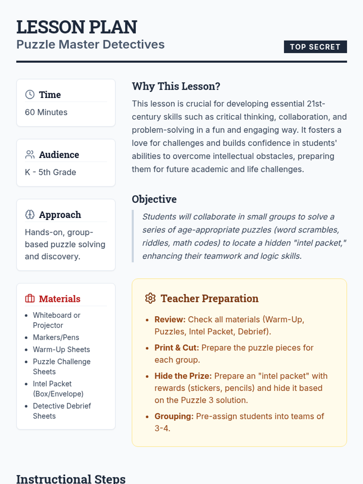 Students collaborate in small groups to solve a series of age-appropriate puzzles, including word scrambles, riddles, and math codes, to successfully locate a hidden 'intel packet.' This lesson enhances critical thinking, problem-solving, and teamwork skills for K-5 learners.