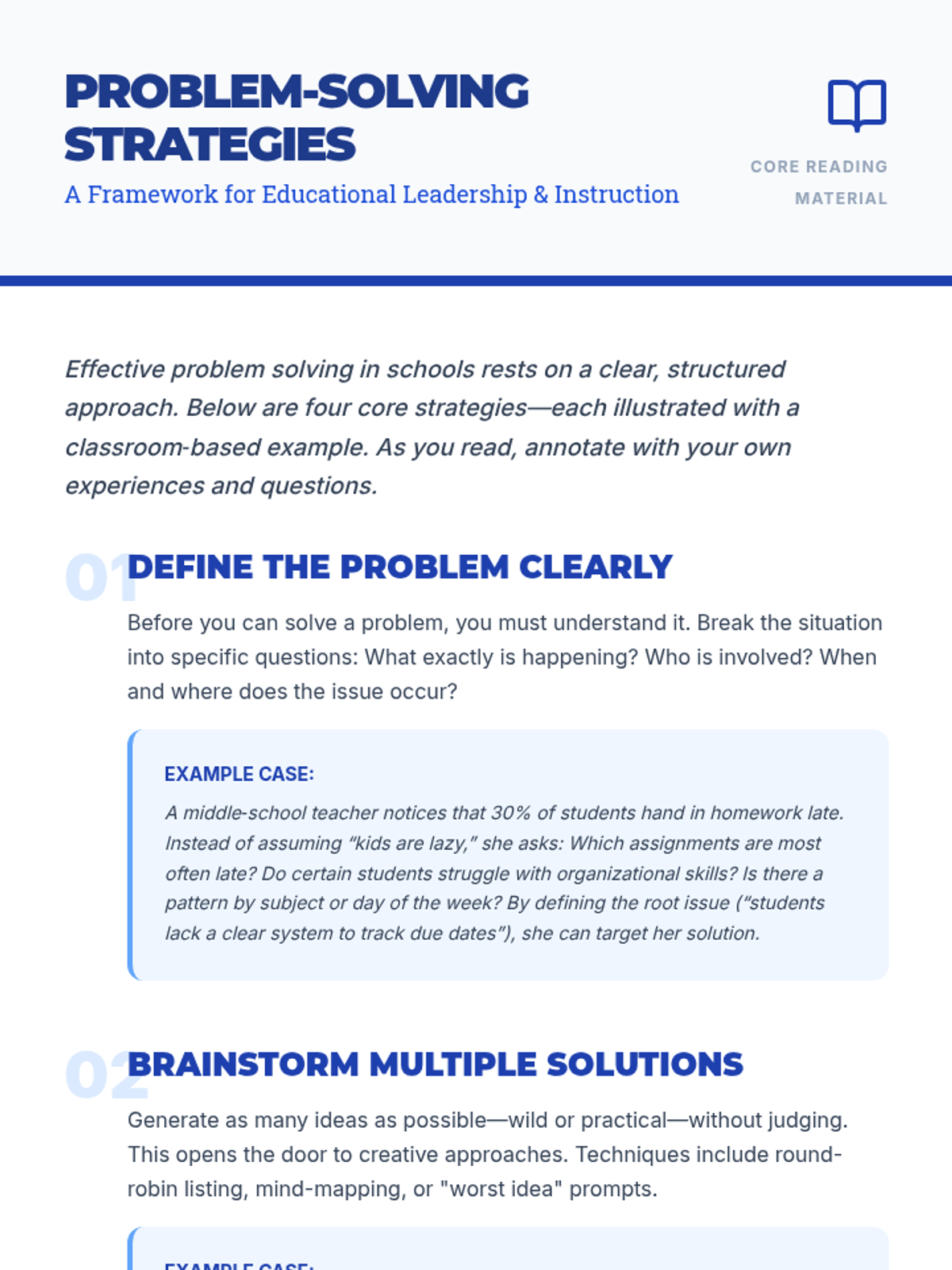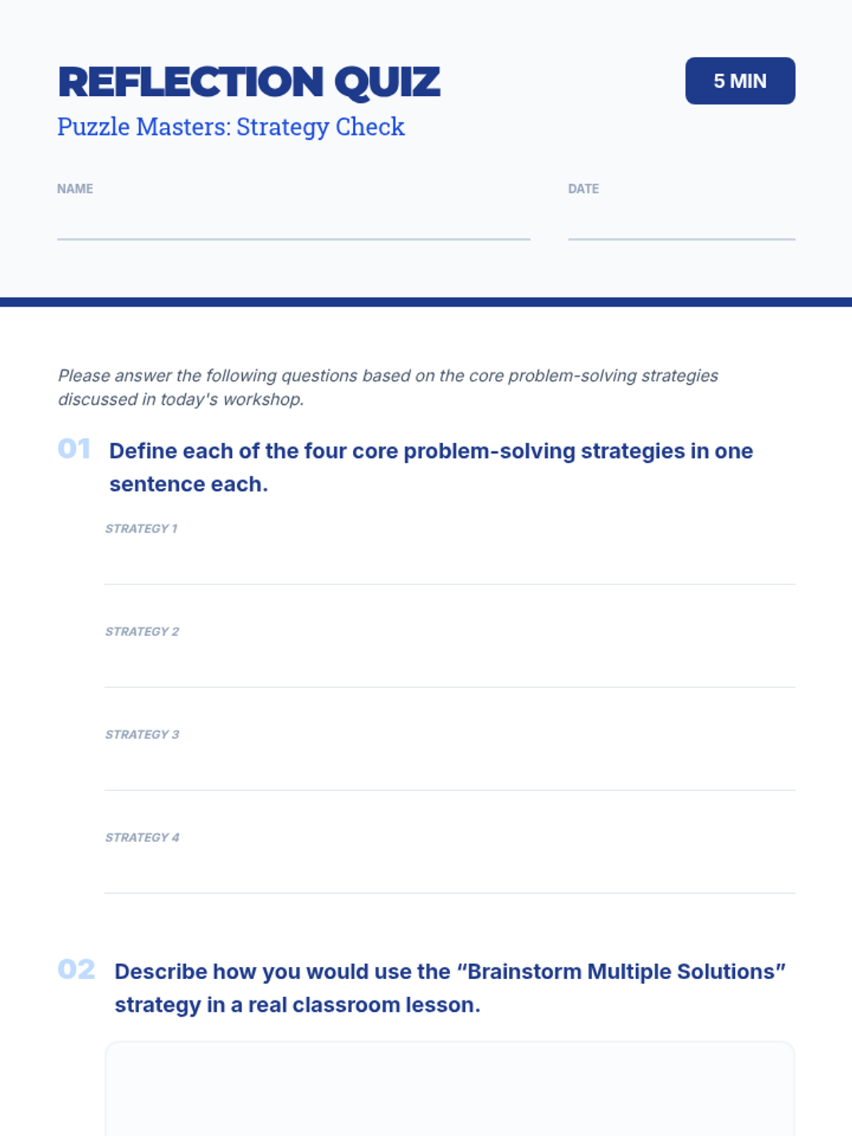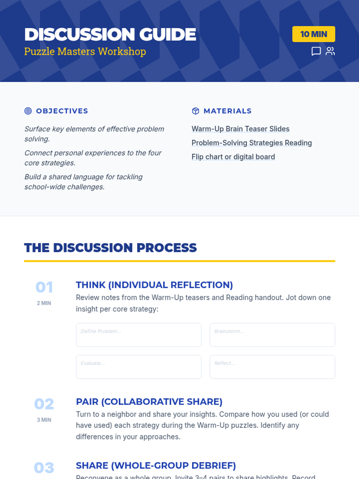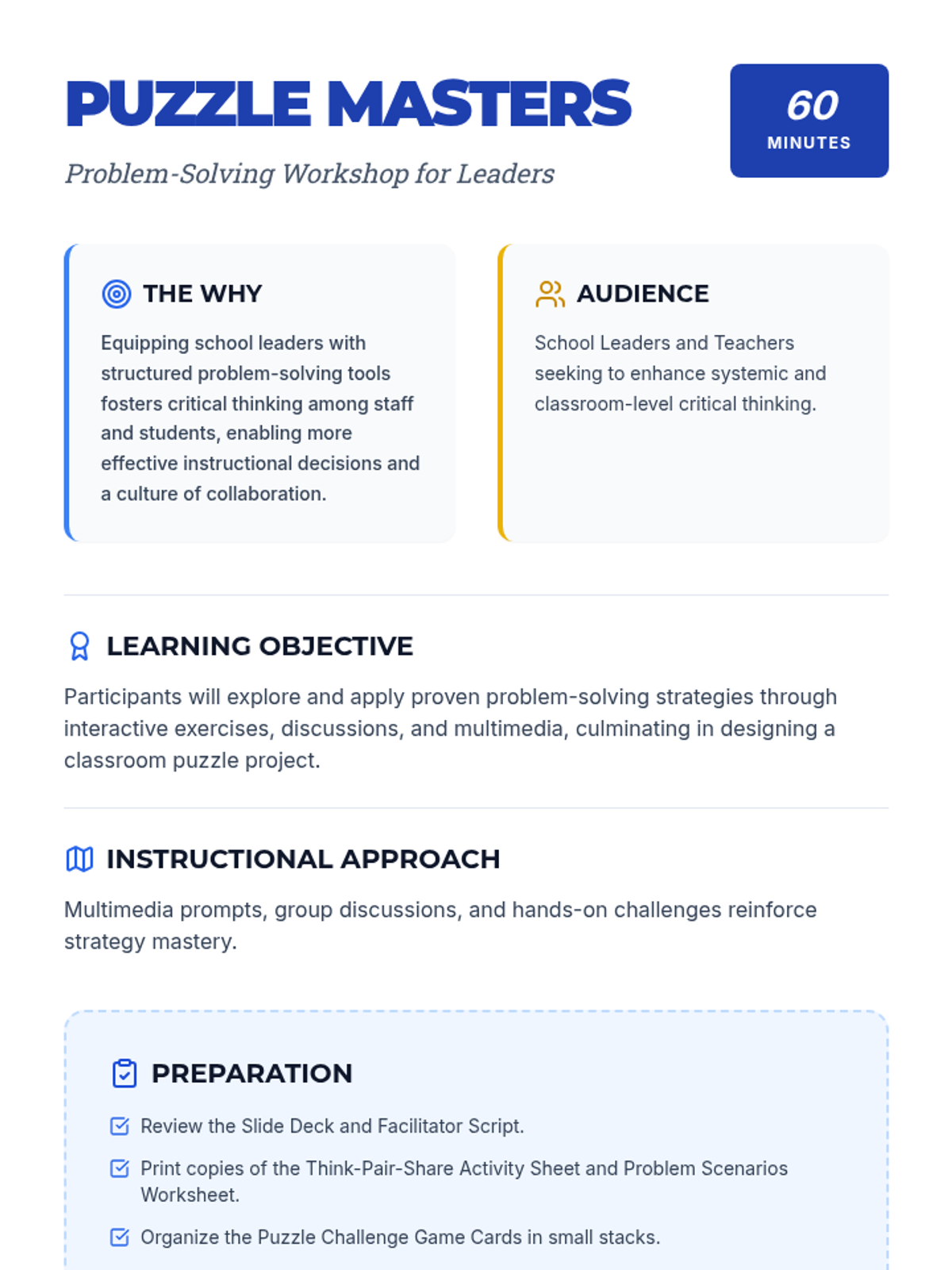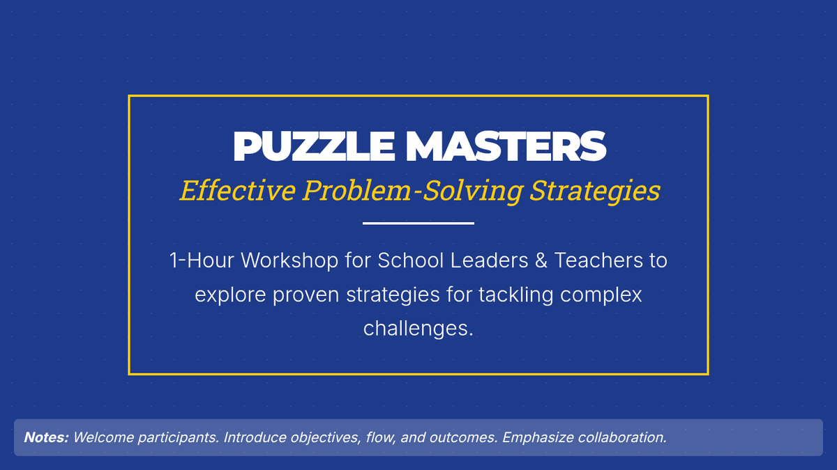 A 1-hour workshop for school leaders and teachers to master effective problem-solving strategies through hands-on puzzles and real-world scenarios. Participants explore a four-step framework: Define, Brainstorm, Evaluate, and Reflect.