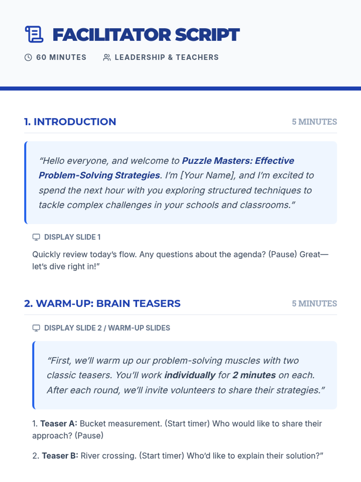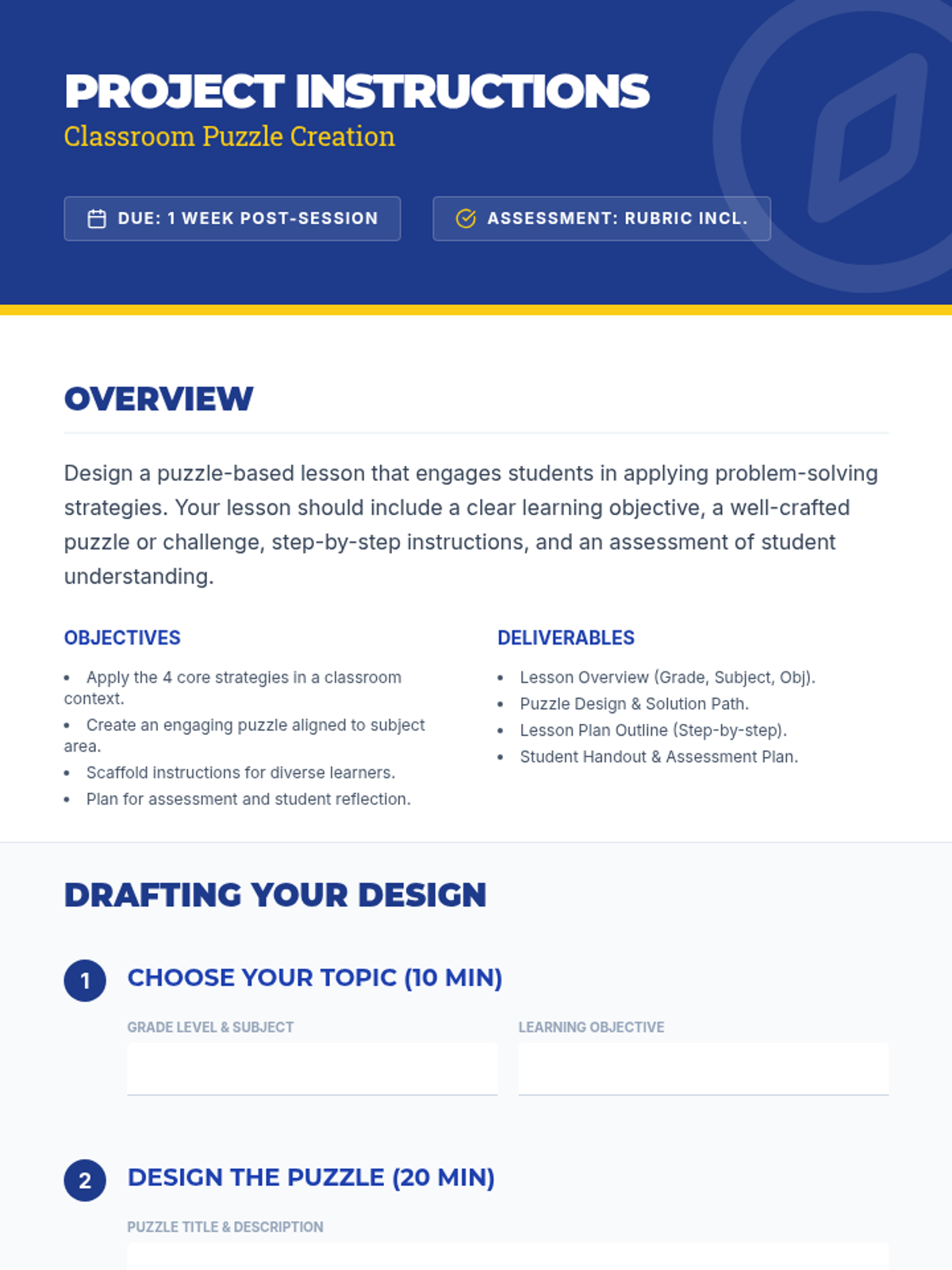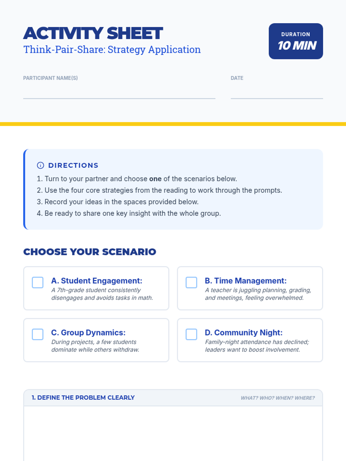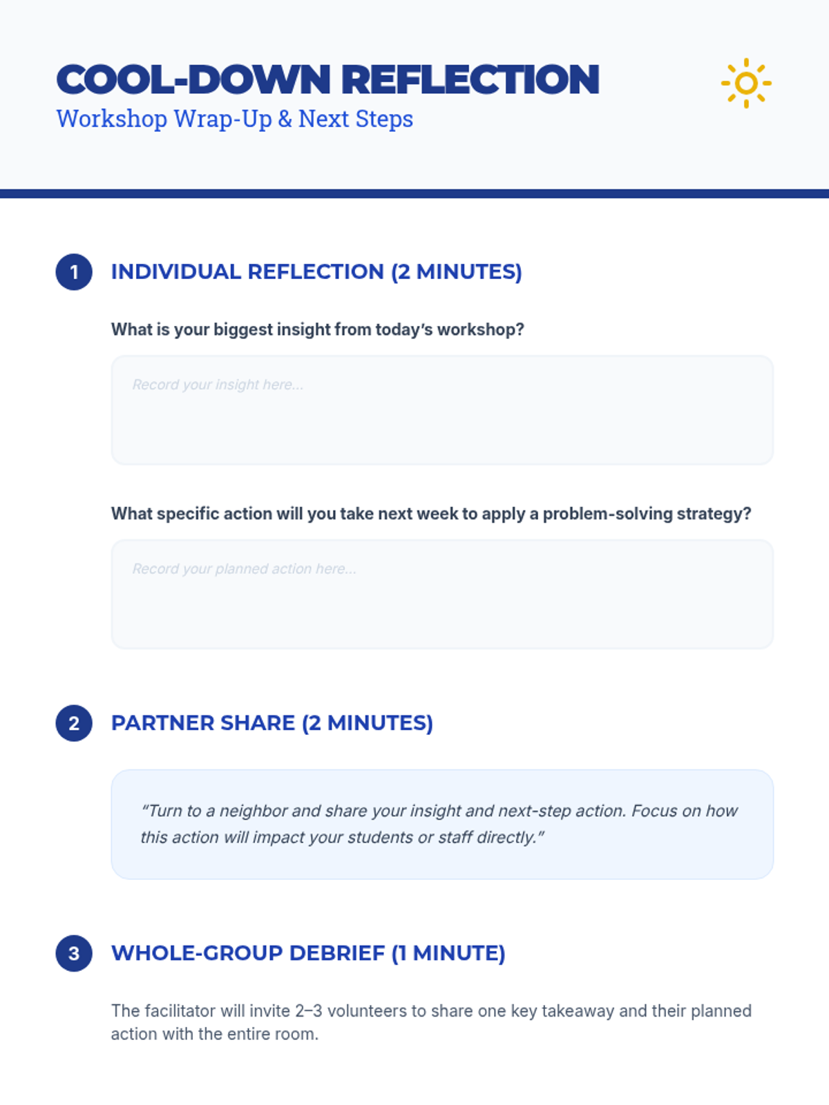 A 1-hour workshop for school leaders and teachers to master effective problem-solving strategies through hands-on puzzles and real-world scenarios. Participants explore a four-step framework: Define, Brainstorm, Evaluate, and Reflect.