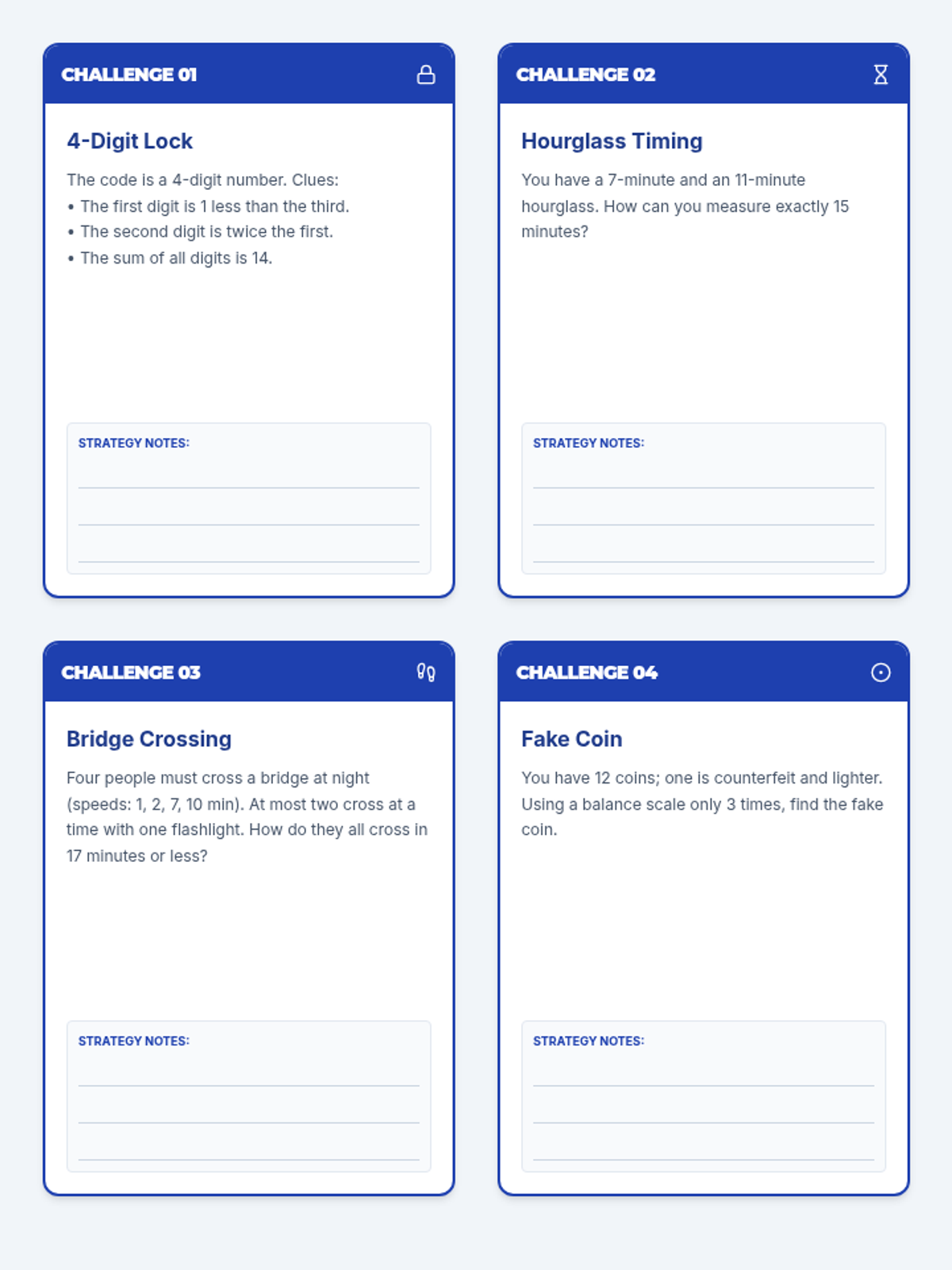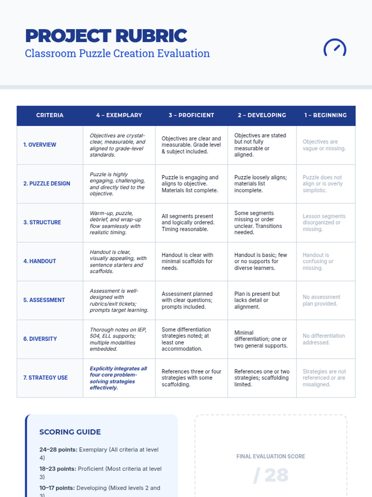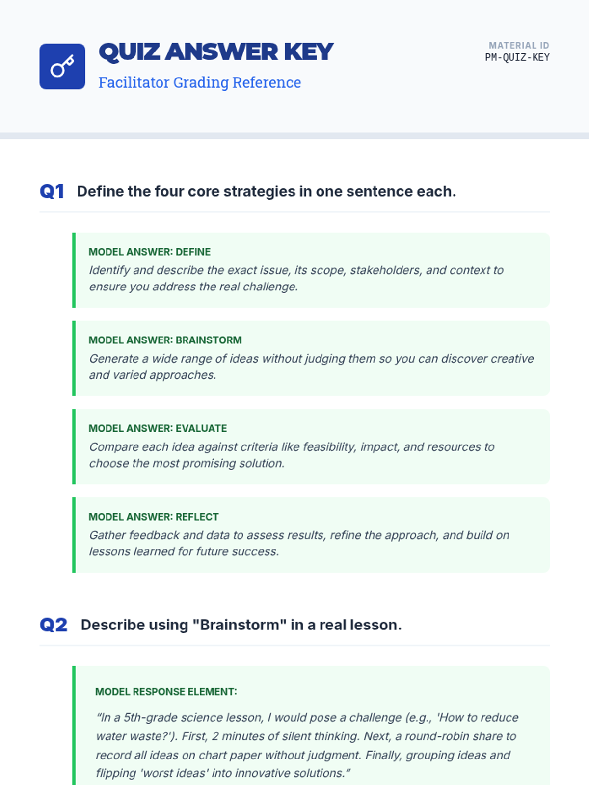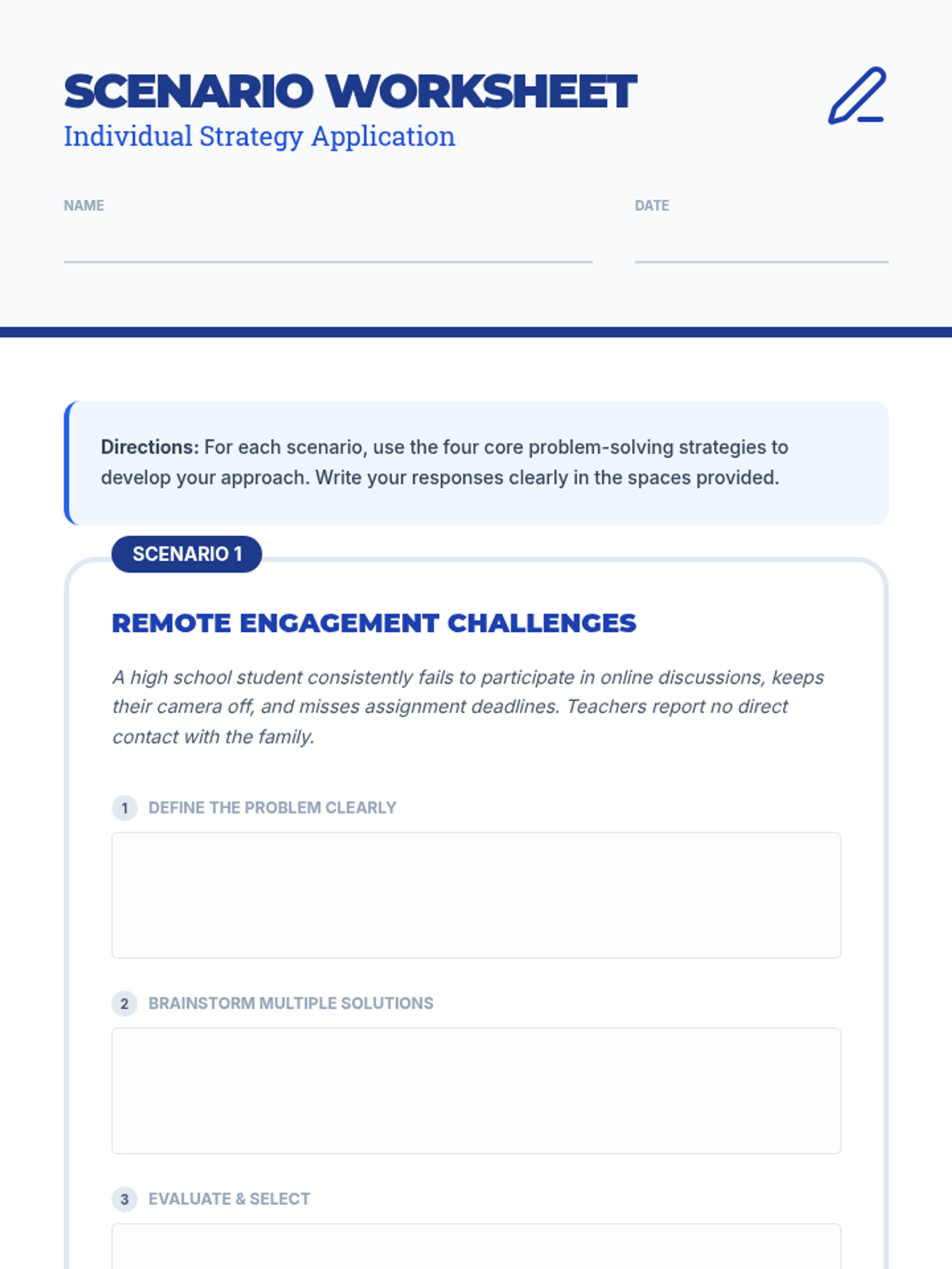 A 1-hour workshop for school leaders and teachers to master effective problem-solving strategies through hands-on puzzles and real-world scenarios. Participants explore a four-step framework: Define, Brainstorm, Evaluate, and Reflect.