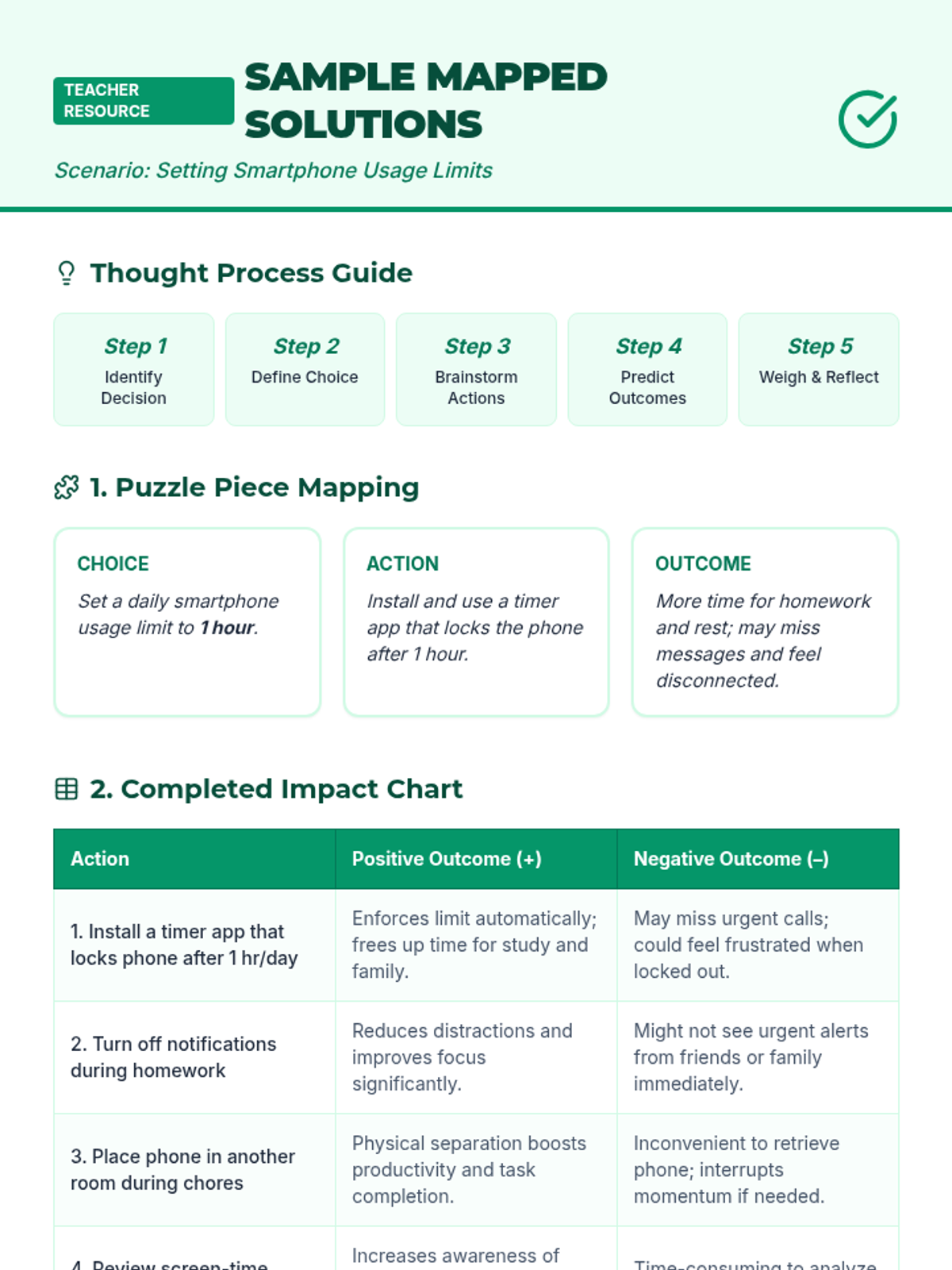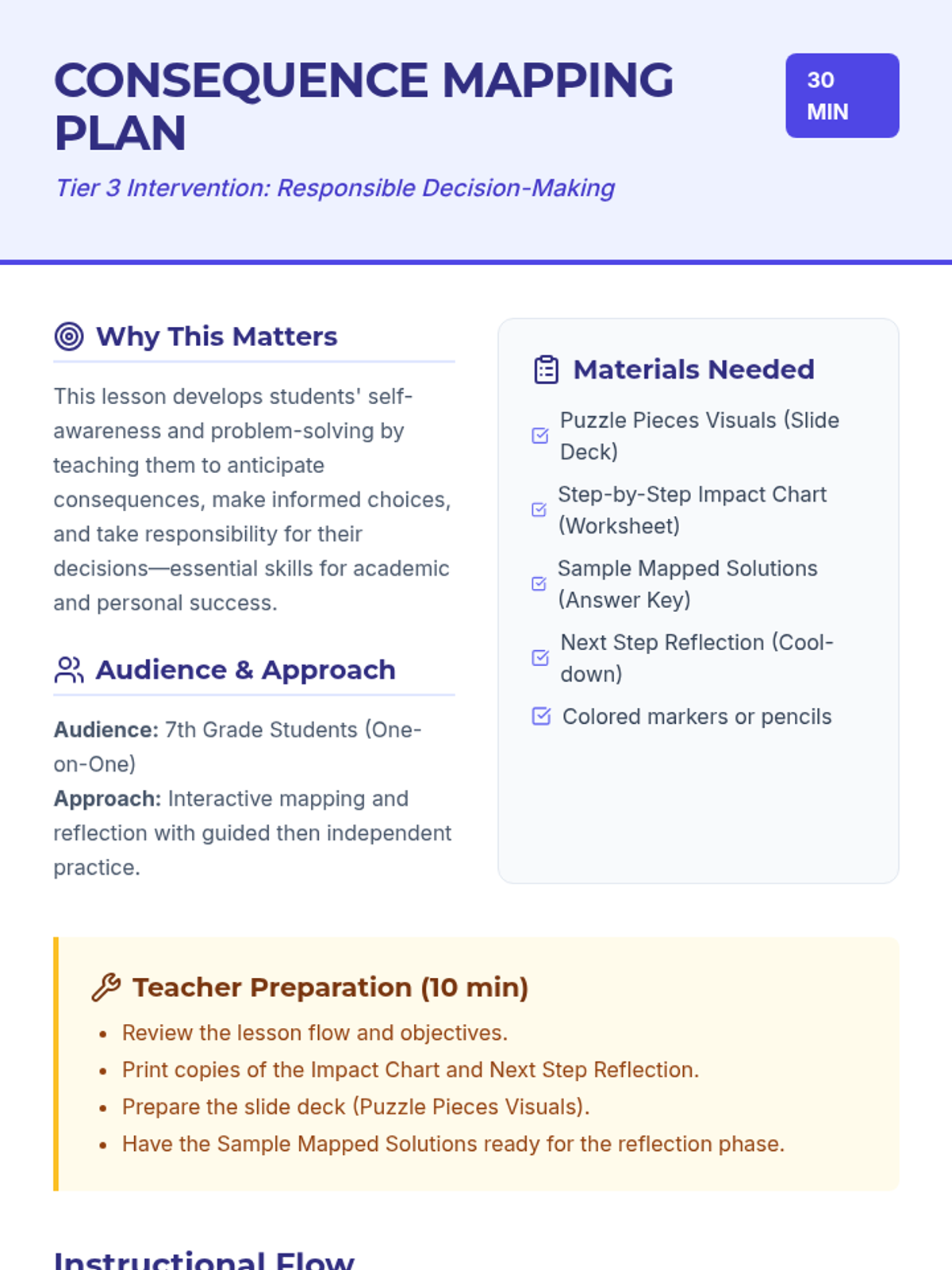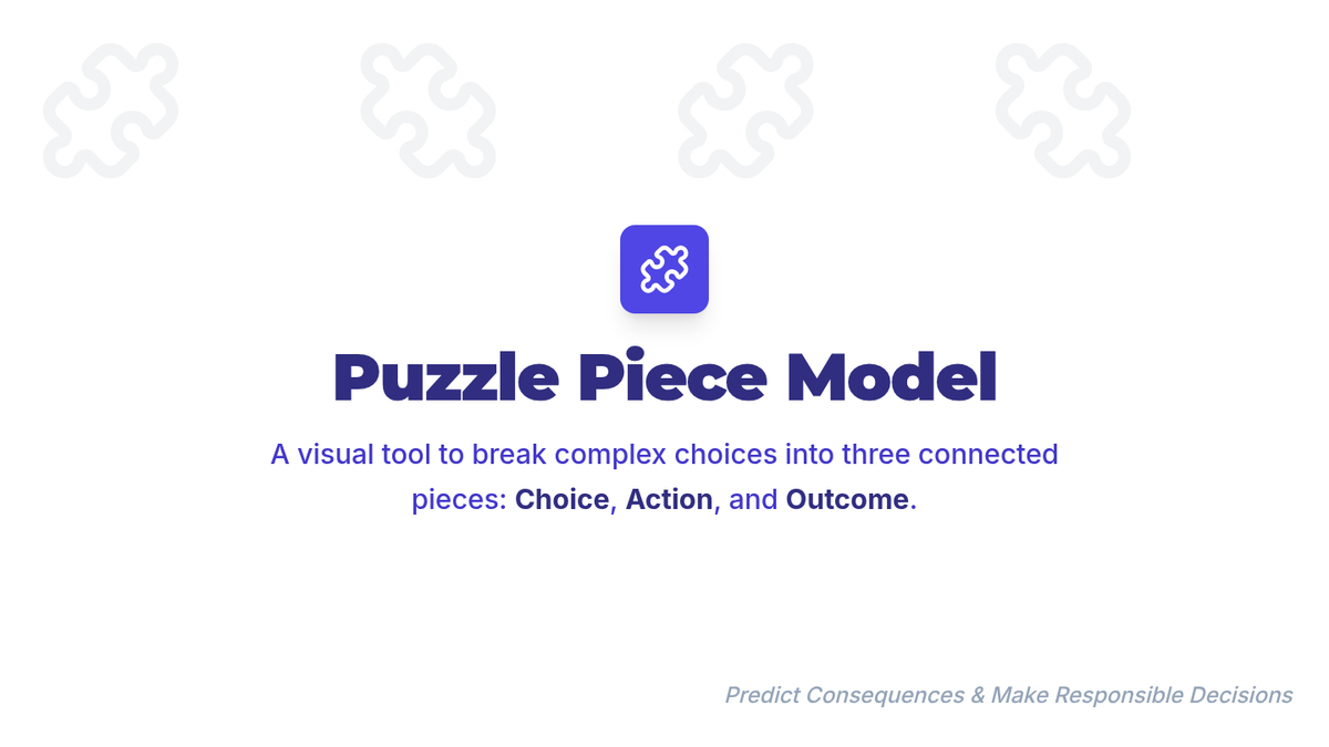 A 30-minute, one-on-one intervention for 7th graders to develop responsible decision-making by mapping complex choices into sequential puzzle pieces (Choice, Action, Outcome). Students analyze impacts and predict consequences using a structured mapping approach.