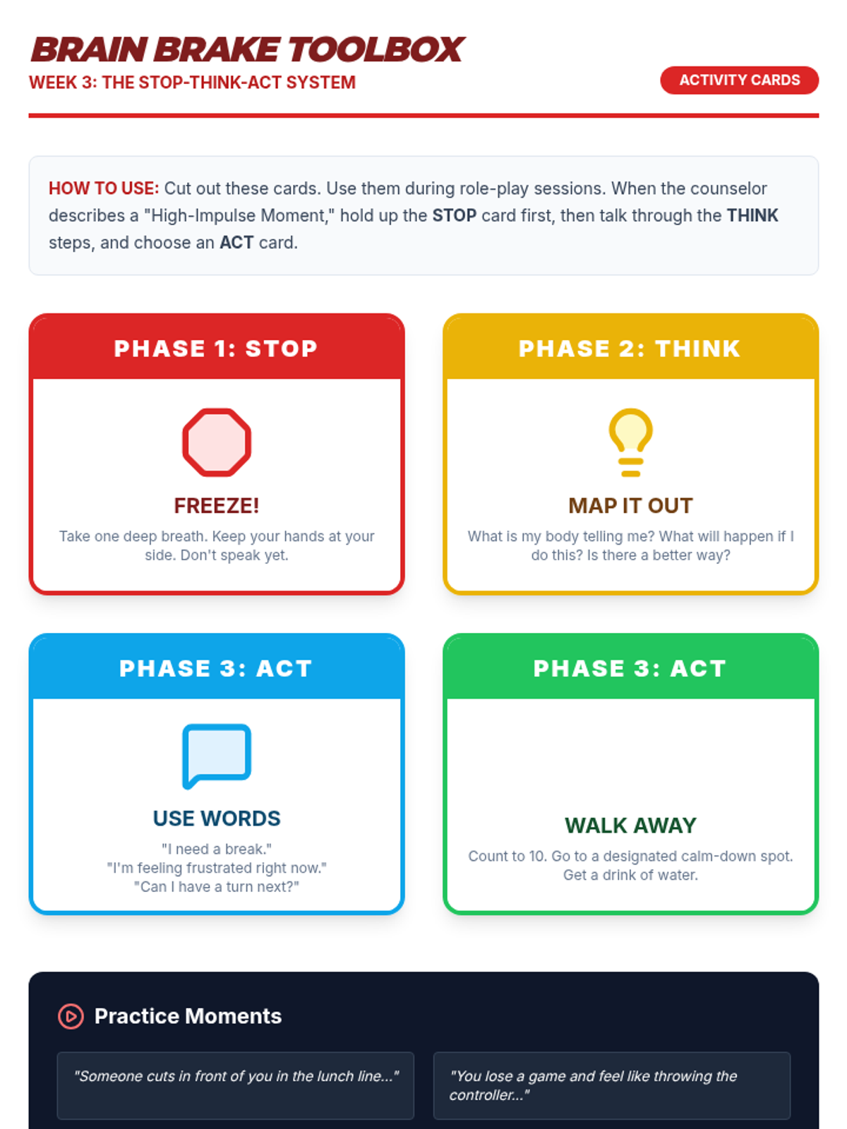 Introduces the 'Stop, Think, Act' technique and other impulse control strategies for high-energy or frustrating moments.