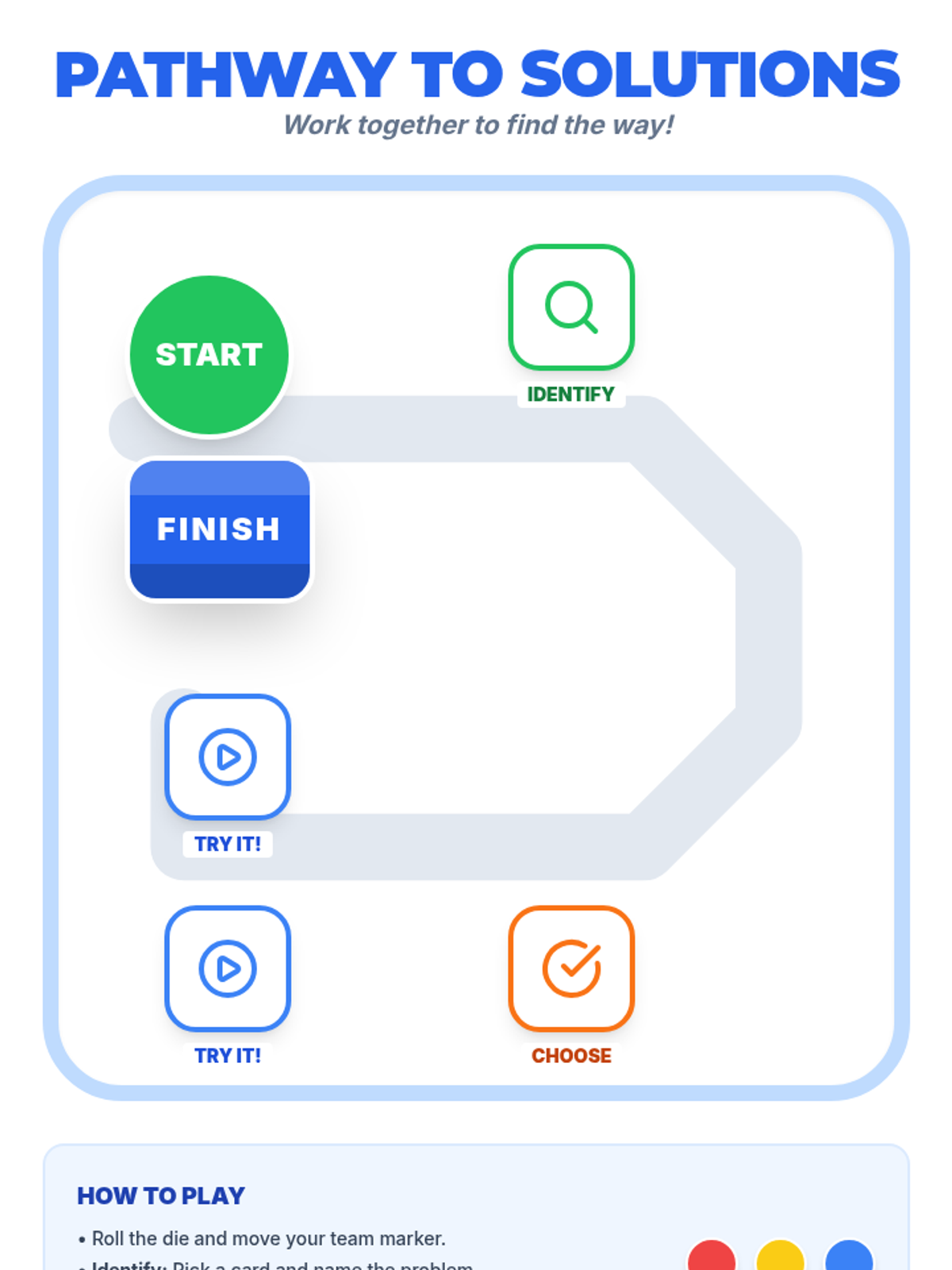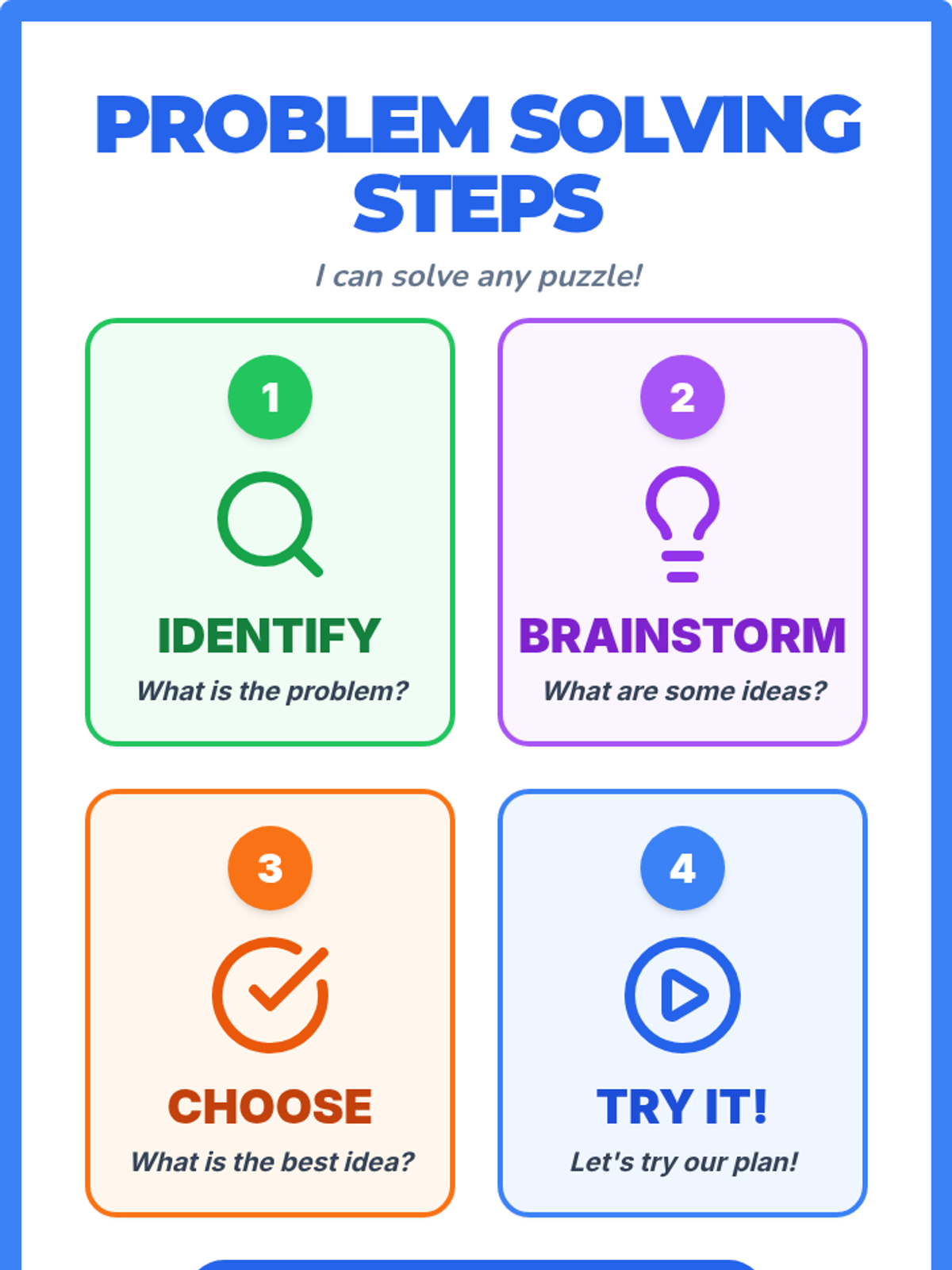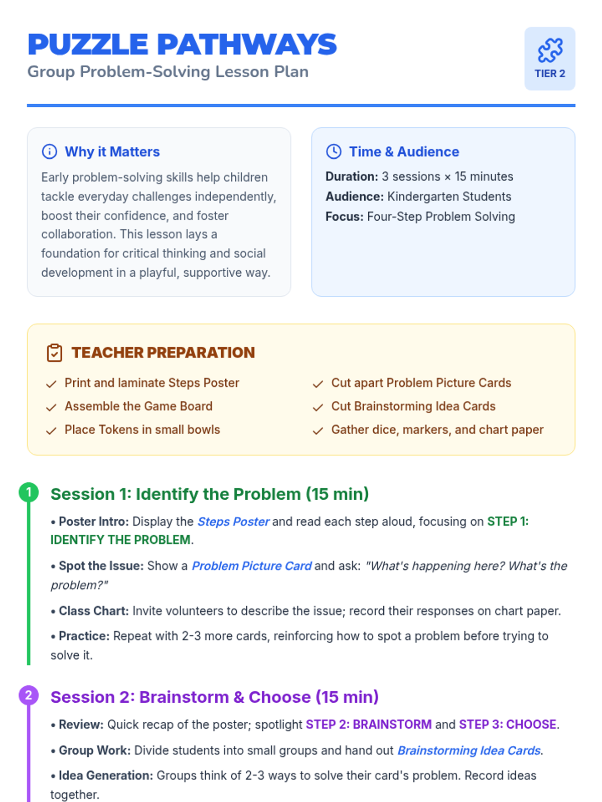 A foundational unit on problem-solving for kindergarteners, focusing on four clear steps: identify, brainstorm, choose, and try. The lesson includes a poster, scenario cards, brainstorming templates, and a collaborative board game.