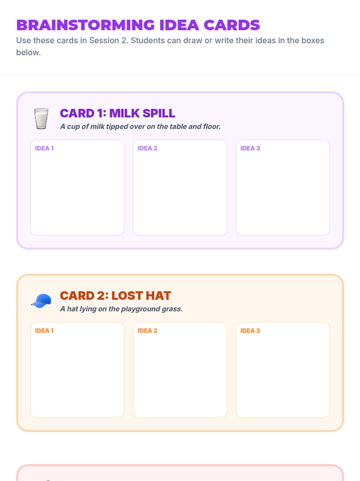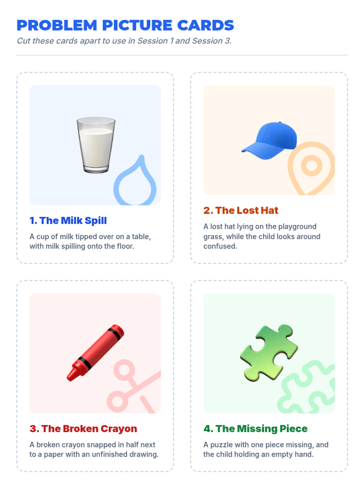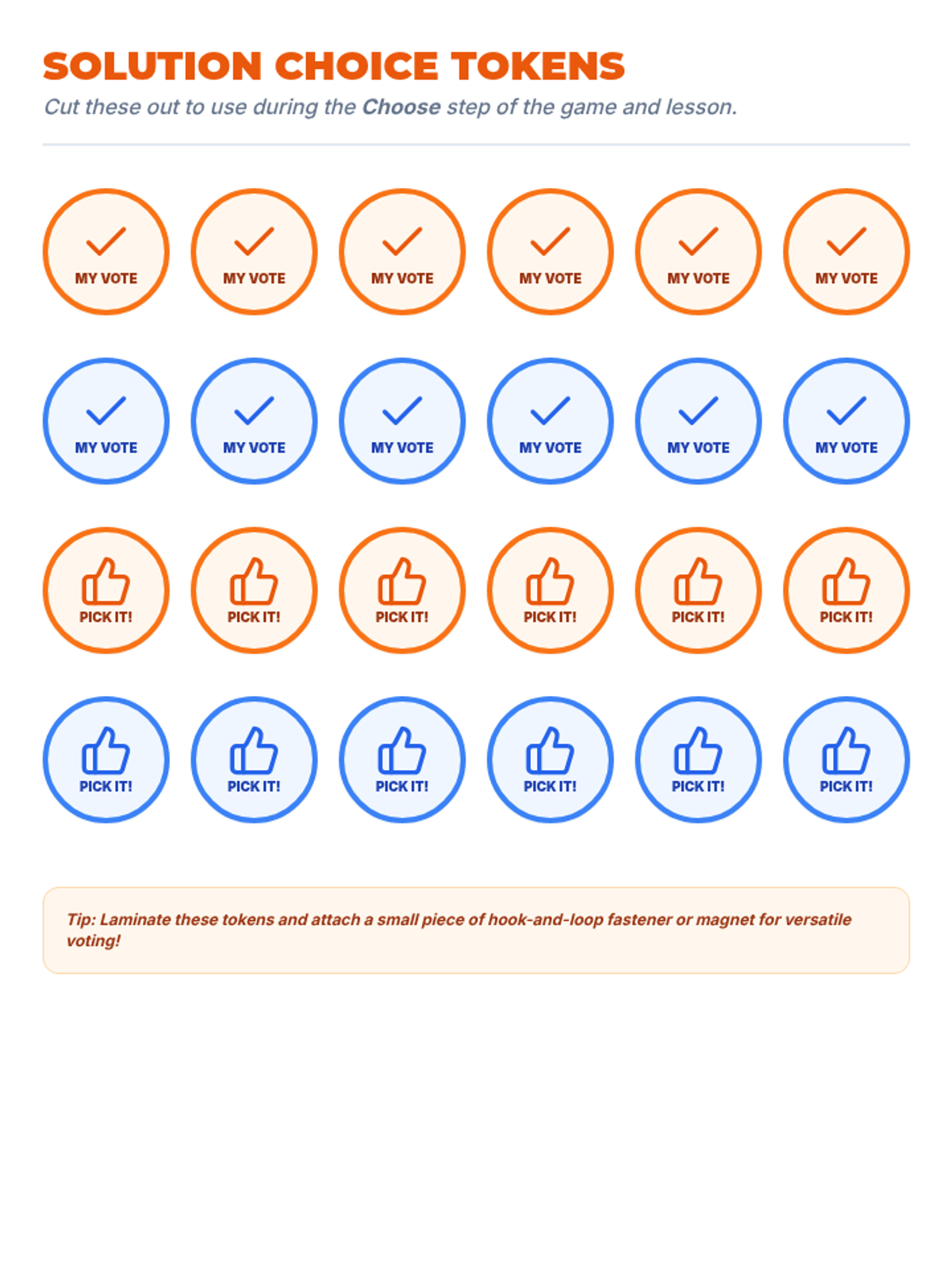 A foundational unit on problem-solving for kindergarteners, focusing on four clear steps: identify, brainstorm, choose, and try. The lesson includes a poster, scenario cards, brainstorming templates, and a collaborative board game.