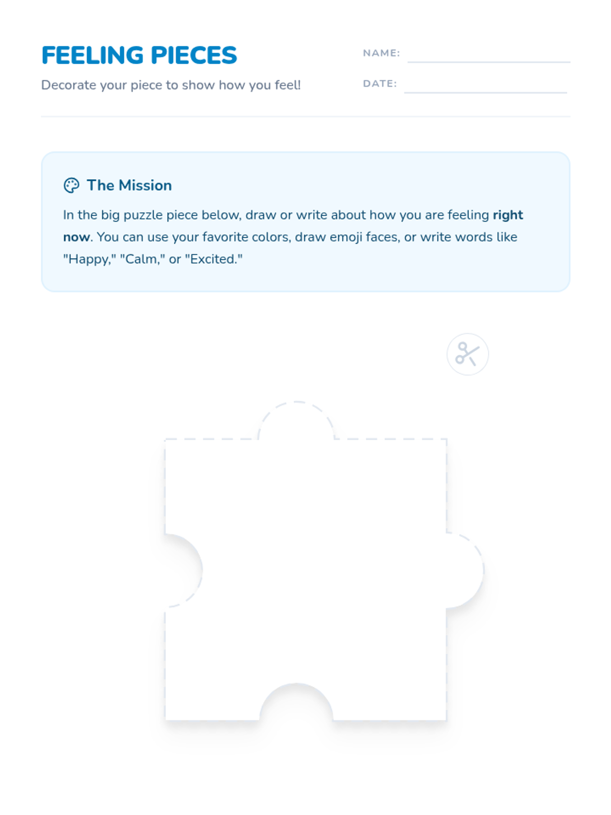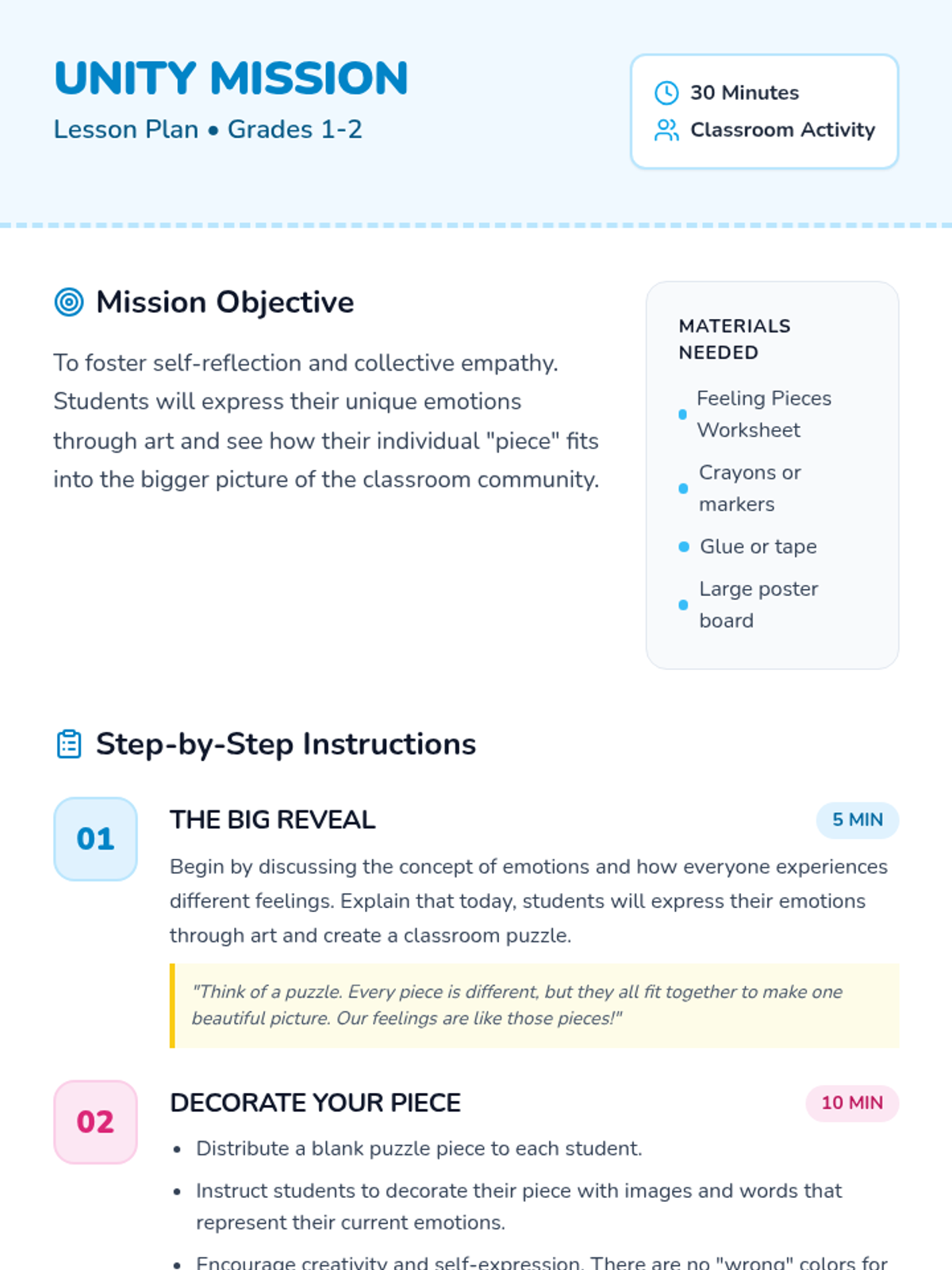 A SEL lesson for grades 1-2 where students decorate puzzle pieces to represent their emotions and assemble them into a classroom mural to foster empathy and unity.