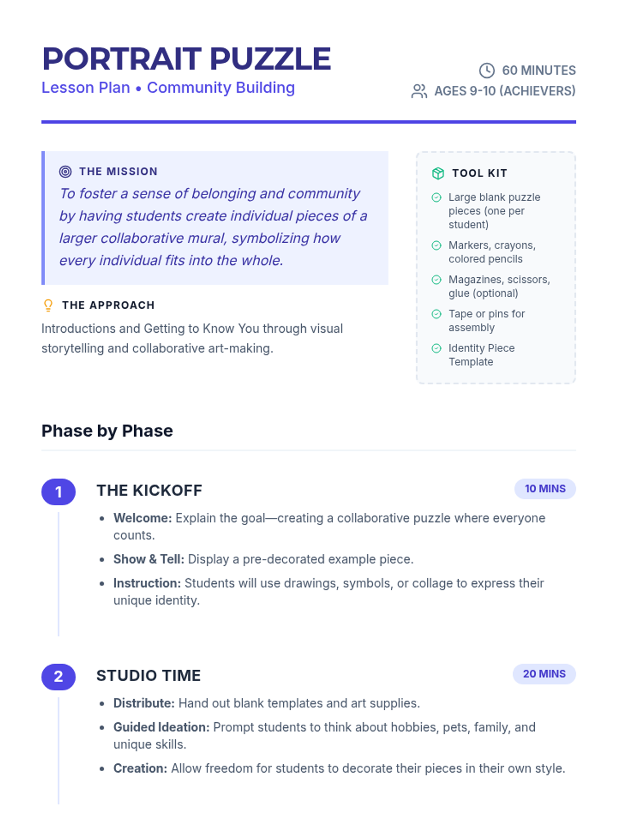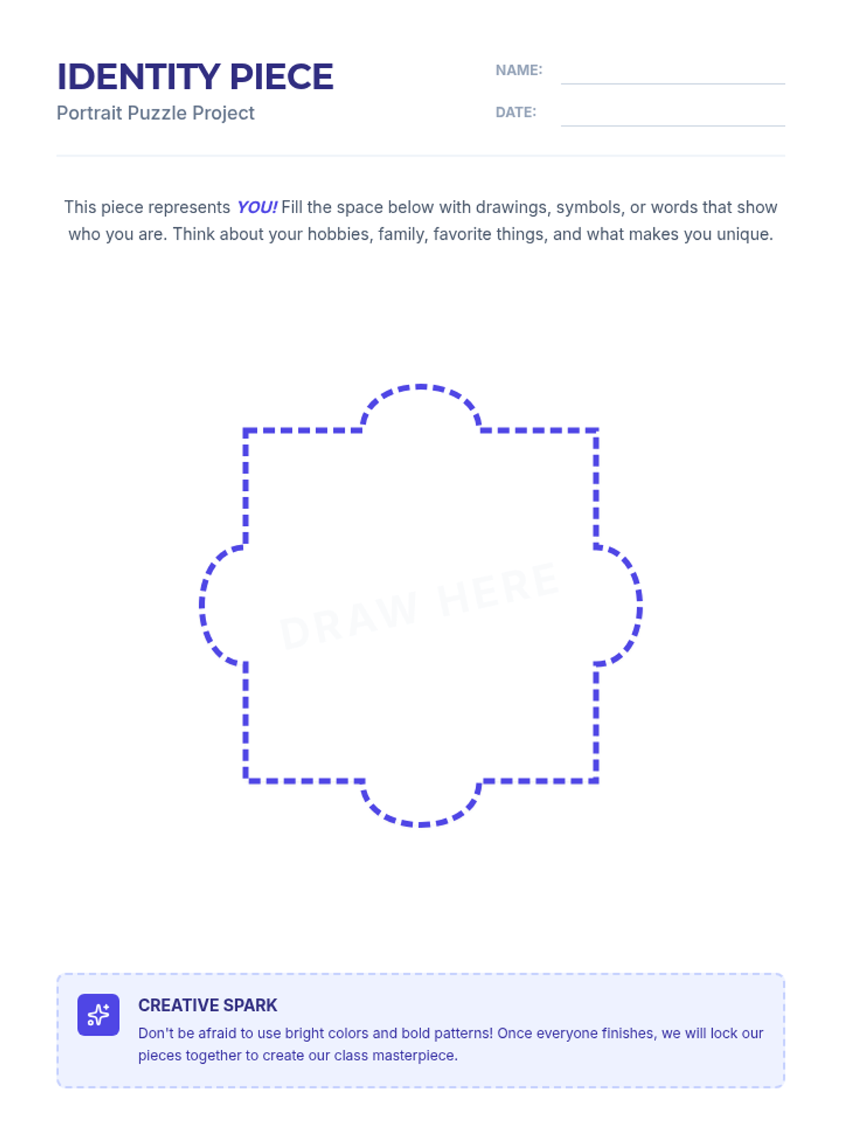 A collaborative art lesson where students design individual puzzle pieces to create a community mural, fostering self-expression and a sense of belonging.