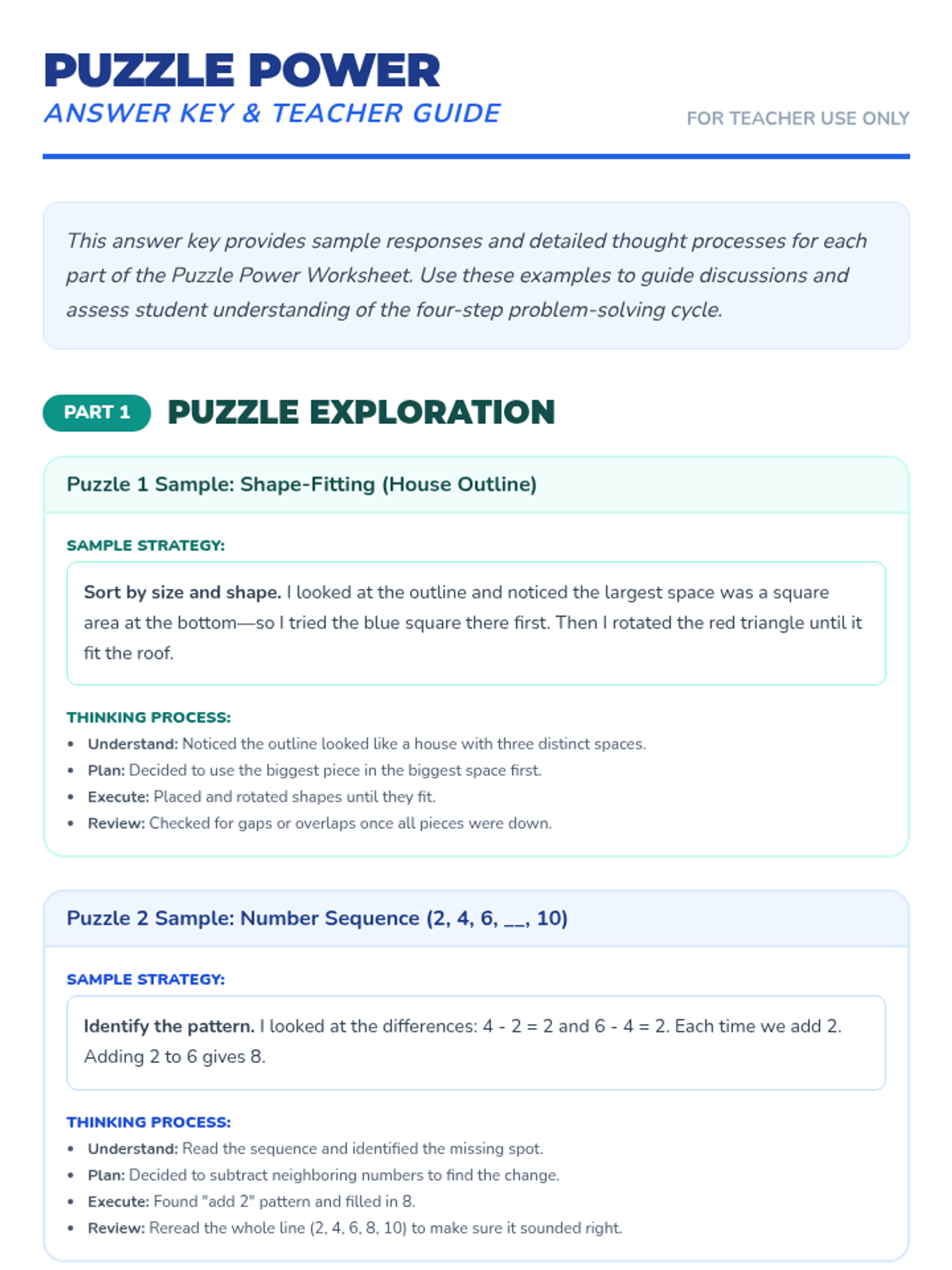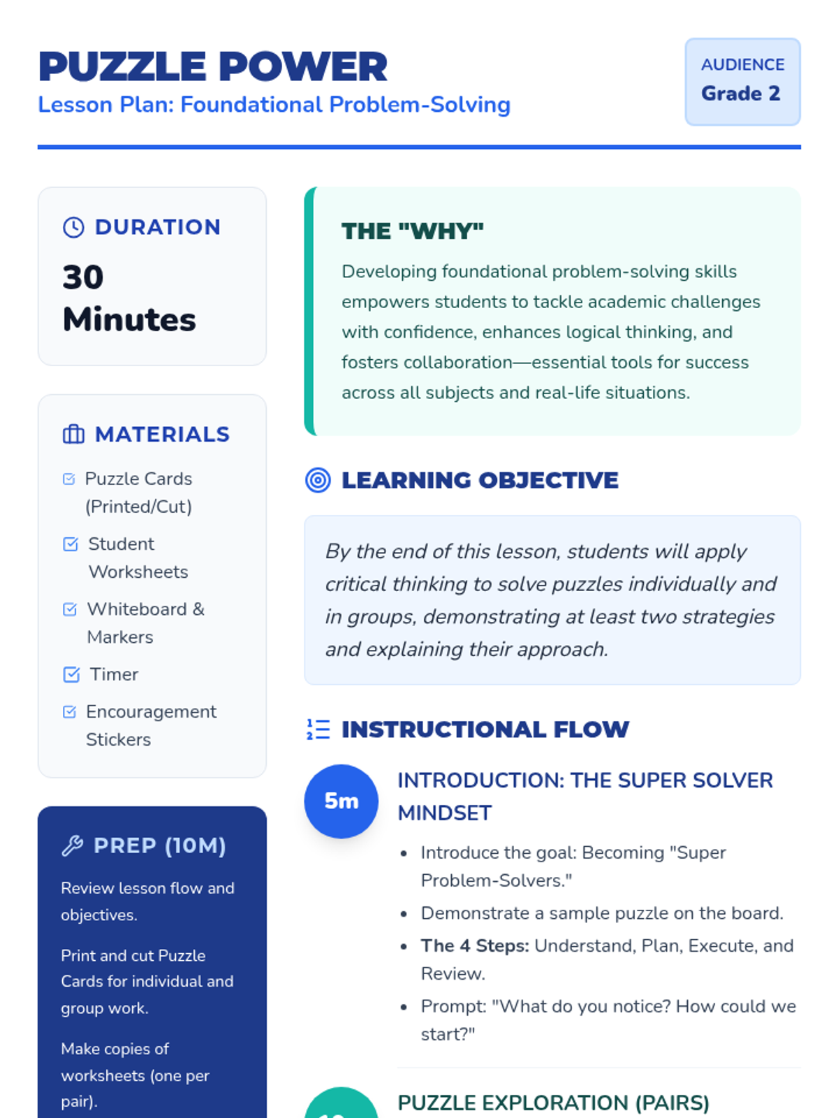 An engaging 30-minute lesson for 2nd graders to develop foundational problem-solving skills through hands-on puzzles and collaboration. Students learn the four-step approach: Understand, Plan, Execute, and Review.