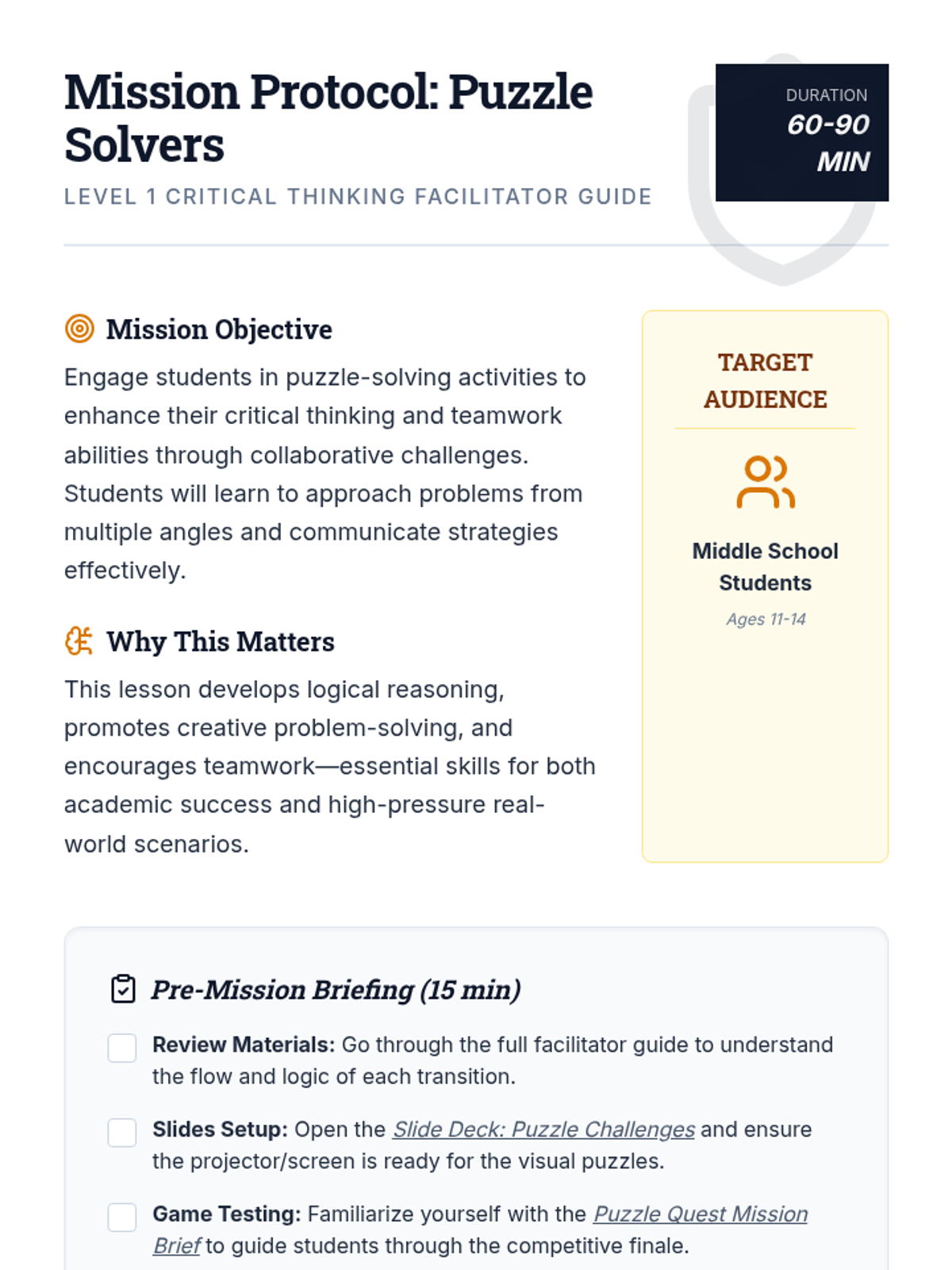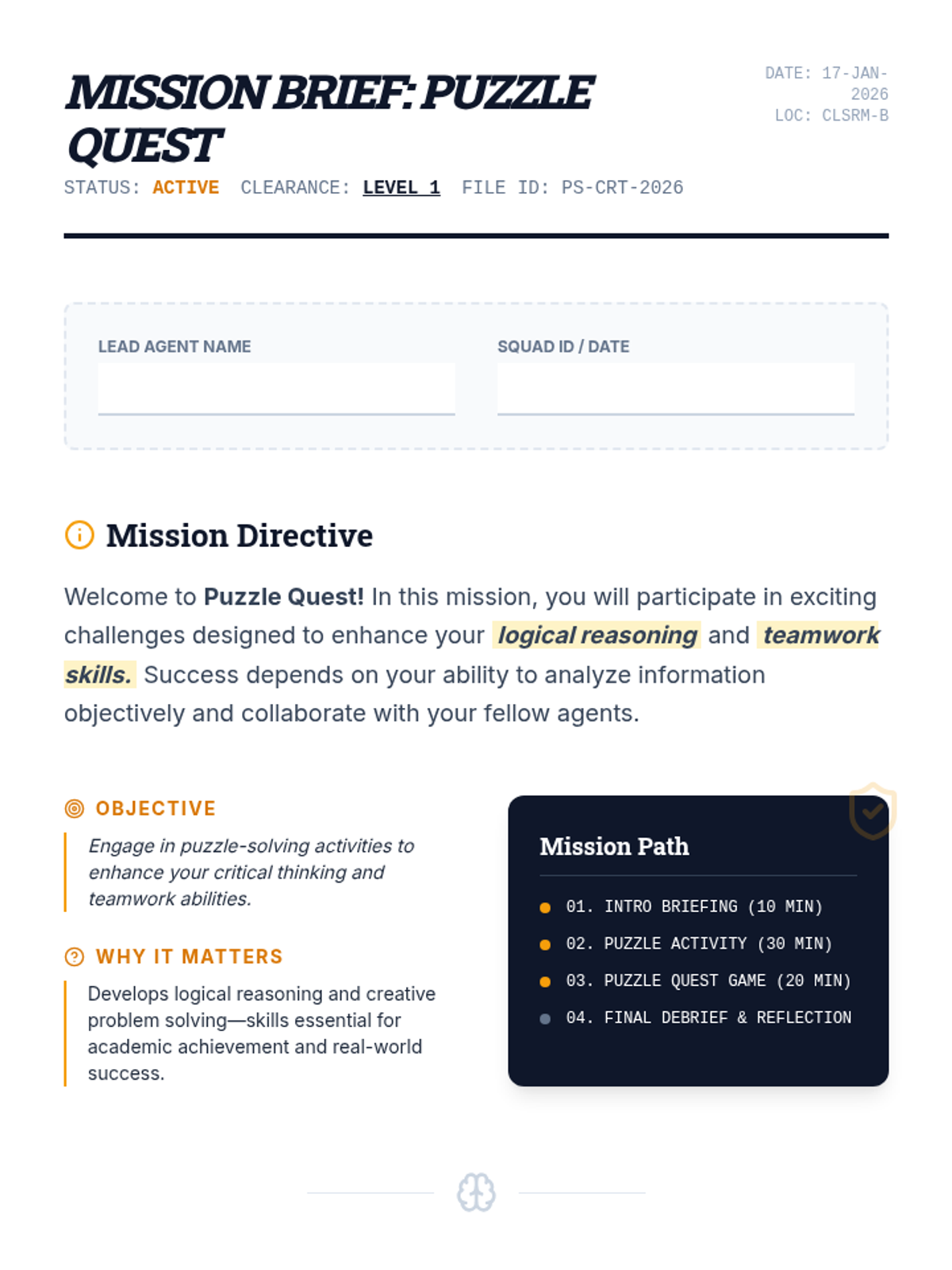 This lesson engages middle school students in critical thinking and collaborative problem-solving through mystery-themed puzzles and a group relay challenge. Students will practice logical reasoning and effective communication while working through various brain teasers and team missions.
