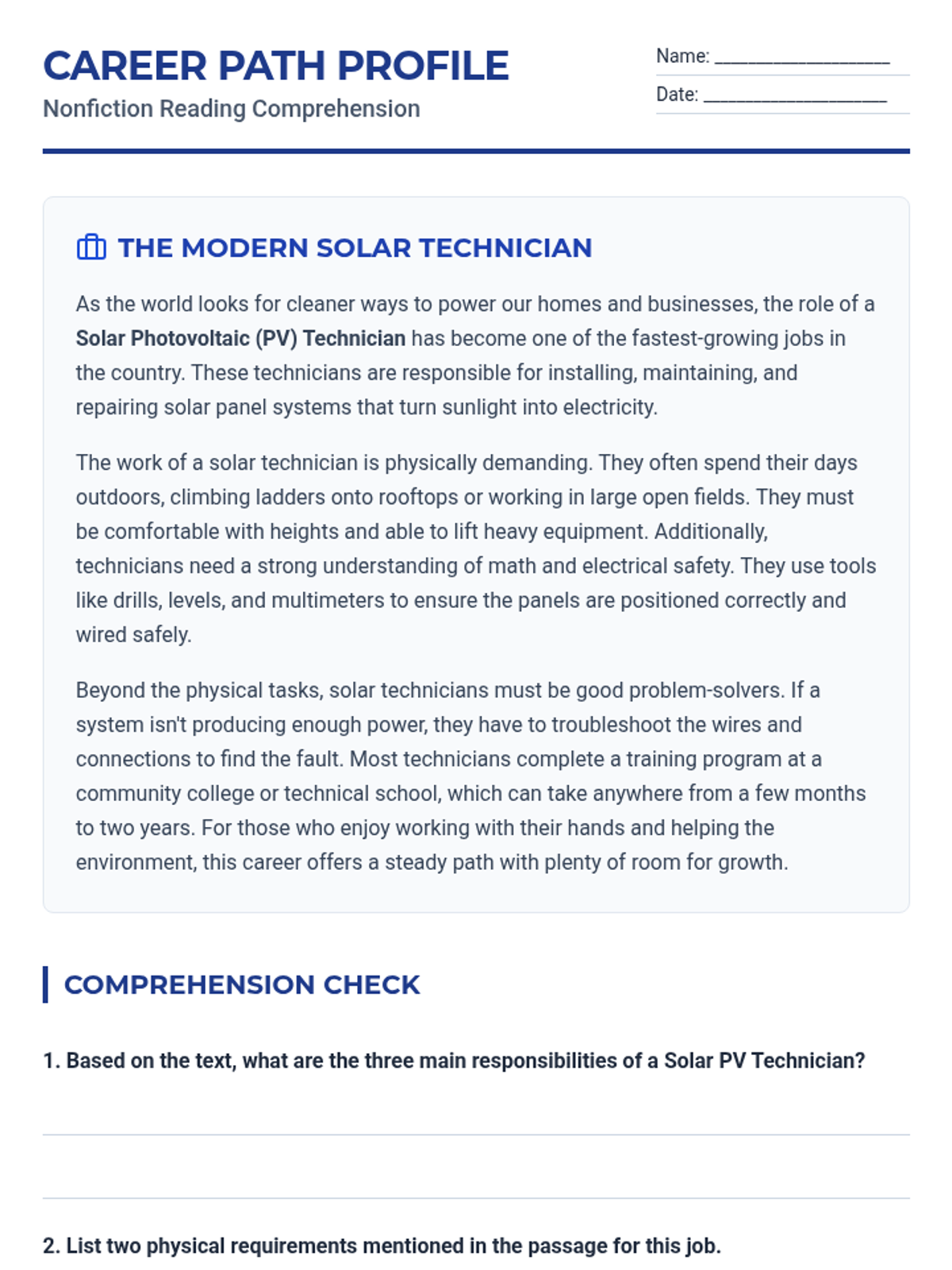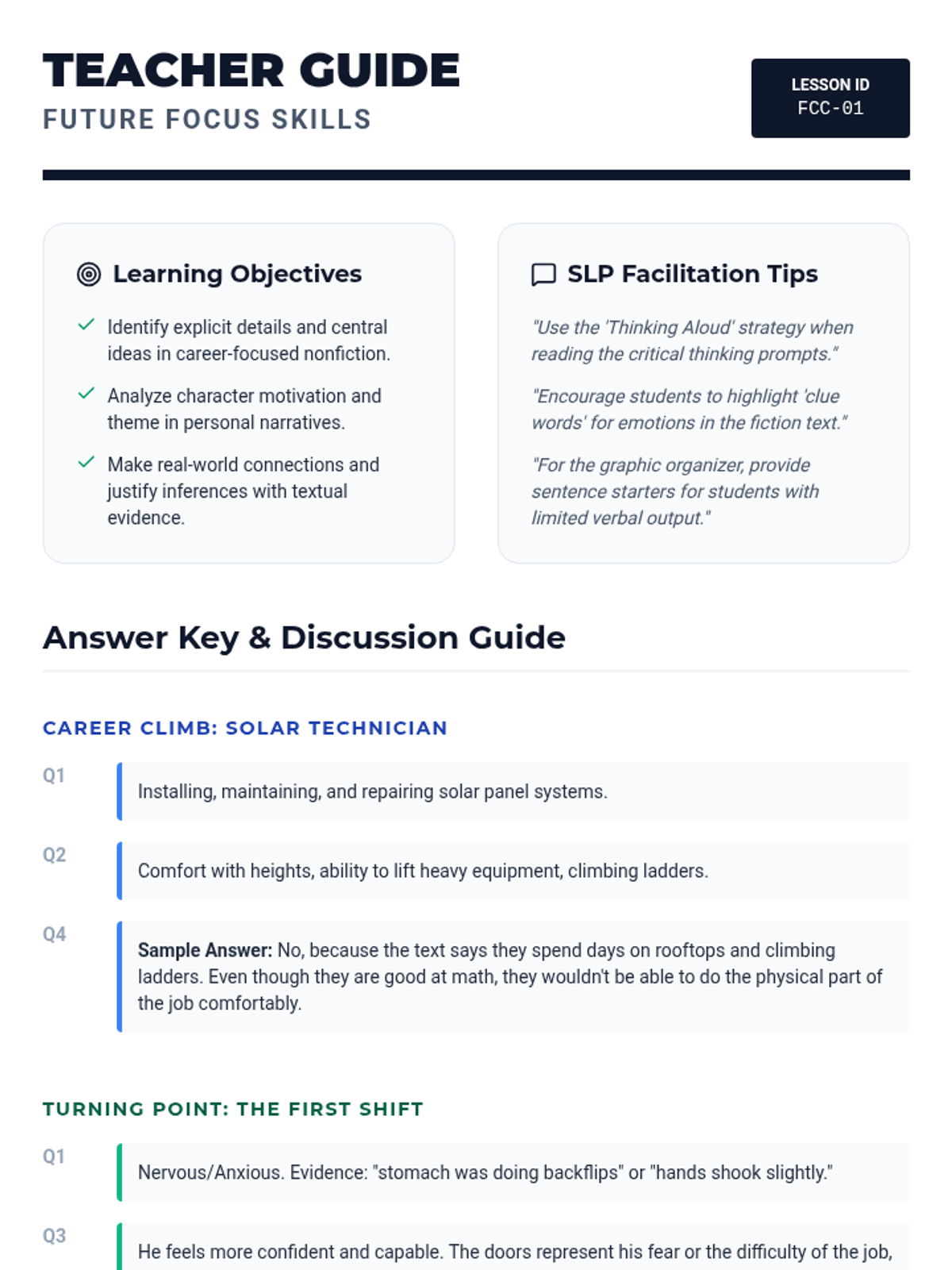 This lesson focuses on developing reading comprehension and critical thinking skills through the lens of career exploration and personal narratives, specifically designed for high school students with special needs. Students will practice identifying key details, making inferences, and connecting text to real-world scenarios.