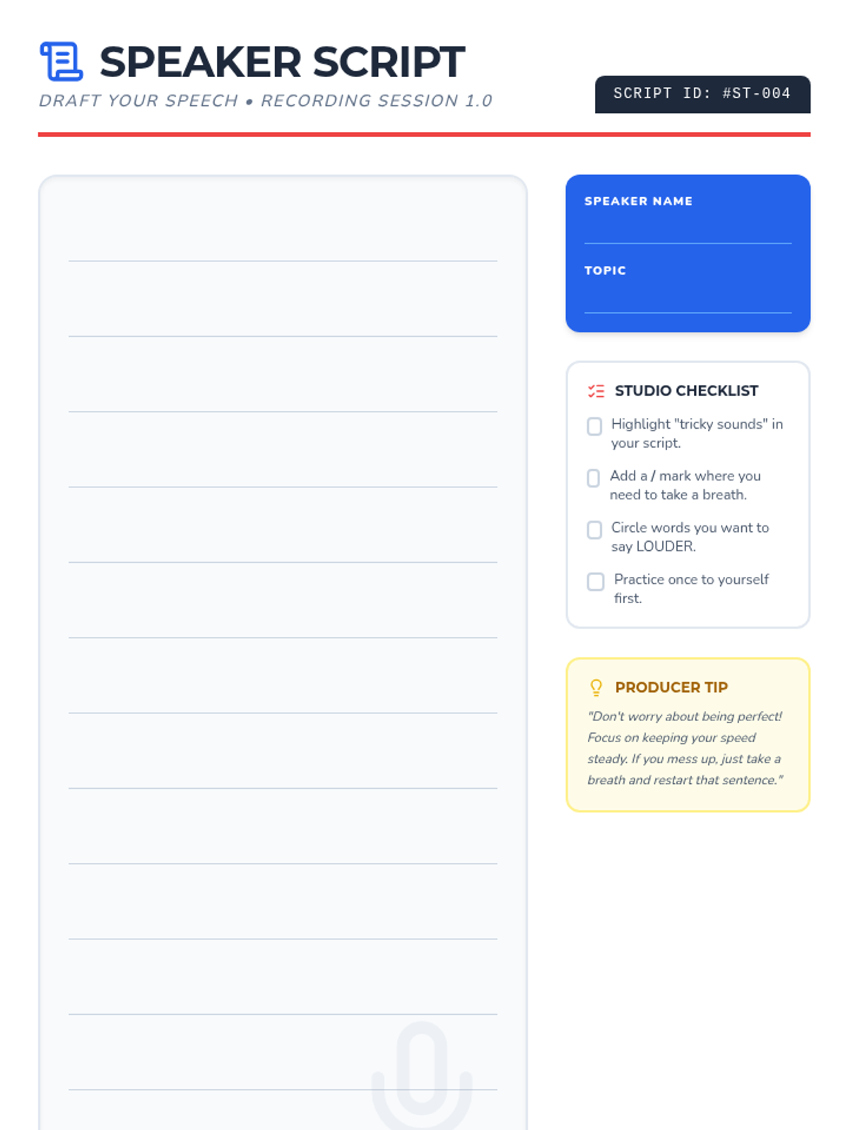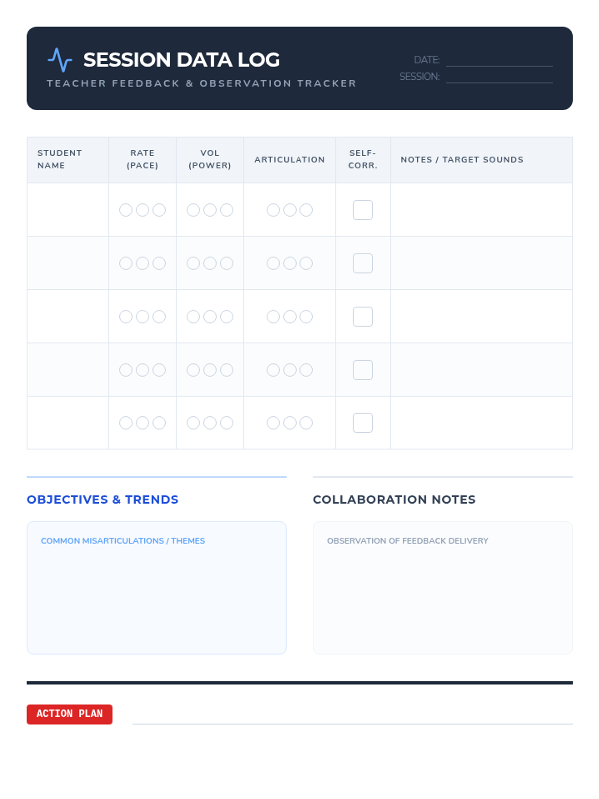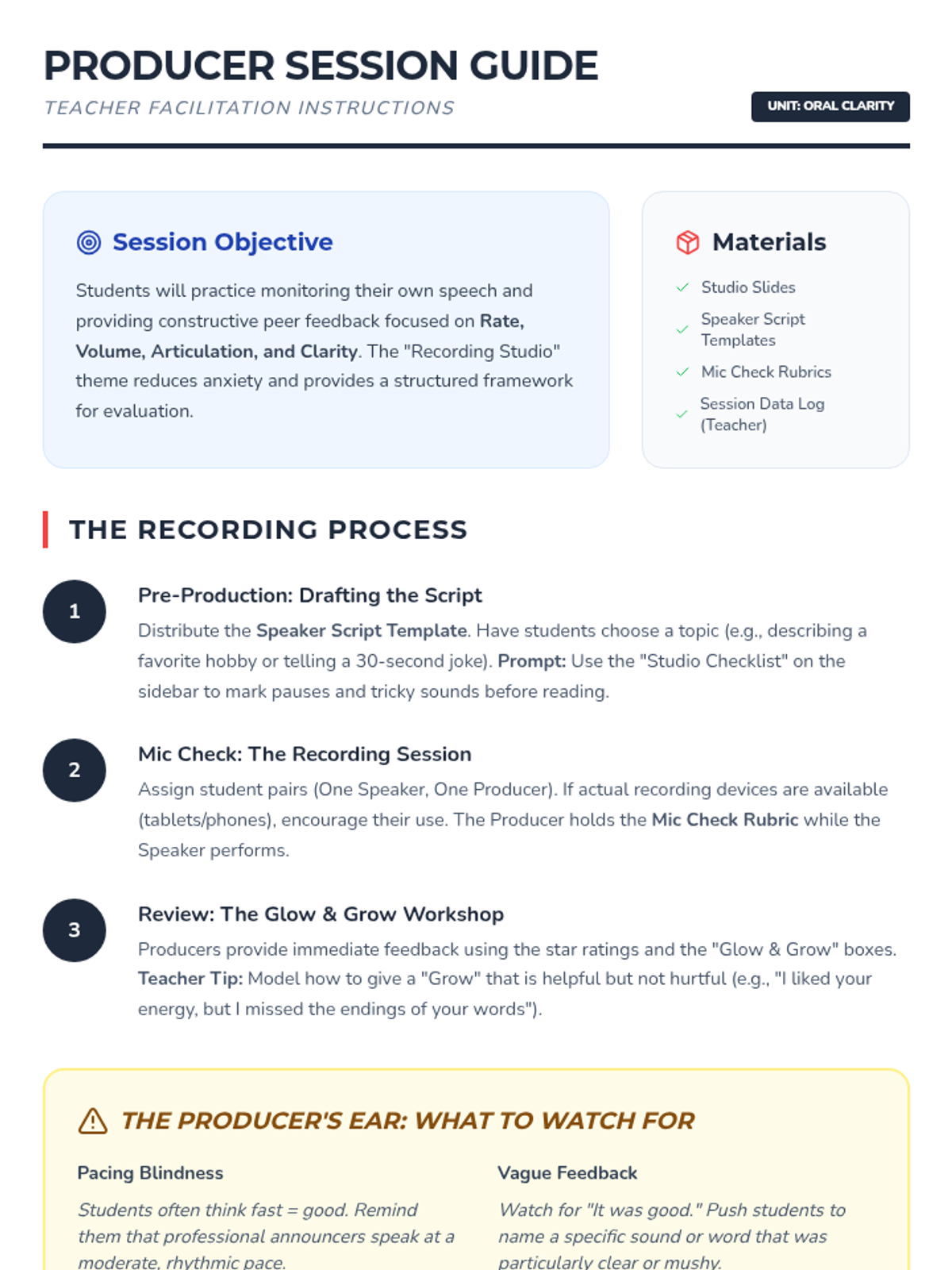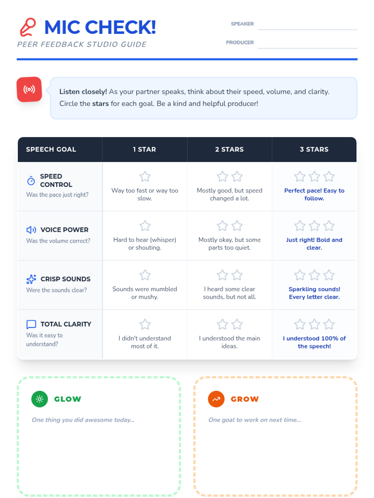 A speech therapy session focusing on oral speaking clarity and peer feedback using a recording studio theme. Students practice speech rate, volume, and articulation.