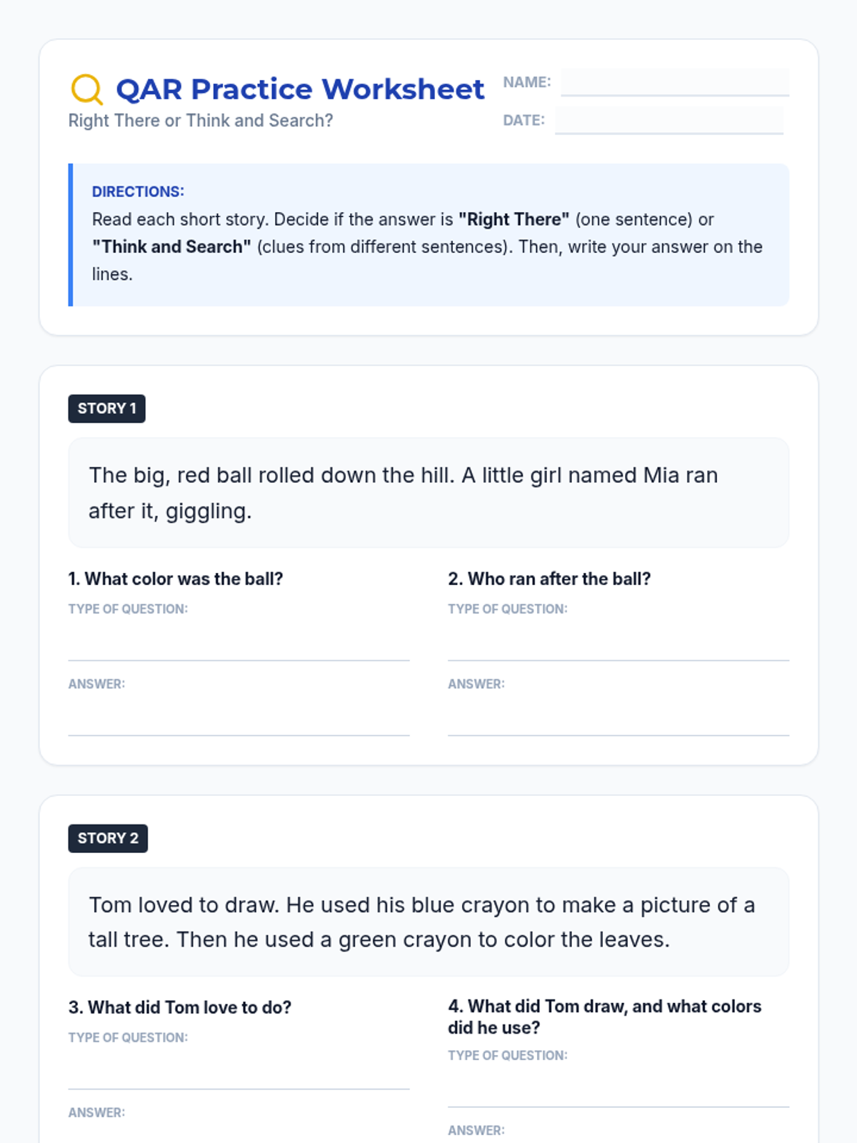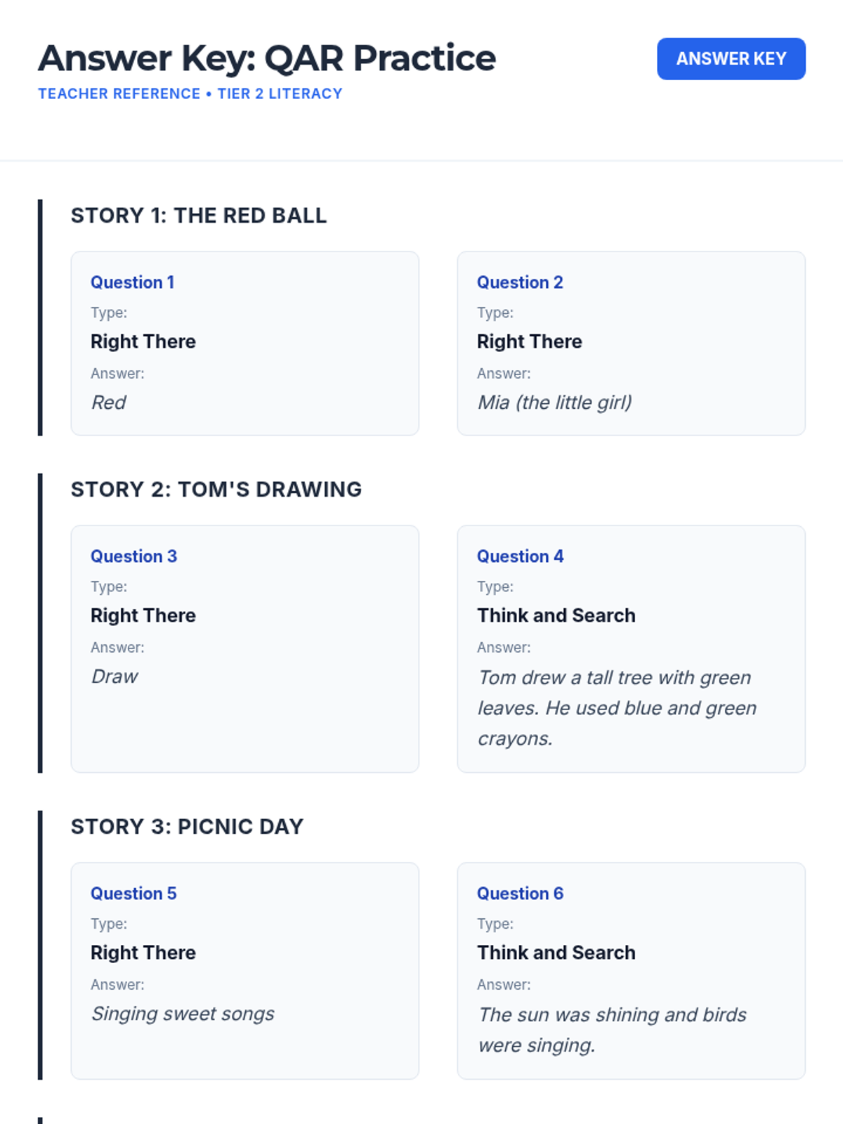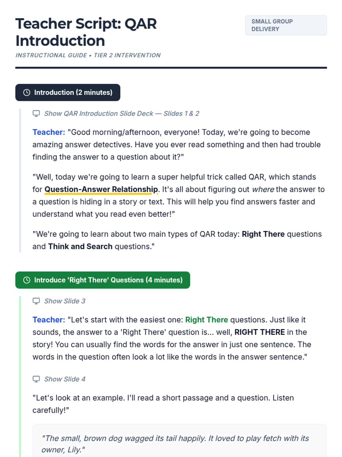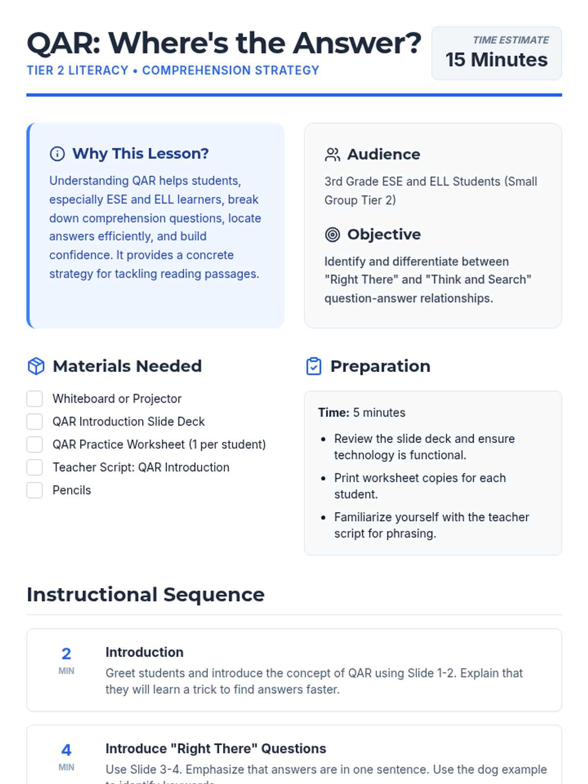 A 15-minute Tier 2 group lesson introducing 3rd-grade ESE and ELL students to the 'Right There' and 'Think and Search' categories of the Question-Answer Relationship (QAR) strategy.