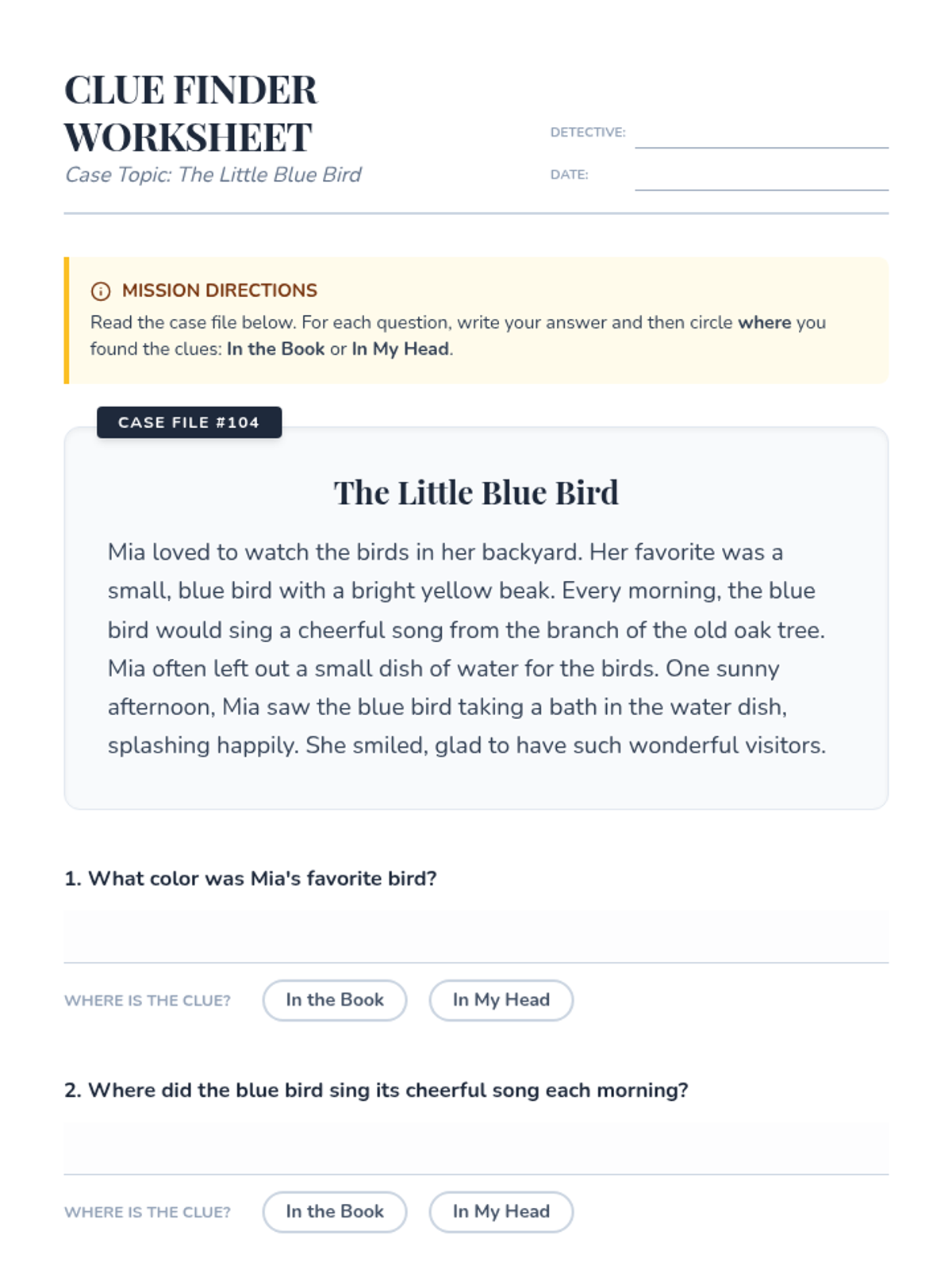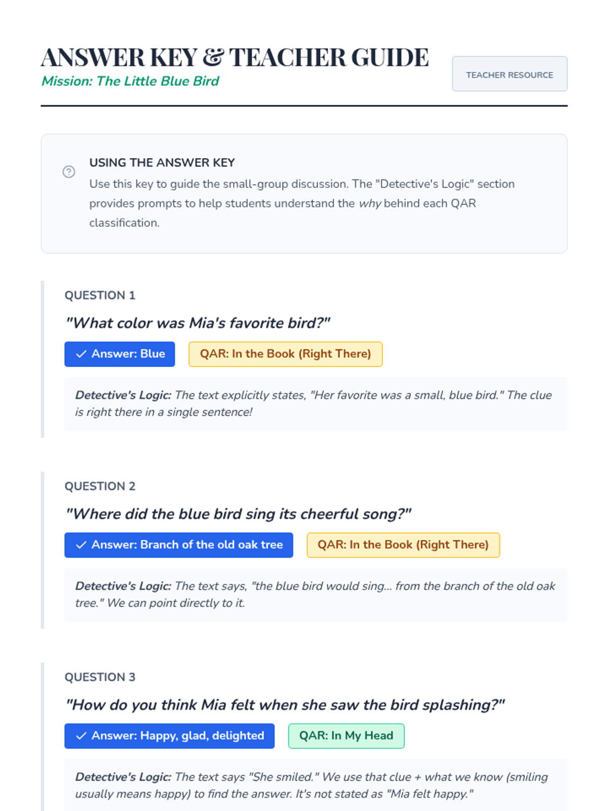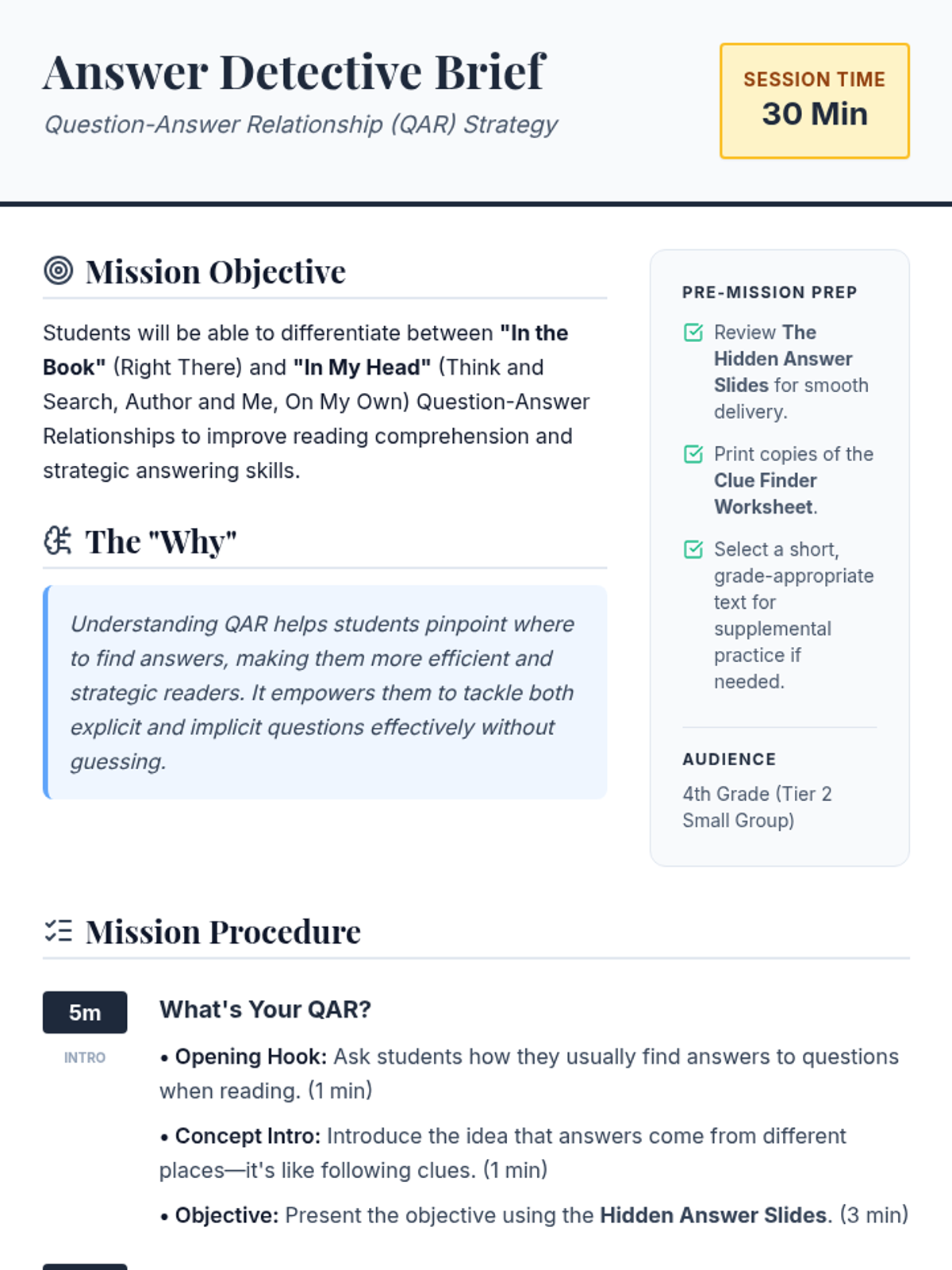 This lesson introduces 4th-grade students to the Question-Answer Relationship (QAR) strategy, helping them identify whether answers are 'In the Book' or 'In My Head'. Students will use their 'detective' skills to categorize questions and improve their reading comprehension.
