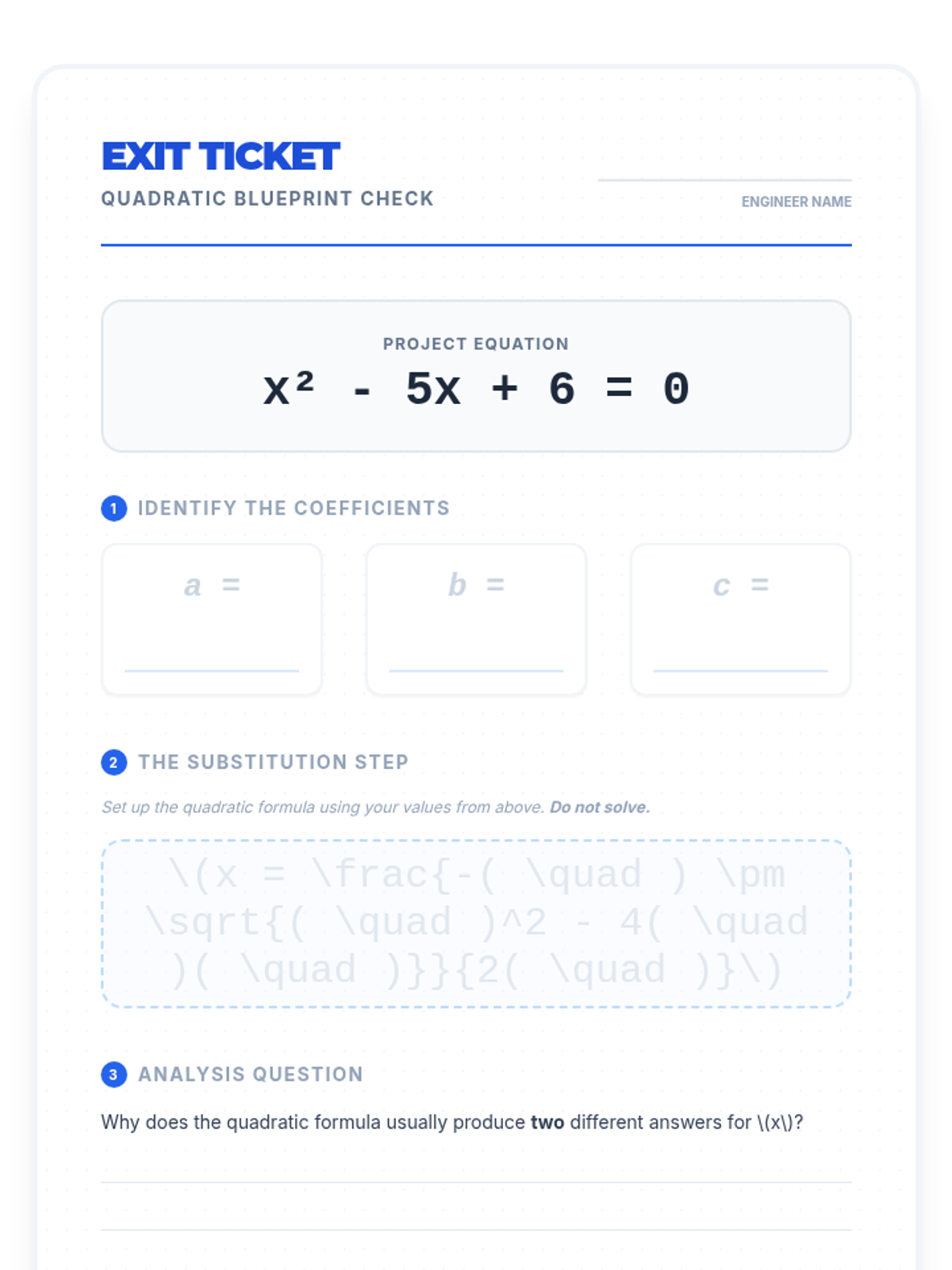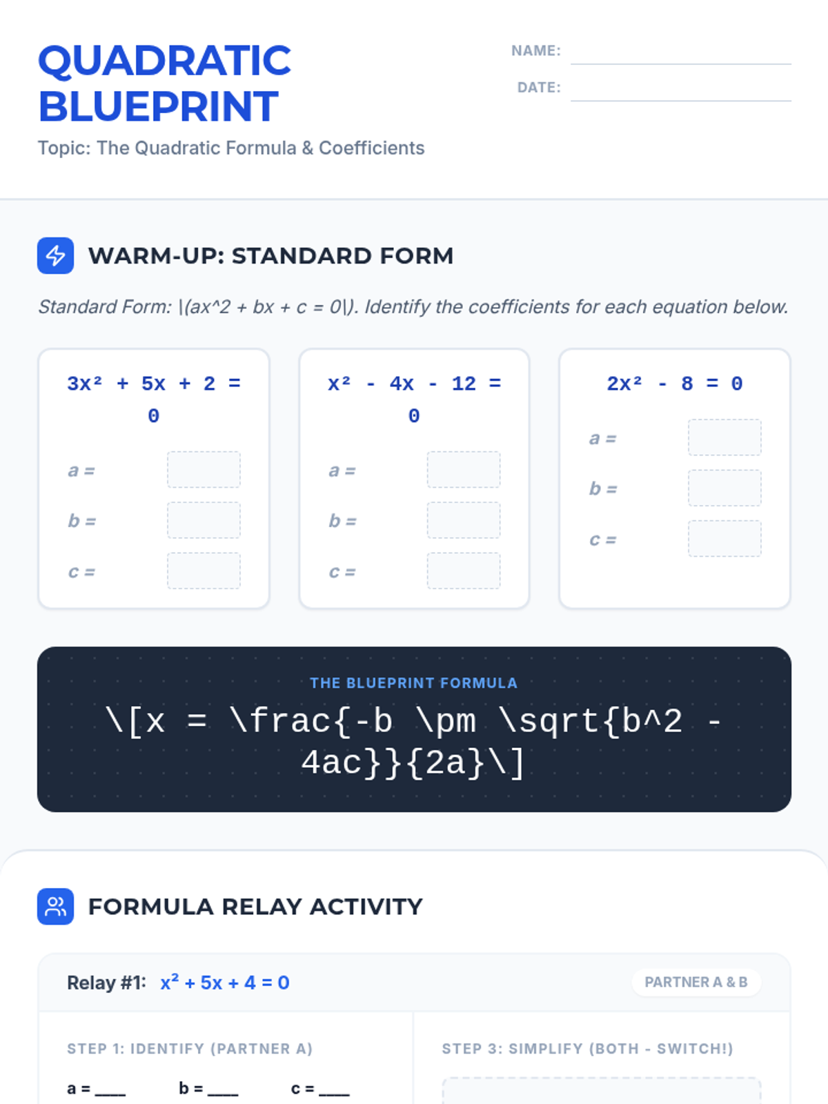 A lesson focused on identifying quadratic coefficients and applying the quadratic formula through a collaborative 'Formula Relay' activity. Students watch a guided video demonstration and practice structured problem-solving in pairs.