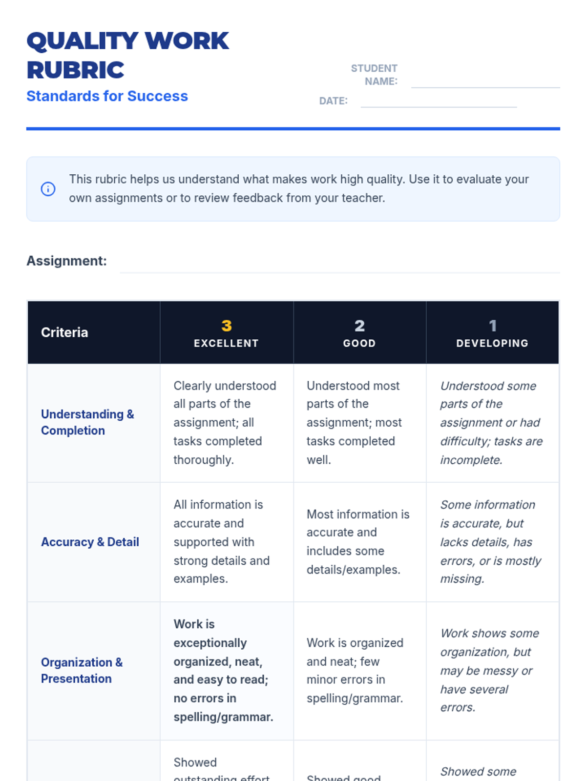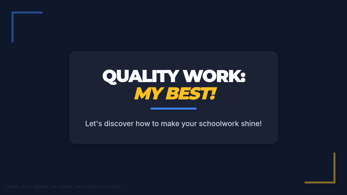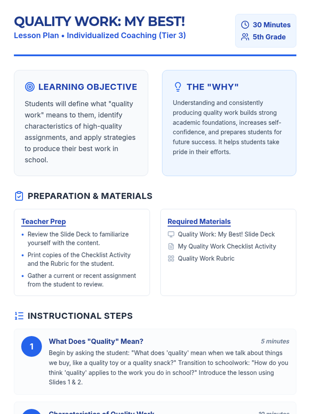 This individualized 30-minute lesson for 5th-grade students focuses on understanding what 'quality work' means and developing strategies to produce it. It's crucial for fostering a sense of pride in achievement and building strong academic habits.
