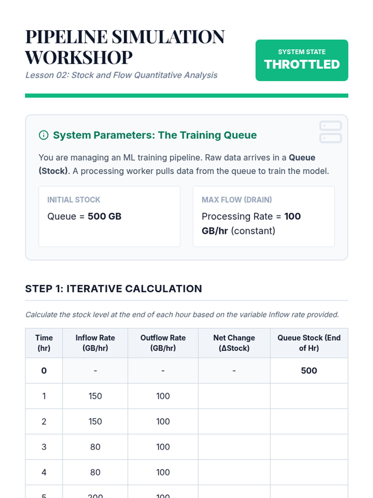 An introduction to quantitative modeling where students convert qualitative loops into stocks and flows to analyze ML pipeline latency and data accumulation.