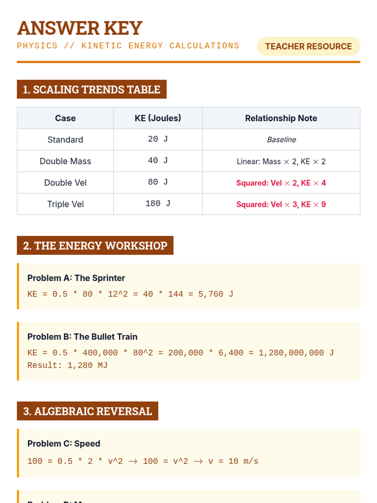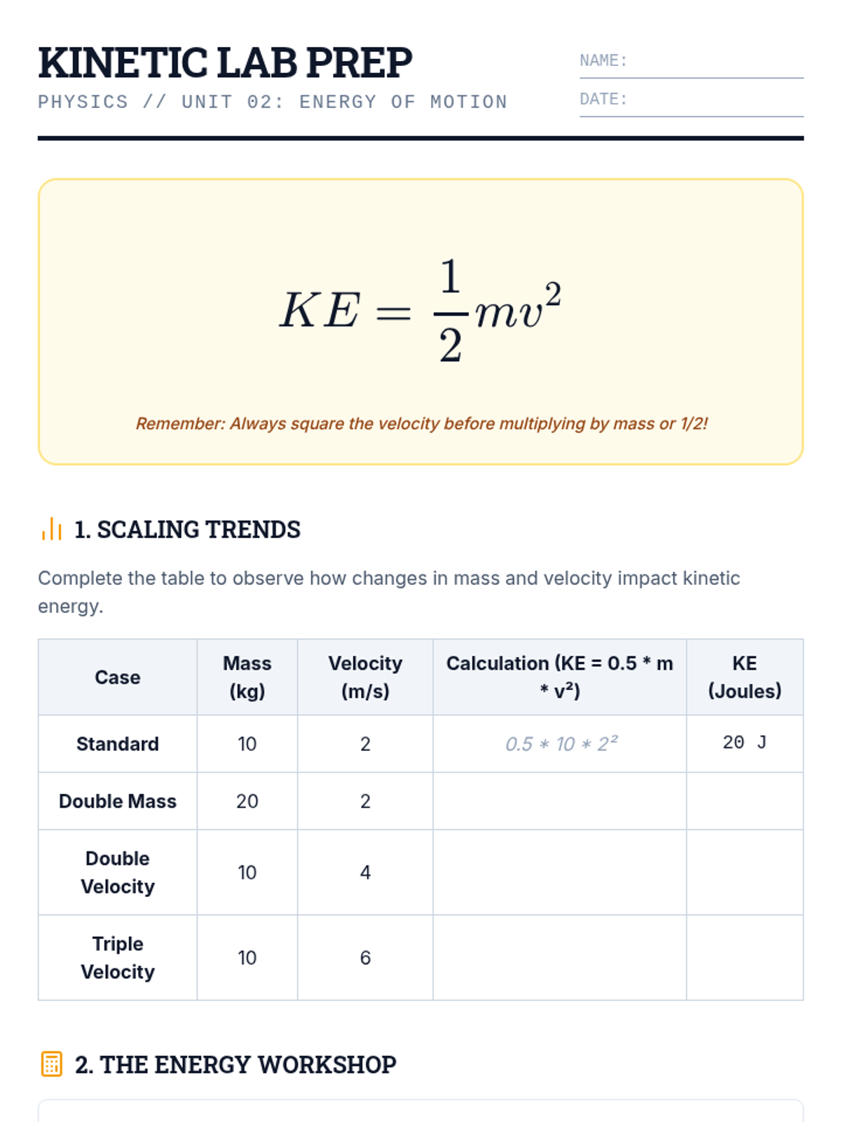 Learners derive the kinetic energy equation and explore the exponential relationship between velocity and energy. The lesson utilizes practice problems to demonstrate how doubling speed impacts energy compared to doubling mass.