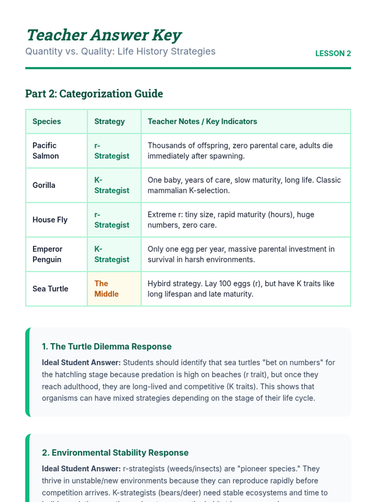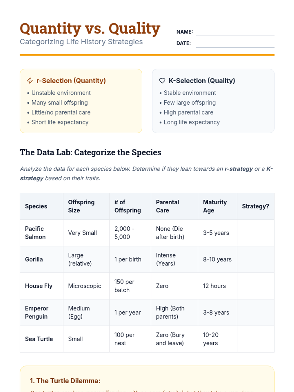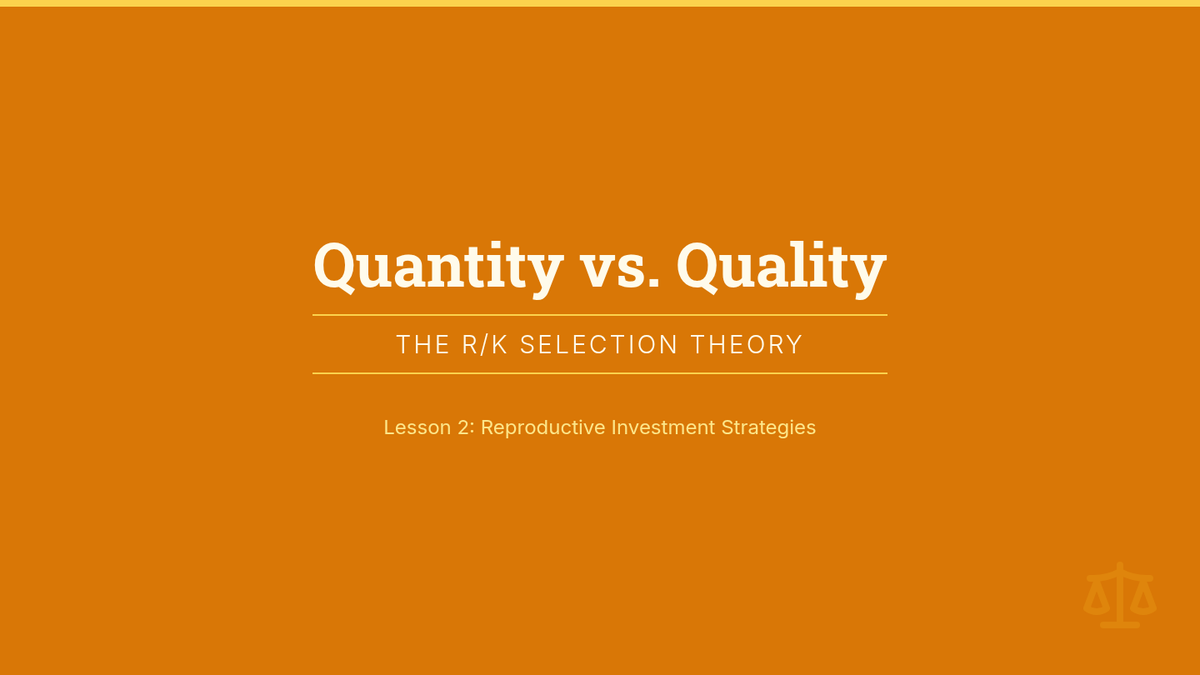 Students learn about reproductive investment strategies, categorizing animals as r-selected or K-selected based on life history data and environmental stability.