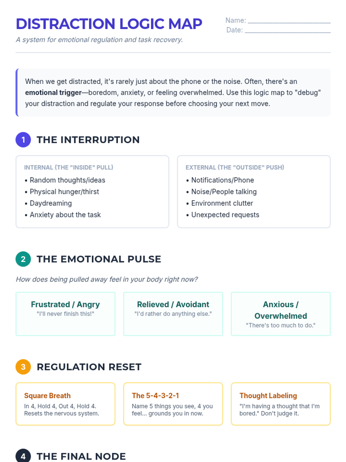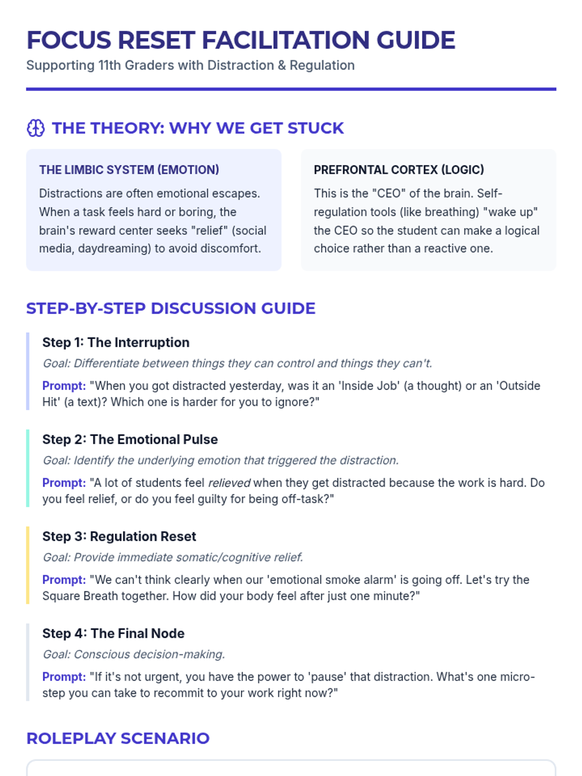 A counseling-focused lesson for high schoolers to navigate the emotional hurdles of being distracted. It features a decision-tree approach to identify emotional triggers and apply regulation strategies to regain focus.