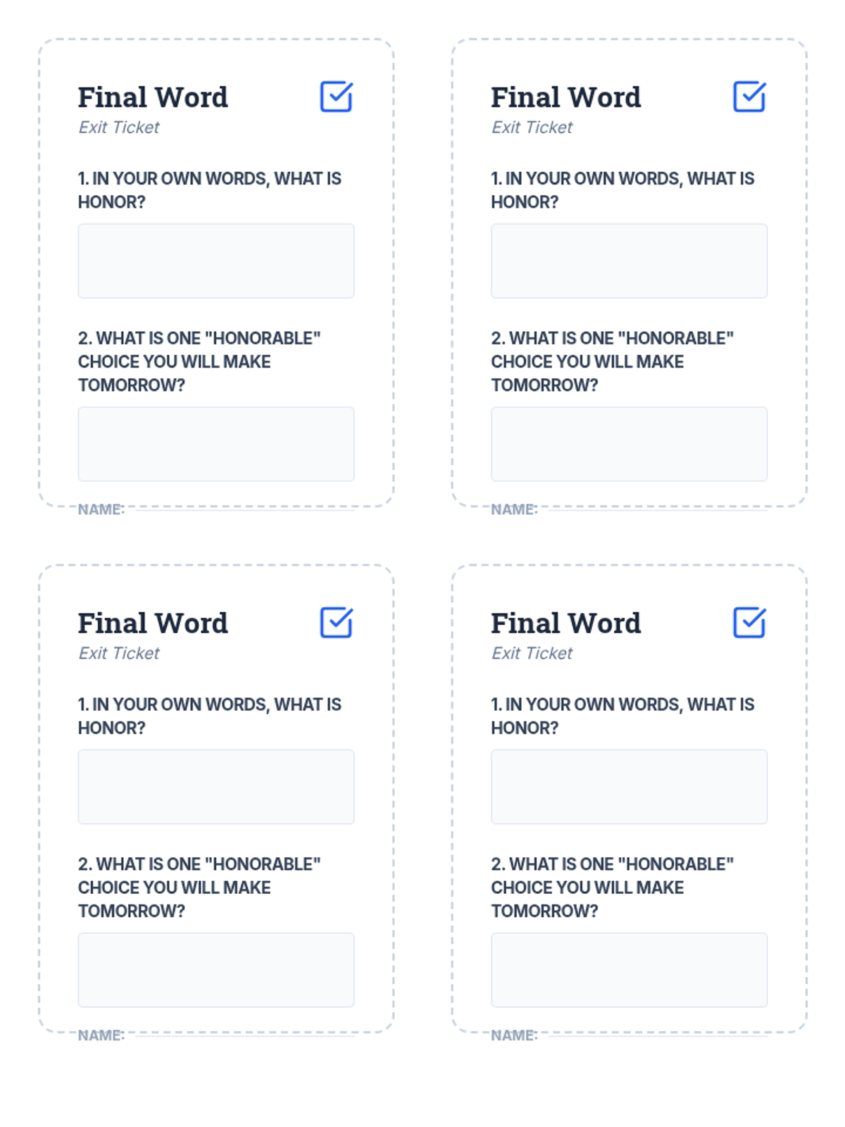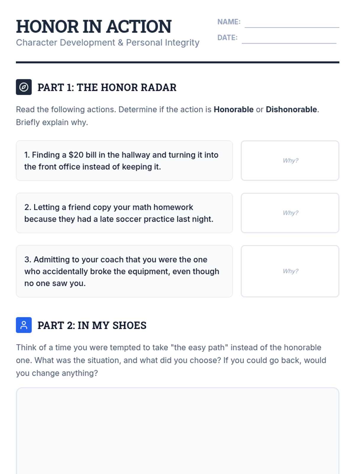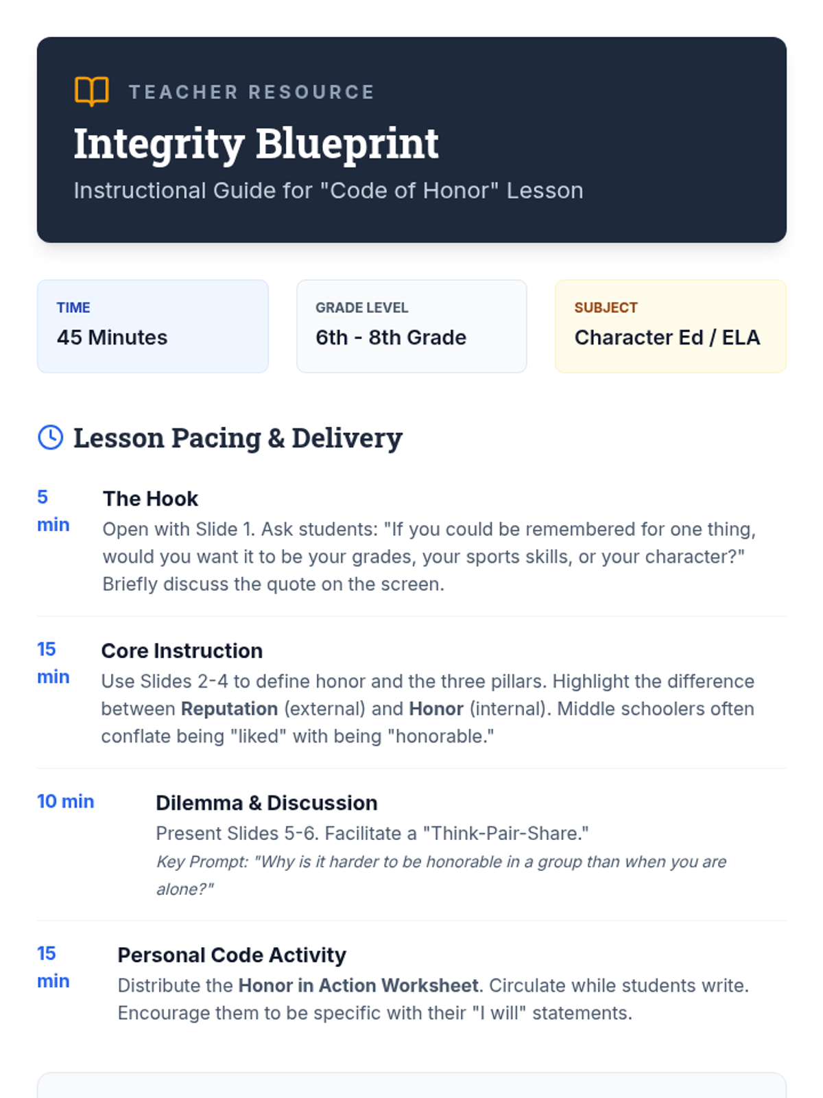 A 45-minute exploration of character and honor designed for middle schoolers. Students will define honor beyond its historical context and apply it to modern social dilemmas.