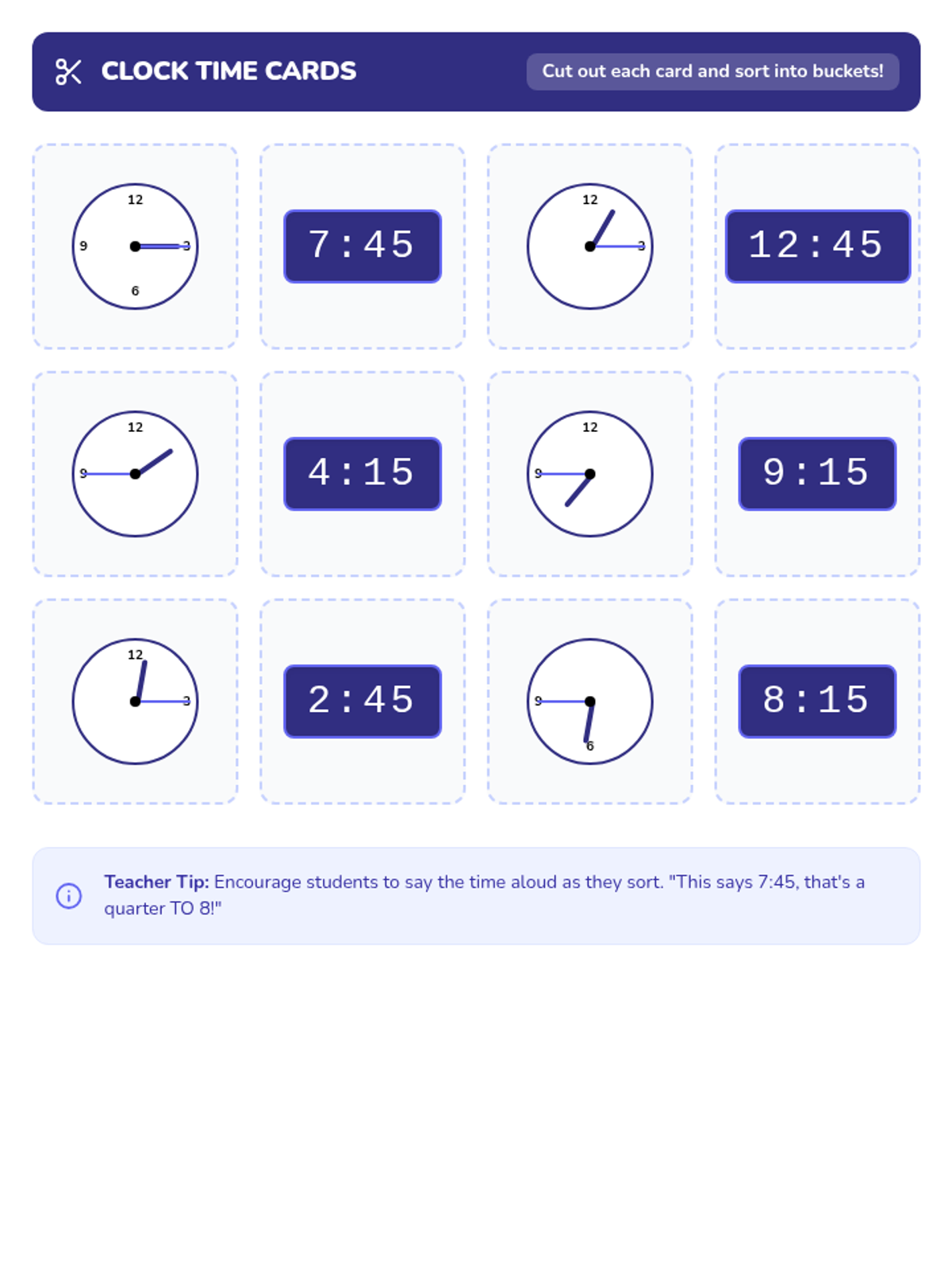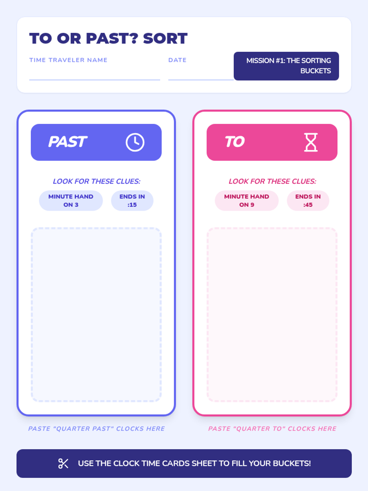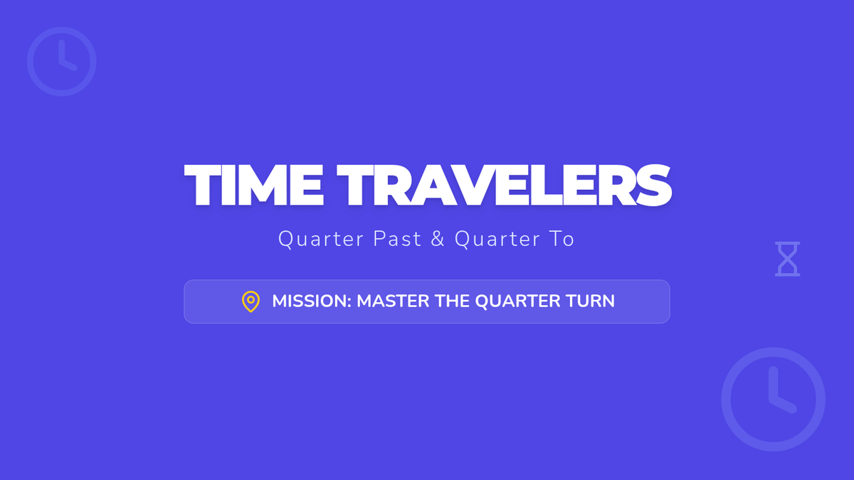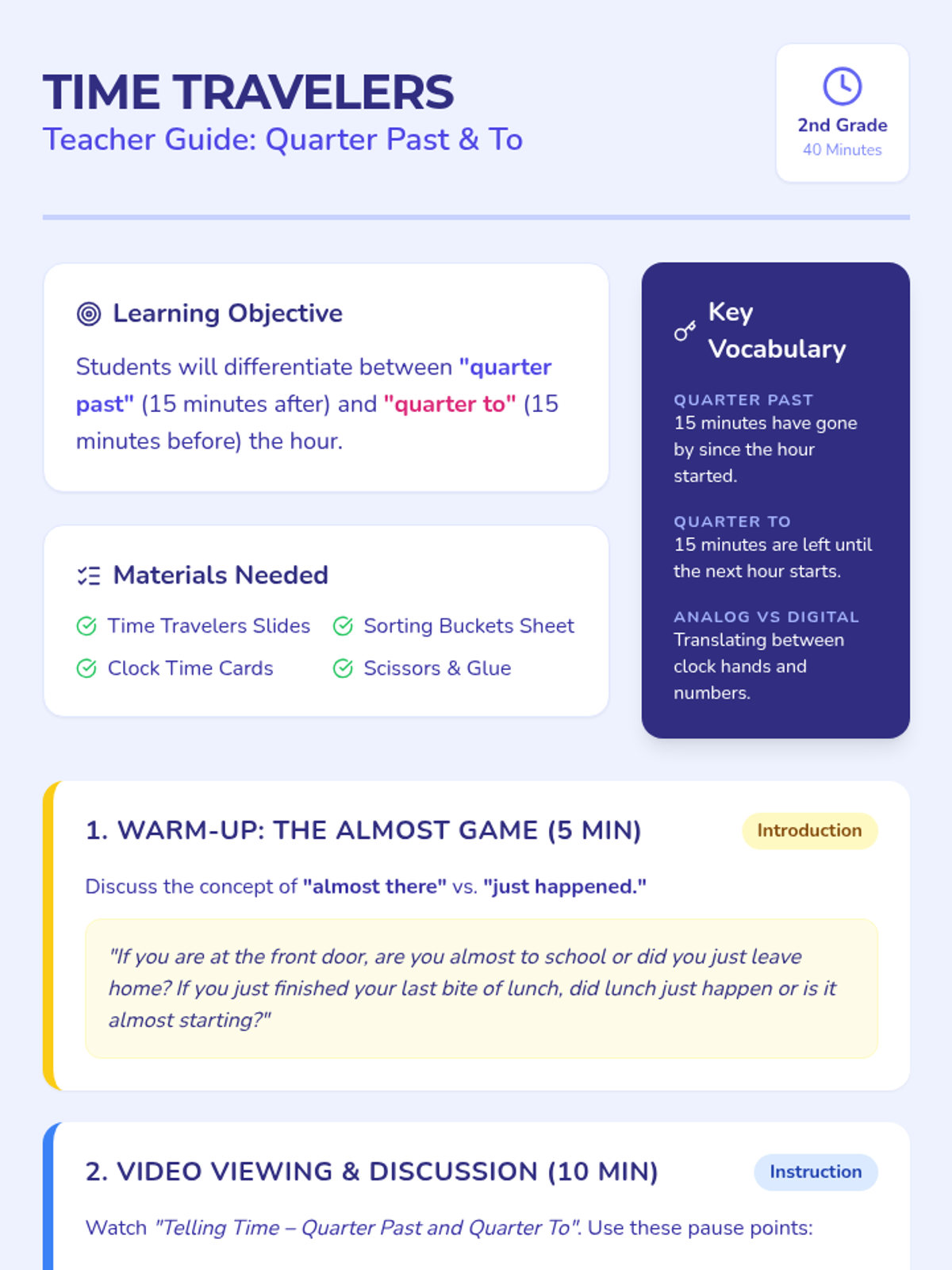 A 2-grade lesson focused on telling time to the quarter hour, specifically differentiating between 'quarter past' and 'quarter to' using a narrative video and a hands-on sorting activity.