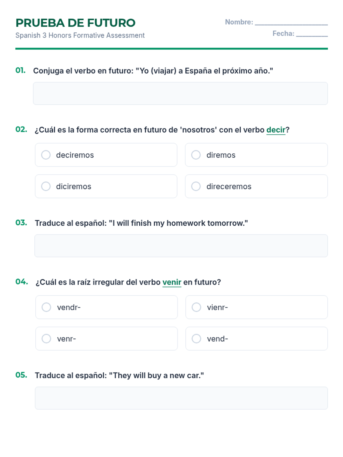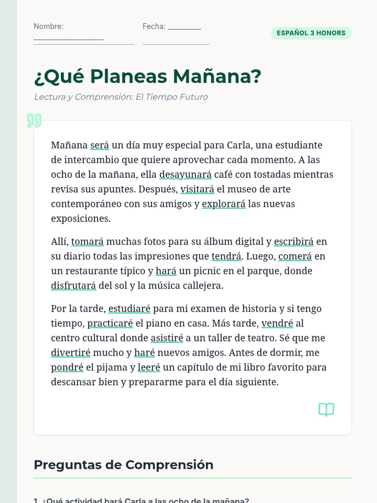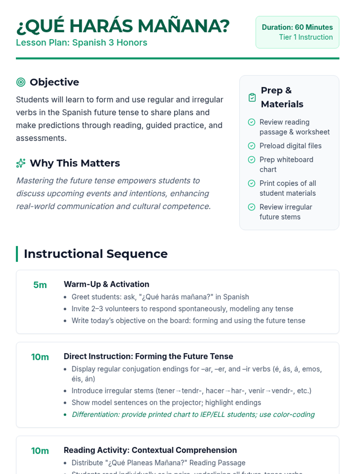 A 60-minute Spanish 3 Honors lesson focusing on regular and irregular future tense verbs through reading, practice, and assessment. Students will learn to articulate future plans and predictions confidently.