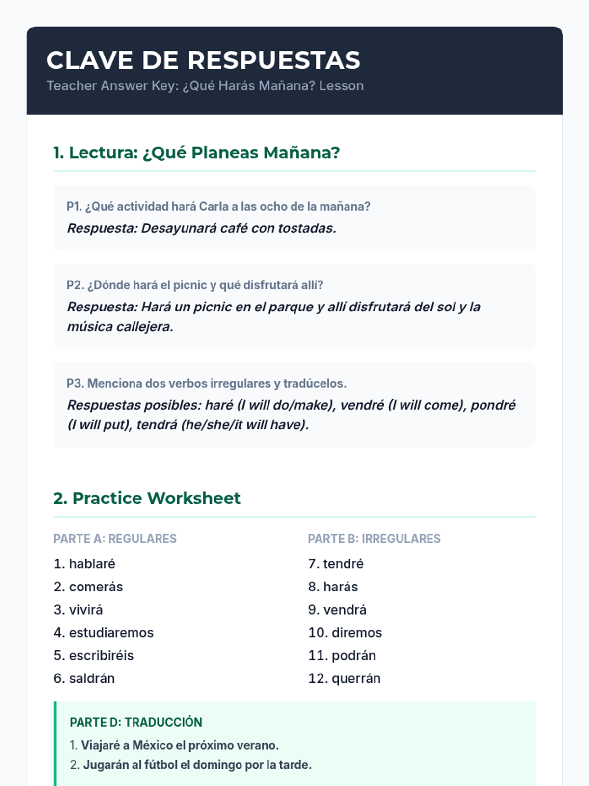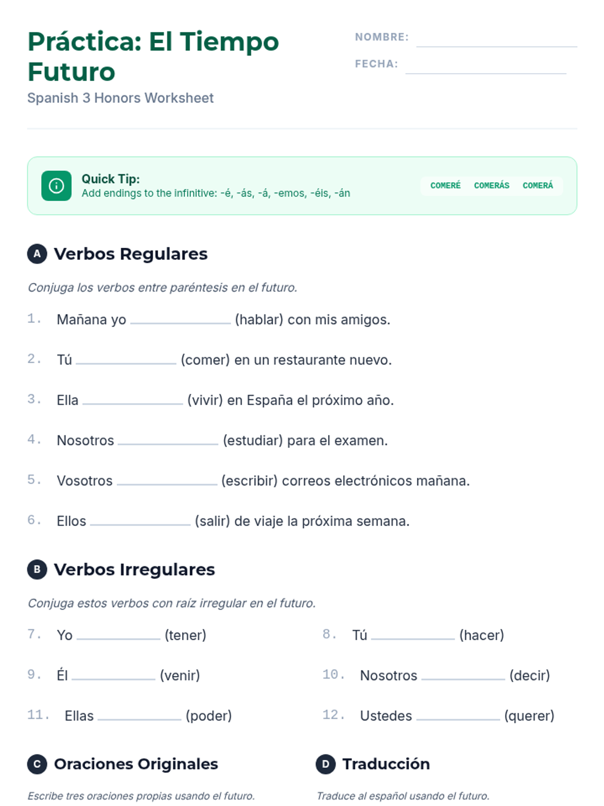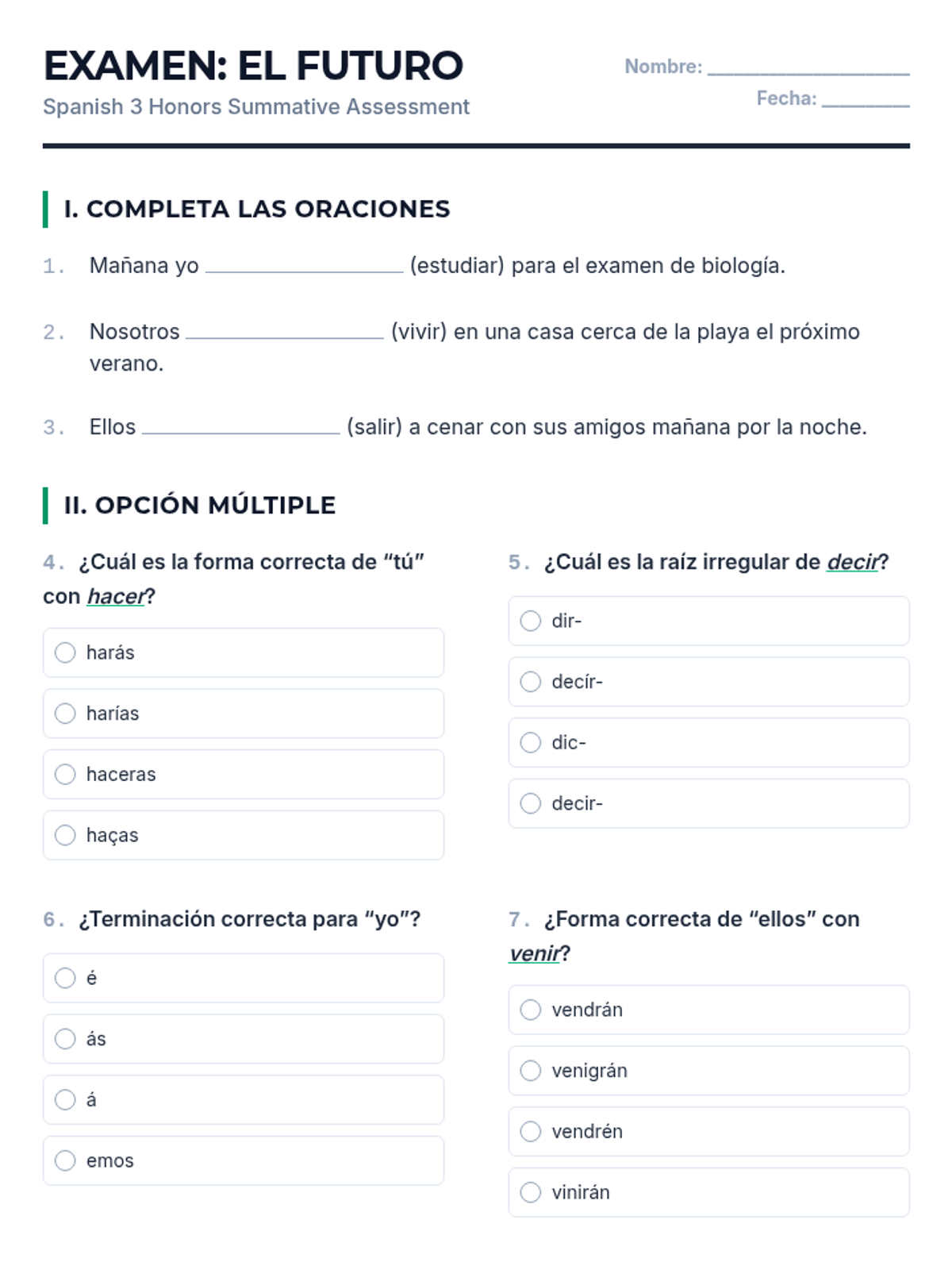 A 60-minute Spanish 3 Honors lesson focusing on regular and irregular future tense verbs through reading, practice, and assessment. Students will learn to articulate future plans and predictions confidently.