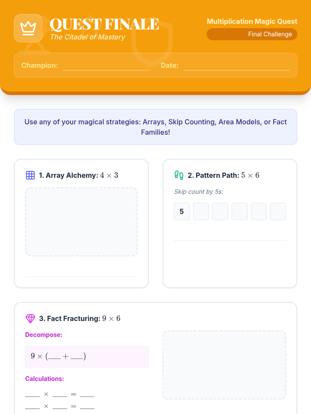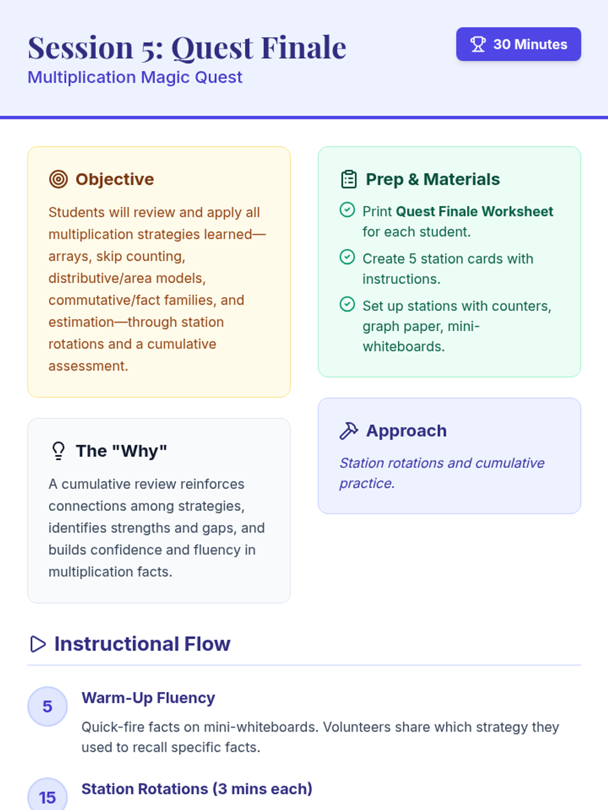 A cumulative review reinforcing connections among strategies, identifying strengths and gaps, and building confidence and fluency in multiplication facts through station rotations and assessment.