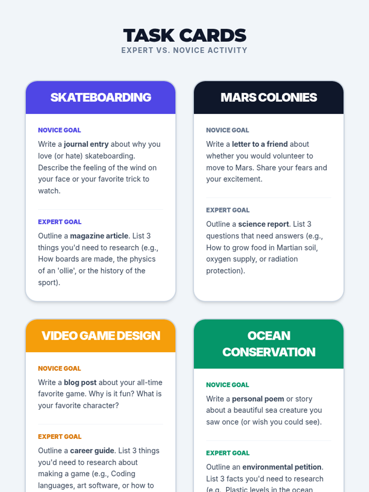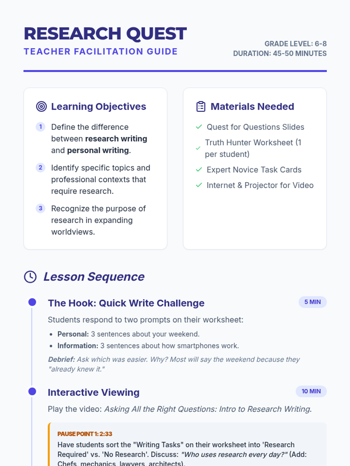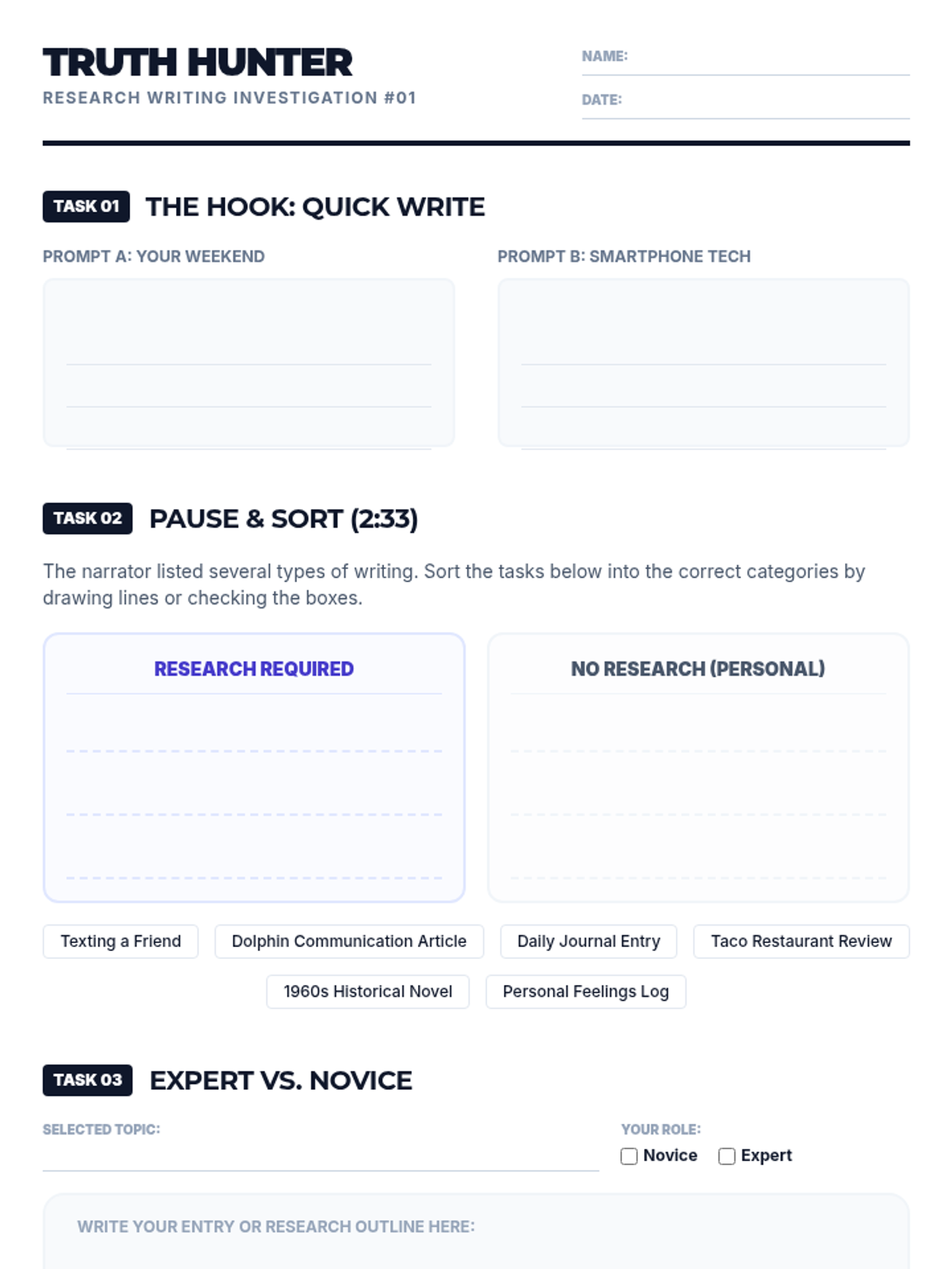 An introductory lesson on research writing where students distinguish between personal expression and information-gathering, featuring a video-guided sorting activity and a creative 'Expert vs. Novice' writing task.