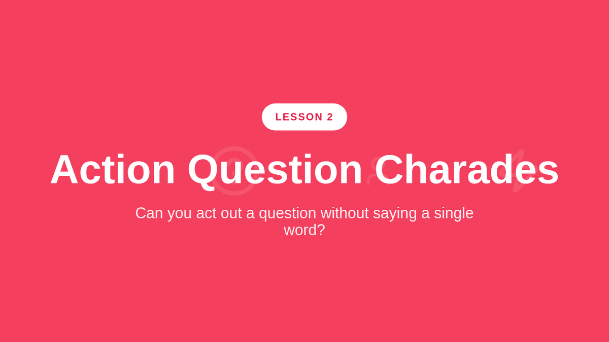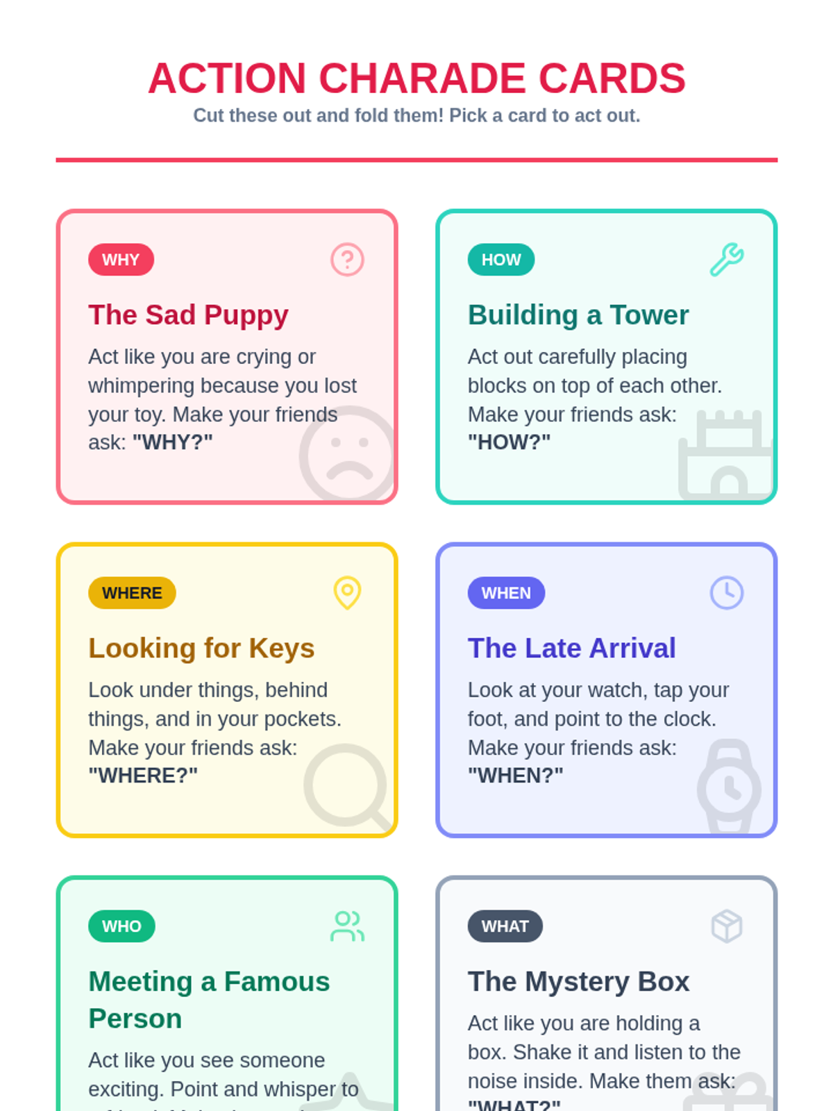 Students act out scenarios requiring specific question words, linking physical context and non-verbal communication to interrogative vocabulary.