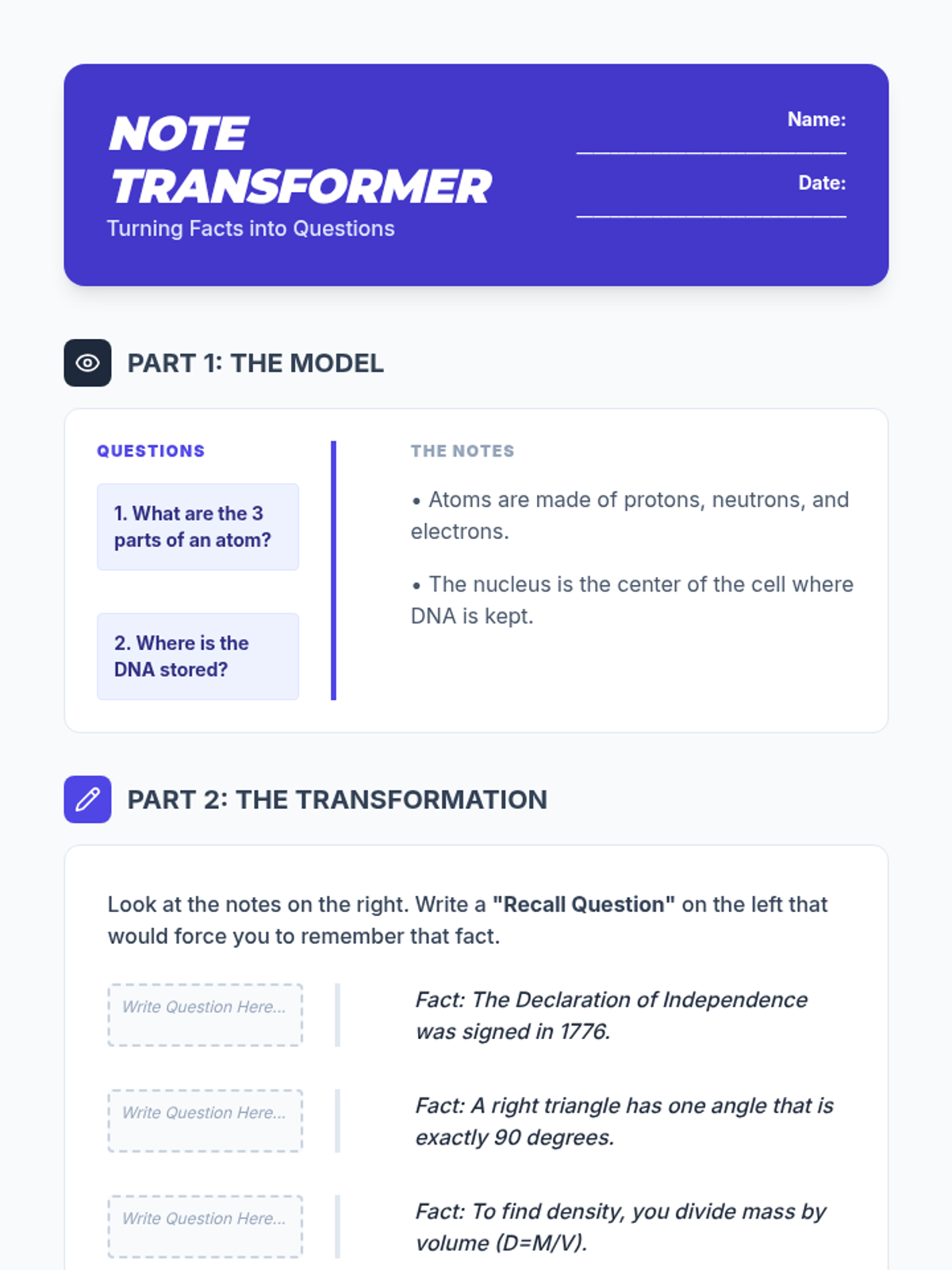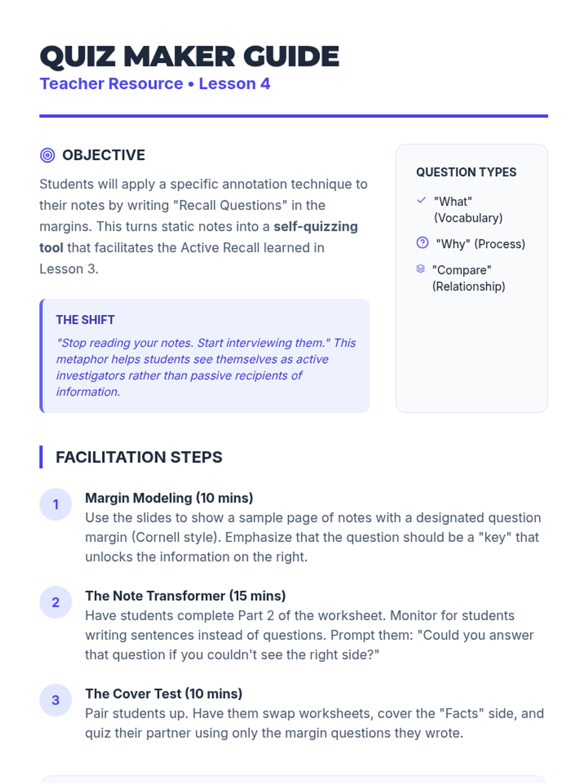 Students learn how to annotate notes with questions, transforming their static pages into dynamic self-quizzing tools.