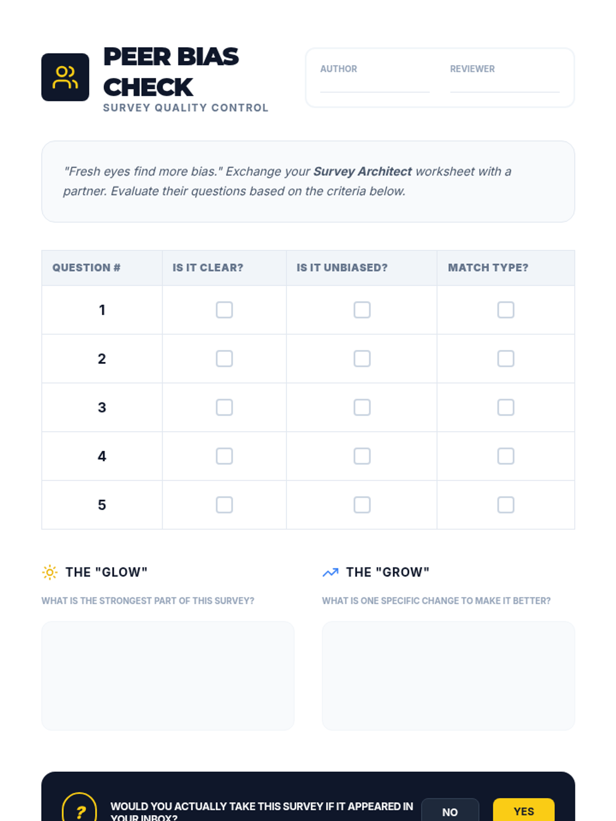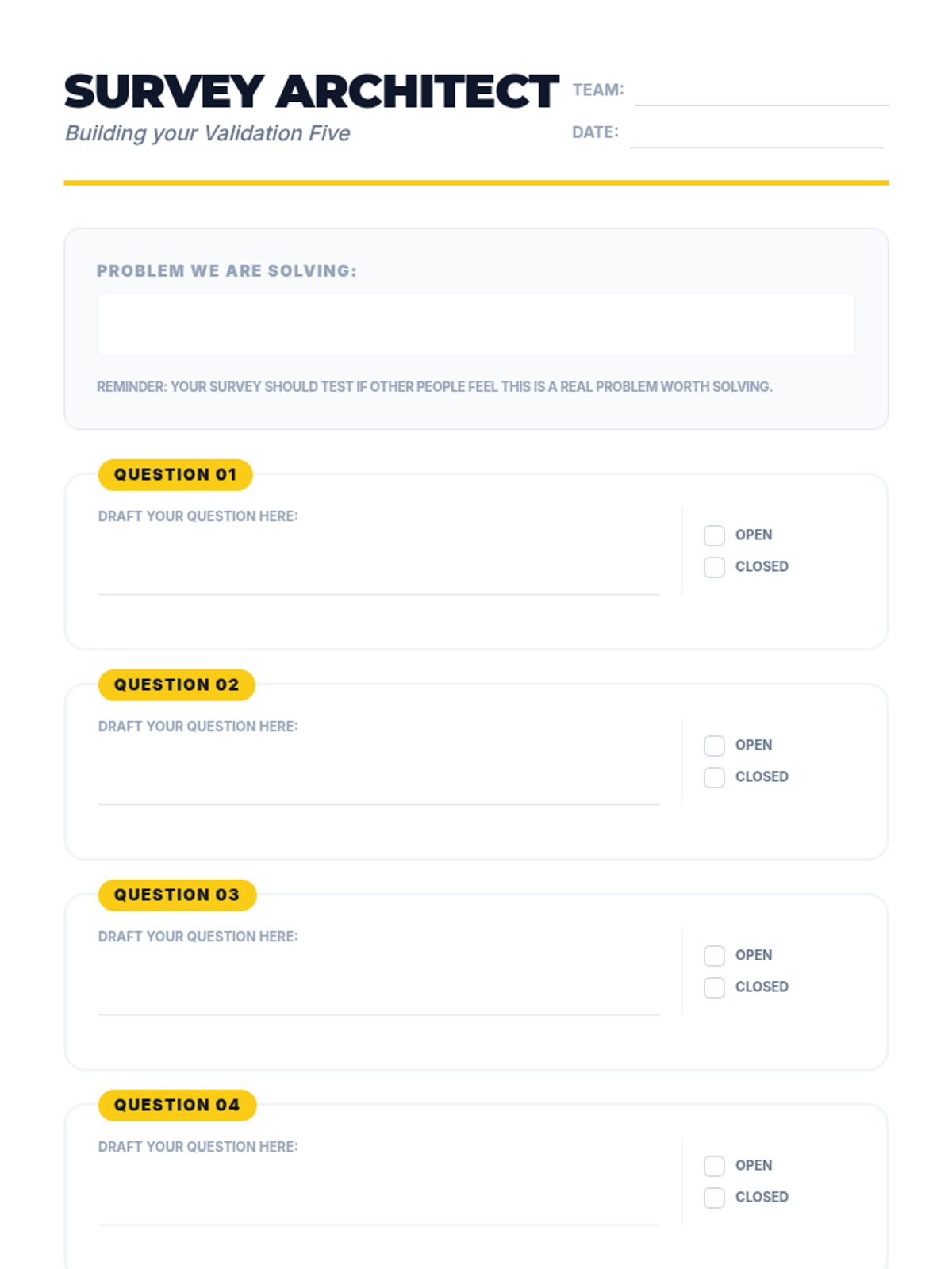 Students study the difference between open-ended and closed questions and learn how to avoid leading questions that bias results. They draft a 5-question digital survey intended to validate their specific problem and solution.