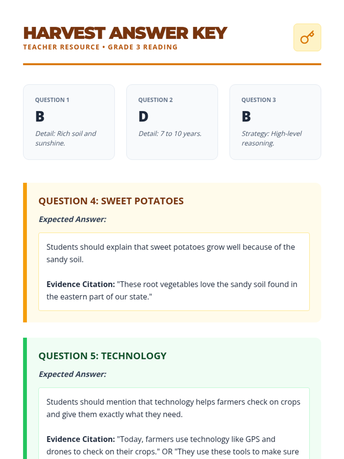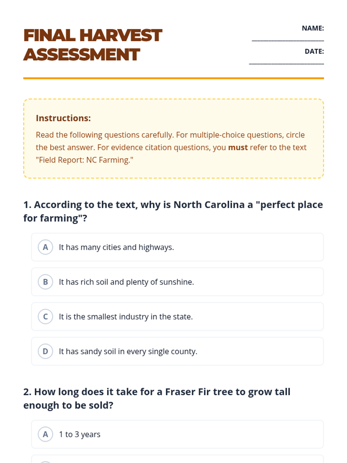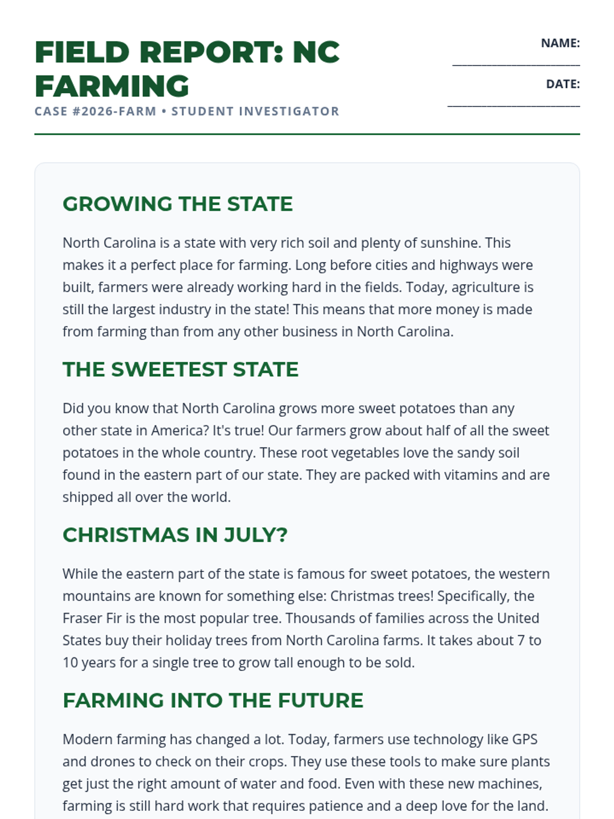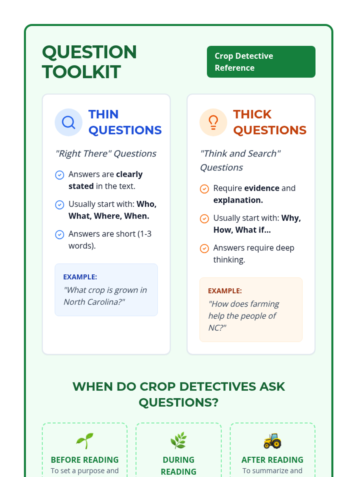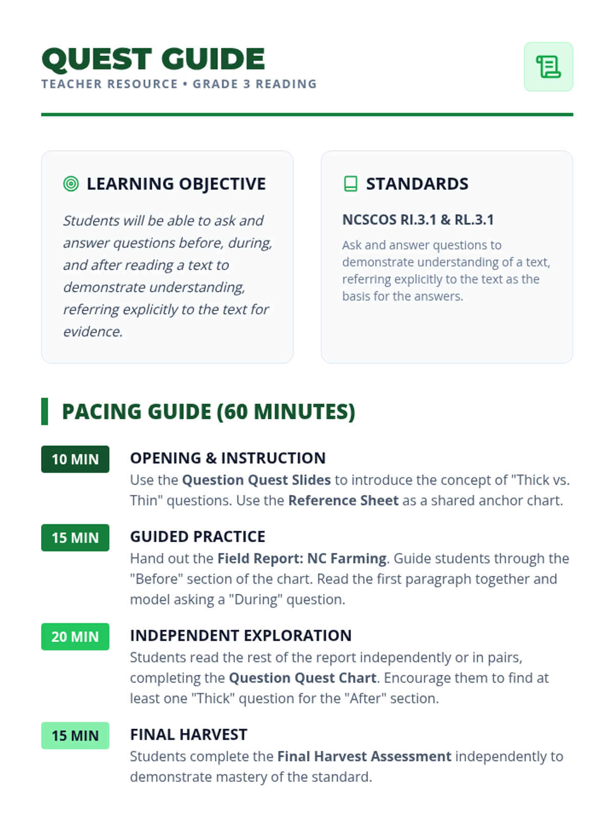 A Grade 3 reading lesson focused on NCSCOS RI.3.1 and RL.3.1, where students learn to ask and answer questions before, during, and after reading using an informational text about North Carolina farming.