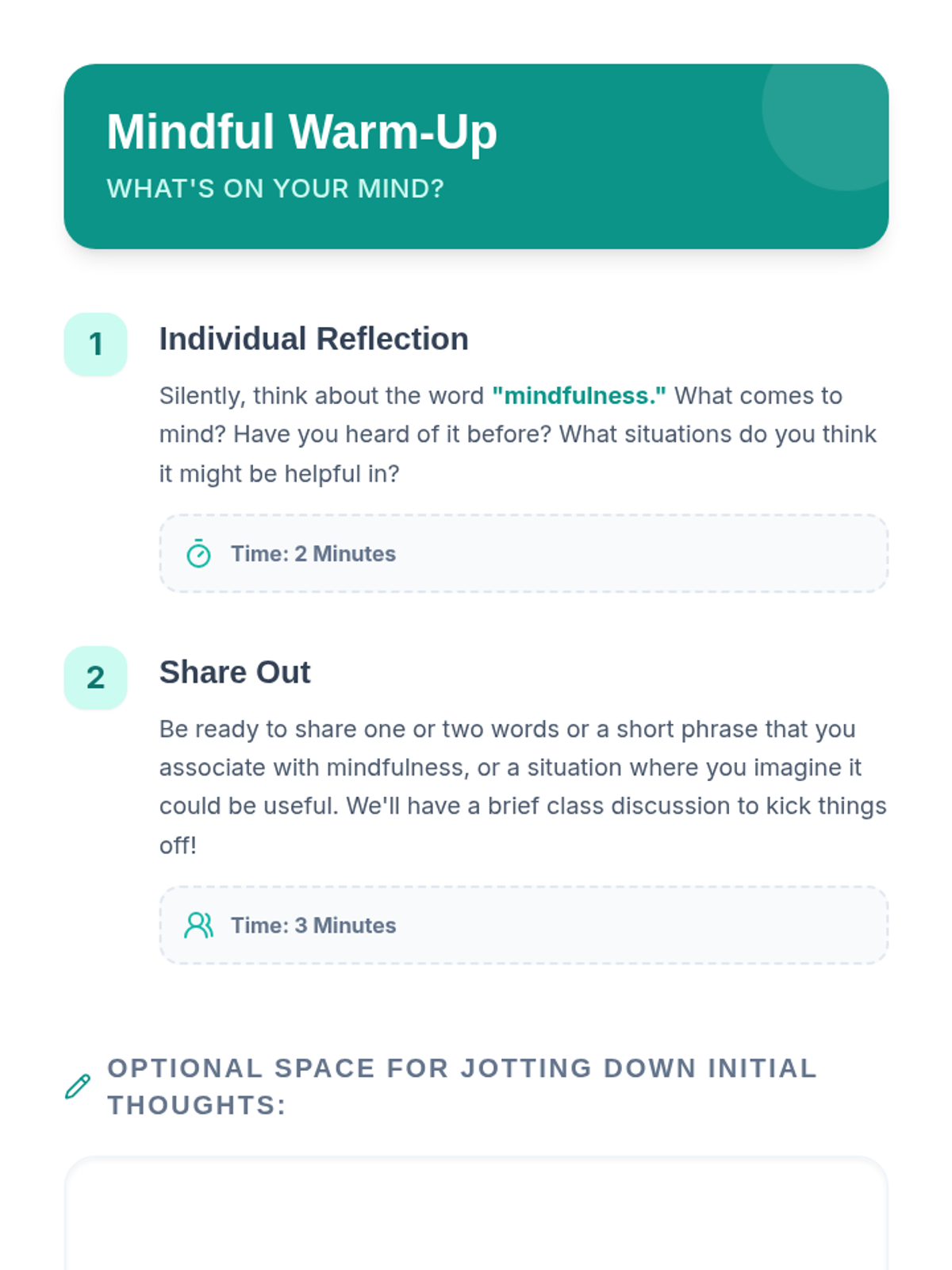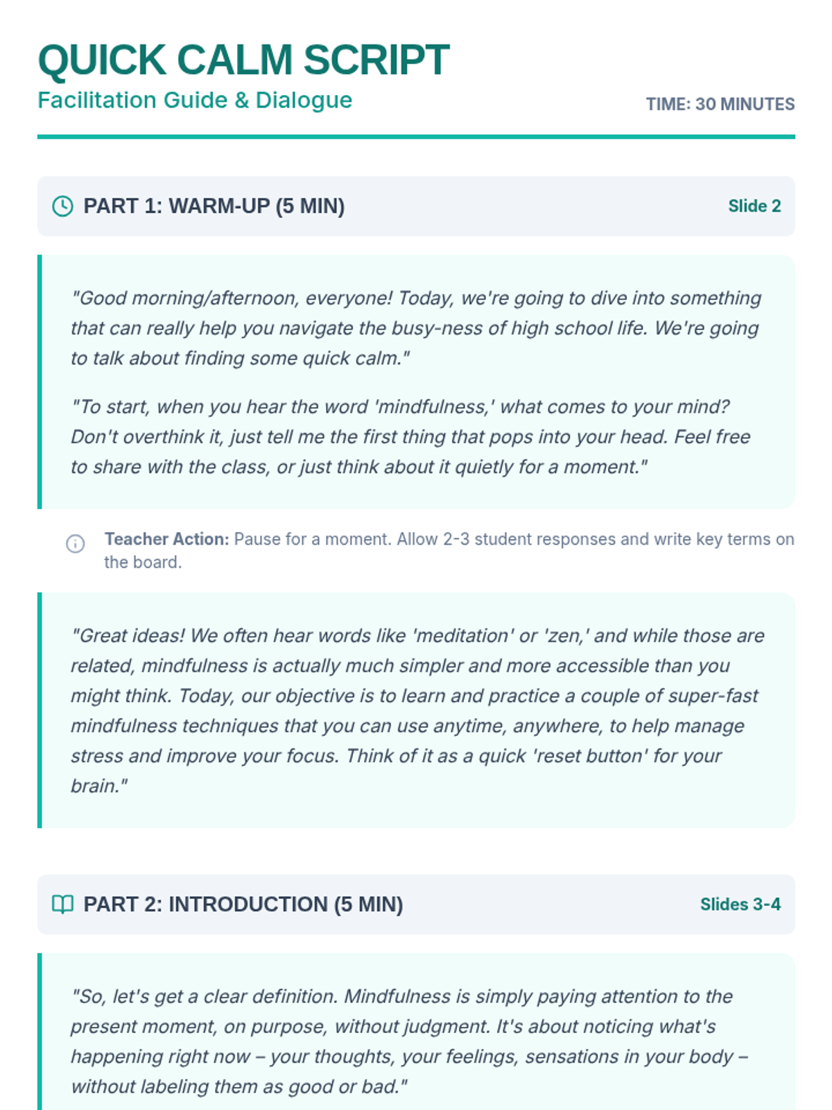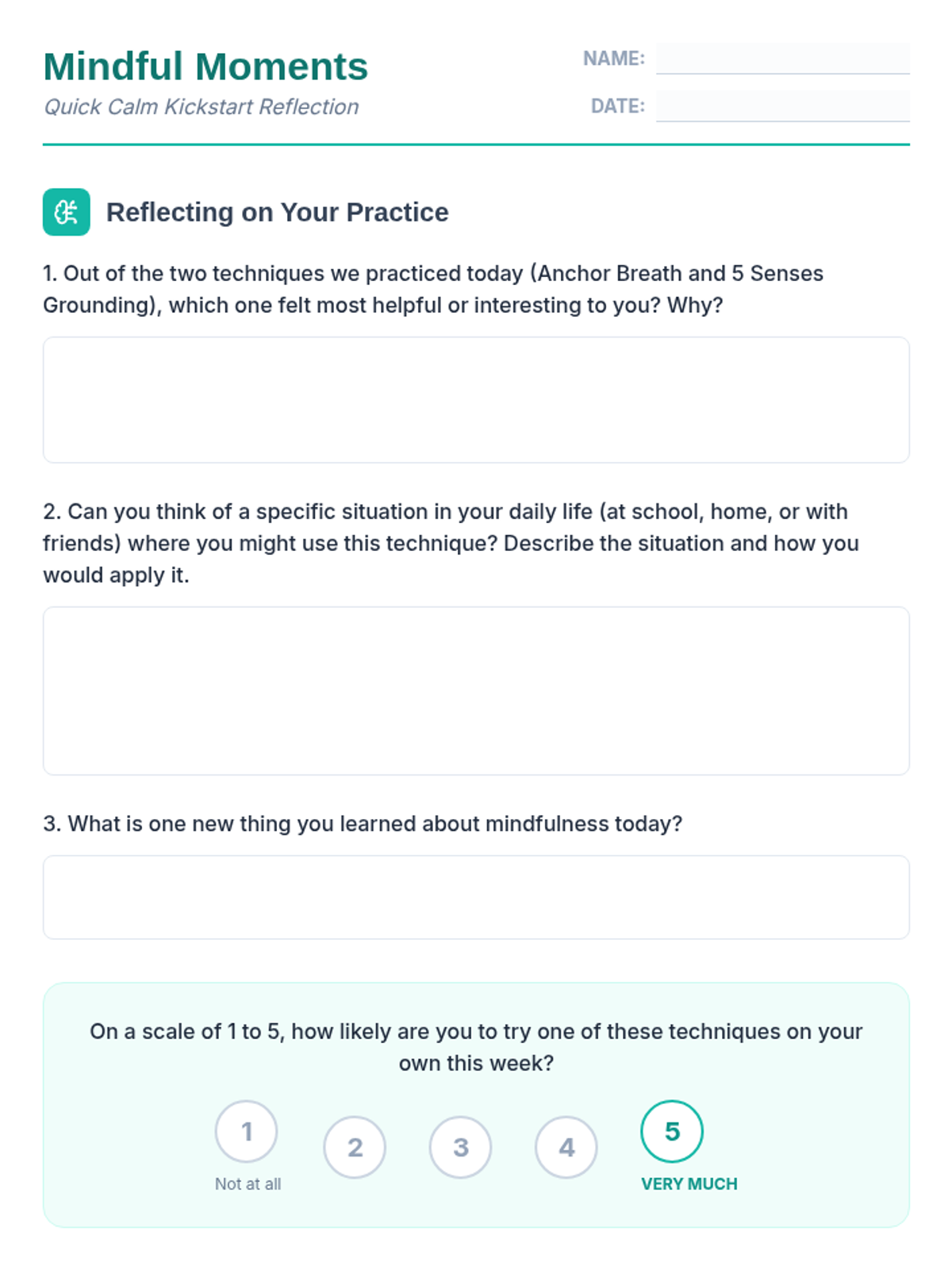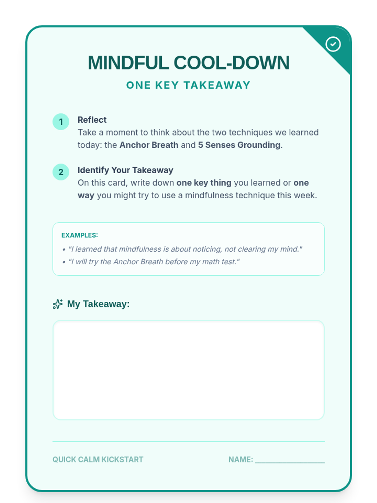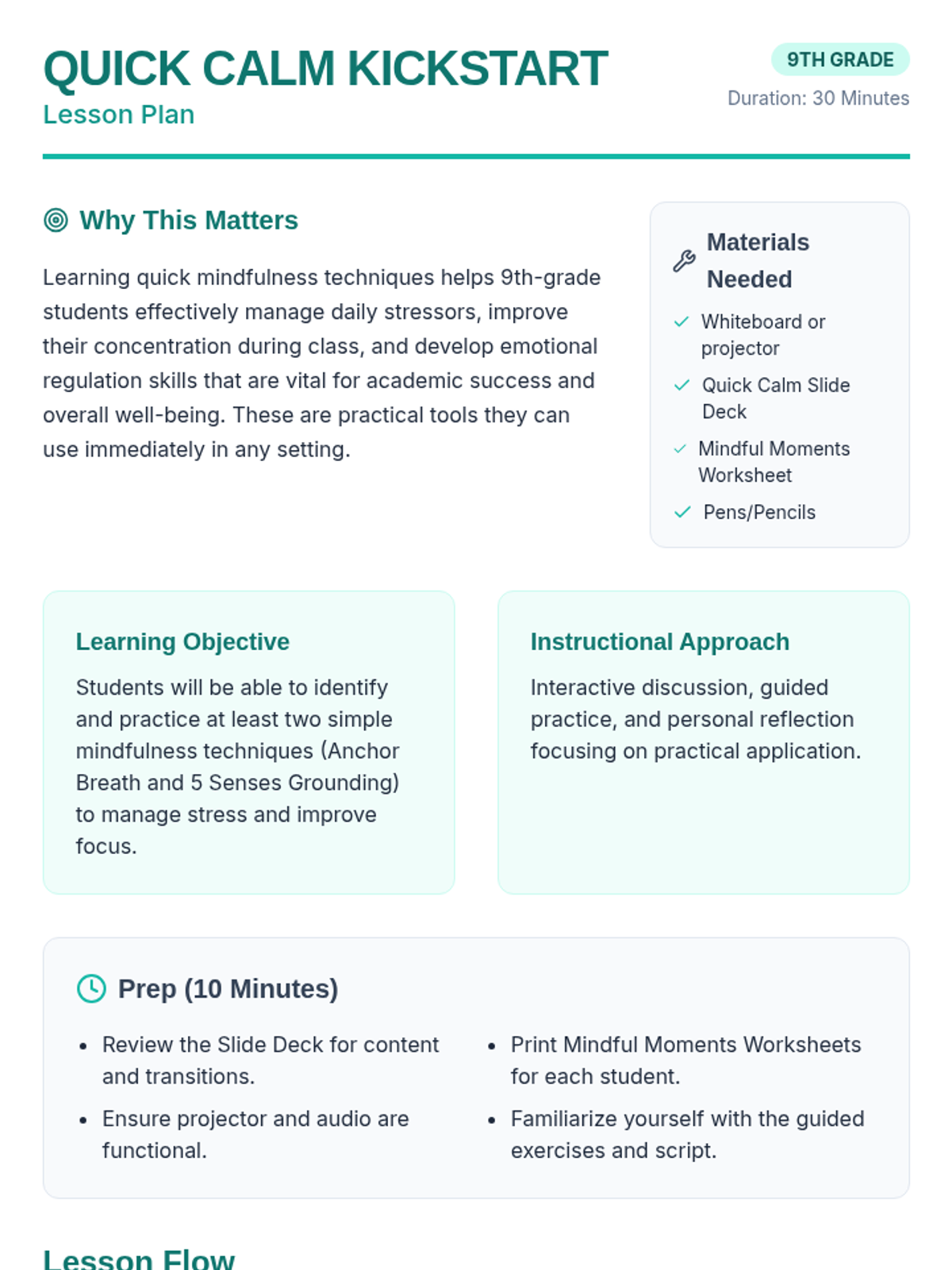 A 30-minute introductory lesson for 9th graders on quick mindfulness techniques like Anchor Breath and 5 Senses Grounding to manage stress and improve focus.