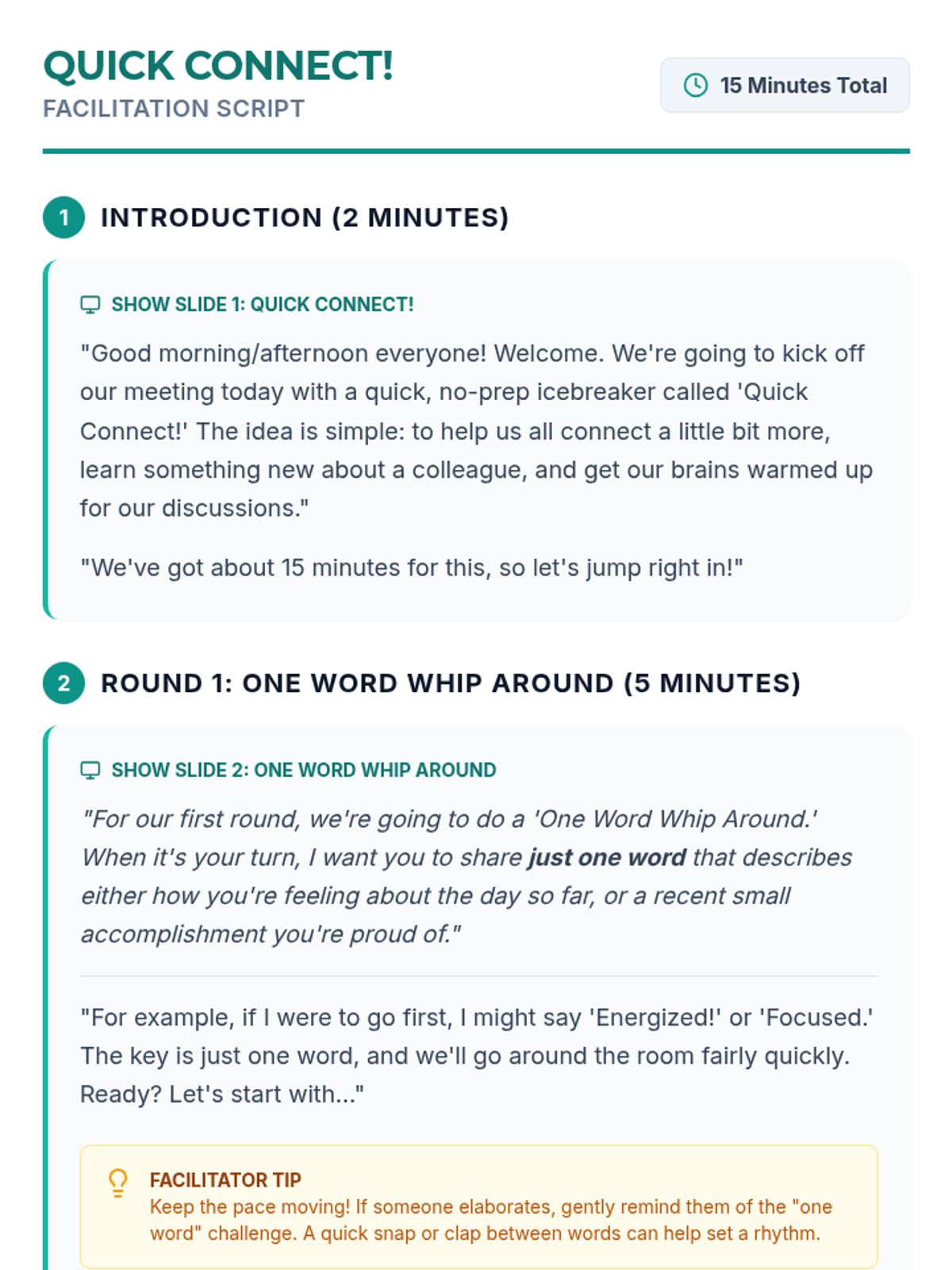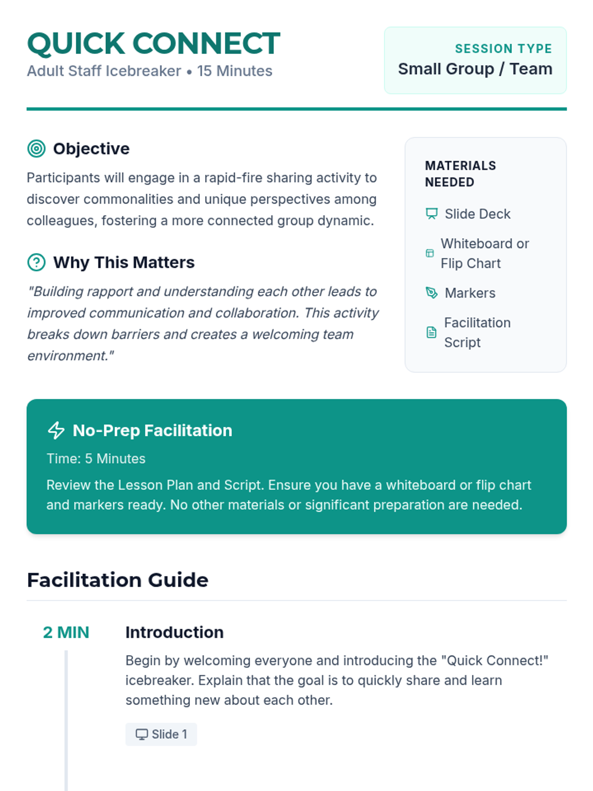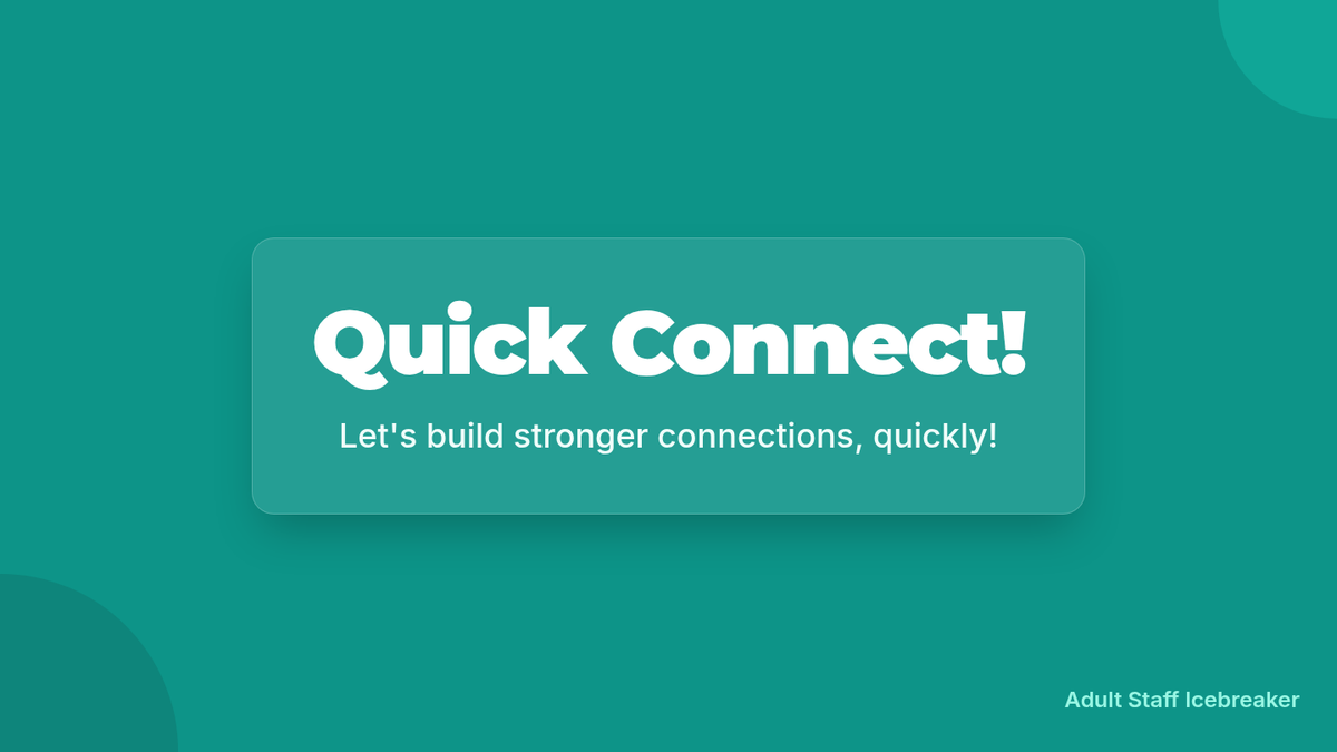 A quick, 15-minute icebreaker designed for adult staff to build rapport, discover commonalities, and foster team cohesion through rapid-fire sharing rounds.